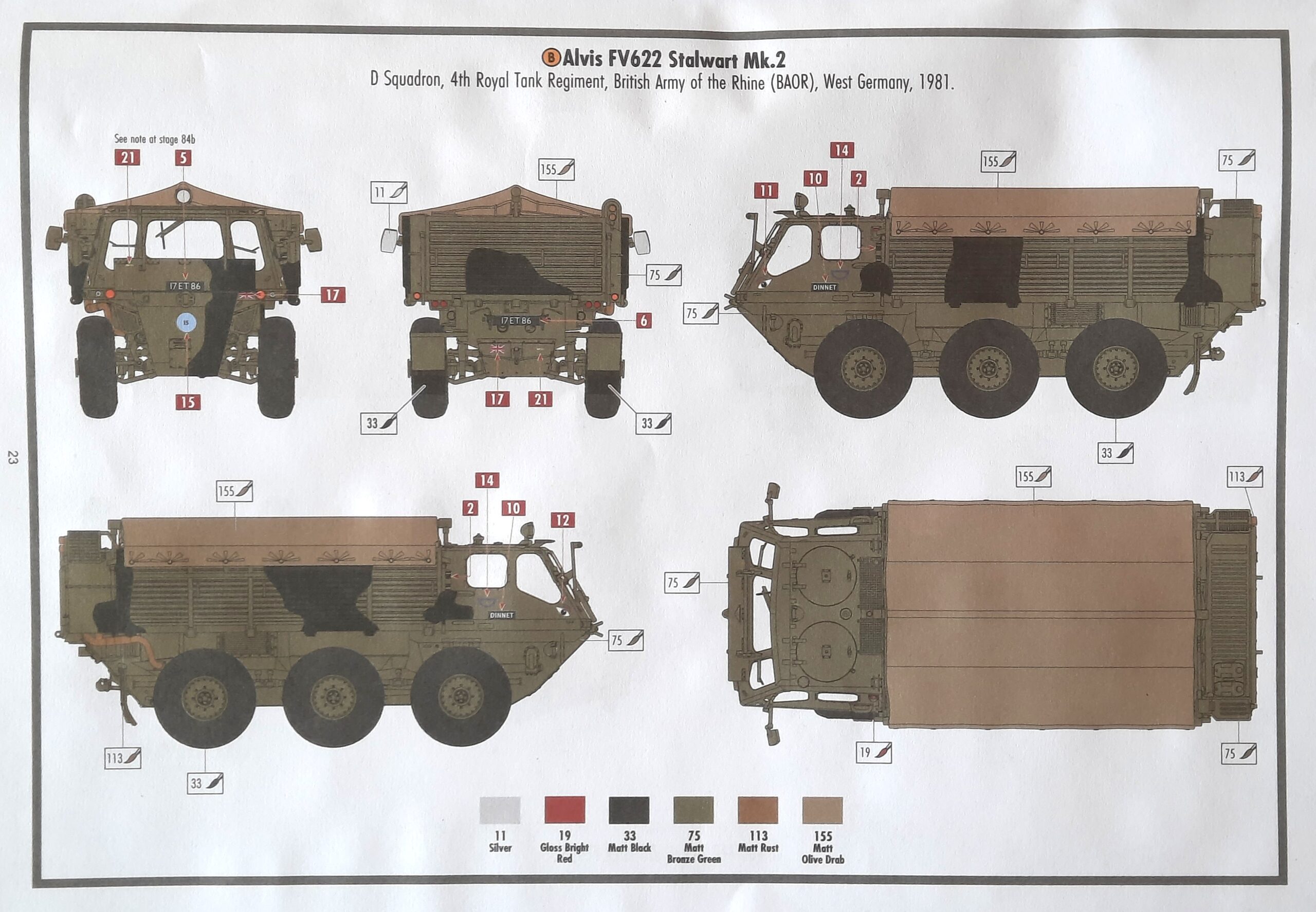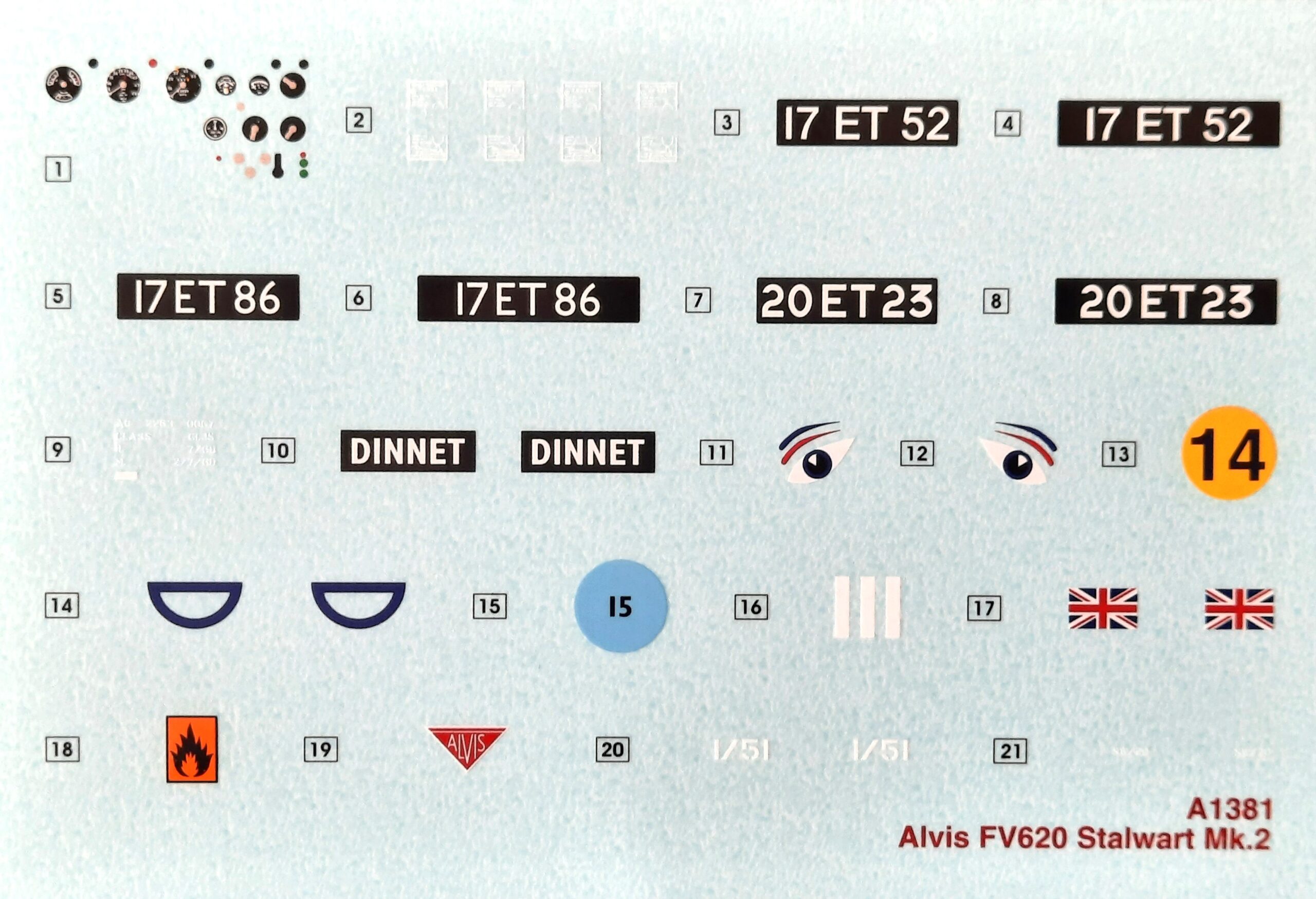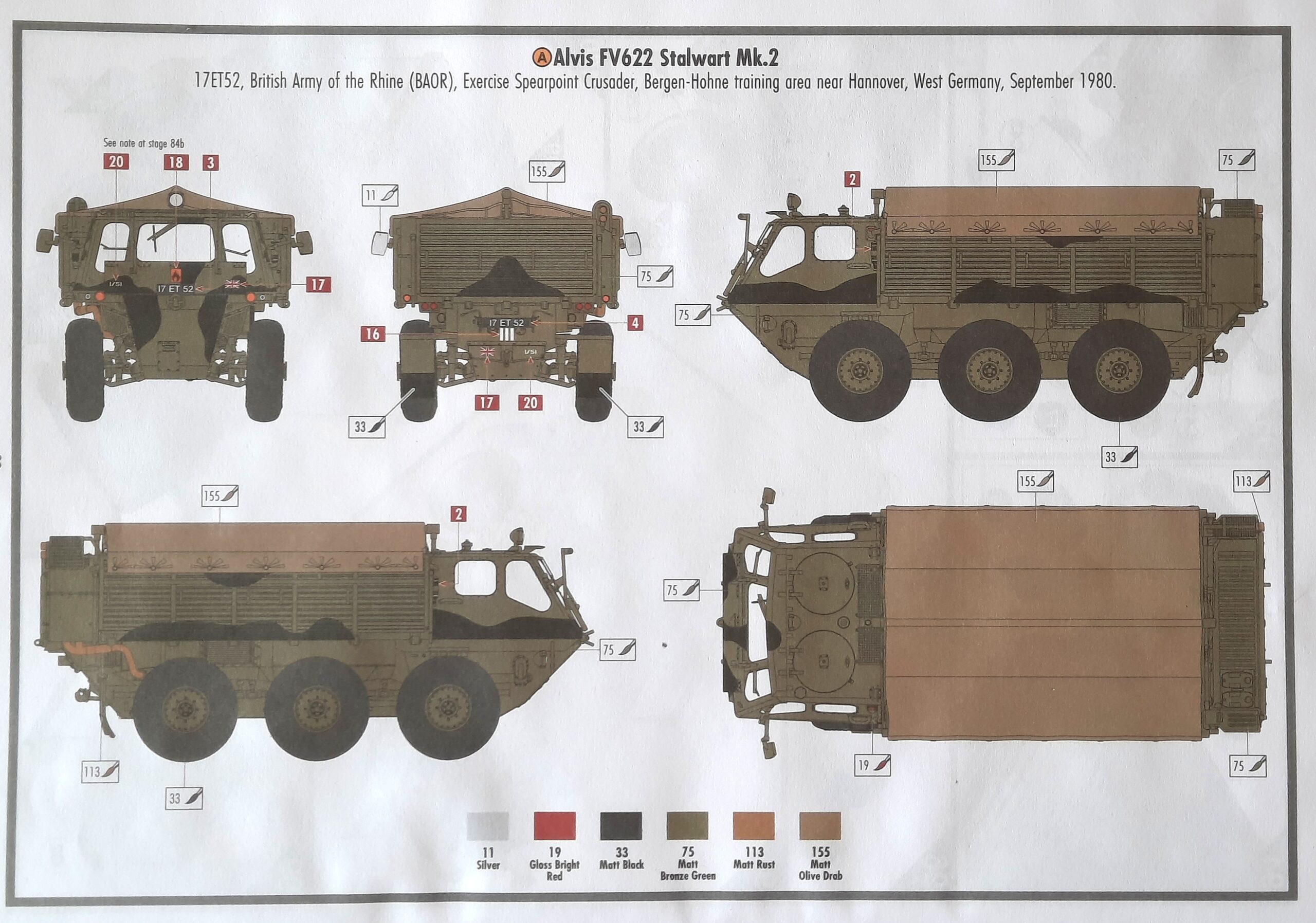 Der Stalwart fällt bei erster Betrachtung stimmig auf, doch tun sich schon einige Kritikpunkte auf. Die verwendete Materialstärke des Aufbaus kommt teilweise der Panzerung eines Sherman-Panzers gleich. Auch hat man bei einigen Teilen das Gefühl eine Modellbauzeitreise in die 80er Jahre zu machen. Vereinfachte Darstellungen, teilweise etwas klobiges Aussehen. Dazu fällt speziell die etwas seltsam aussehende „Schippe“auf. Die Inneneinrichtung fällt teilweise etwas rudimentär aus, aber soweit ist alles Wichtige vorhanden. Funktechnisch ist der Stalwart ausgerüstet mit dem Clansman-System. Bei dem Bauteil E12 könnte es sich um einen Transmitter Receiver UK/RT353 handeln. Das Fahrwerk ist korrekt und erfreulicher Weise detailreich wiedergegeben. Die dazugehörige Bereifung verfügt über eine Goodyear-Beschriftung an den Flanken. Die Detaillierung des Verdeckes fällt bei der abschließenden Betrachtung einfach aus. Hier hätte man Punkte gutmachen können.