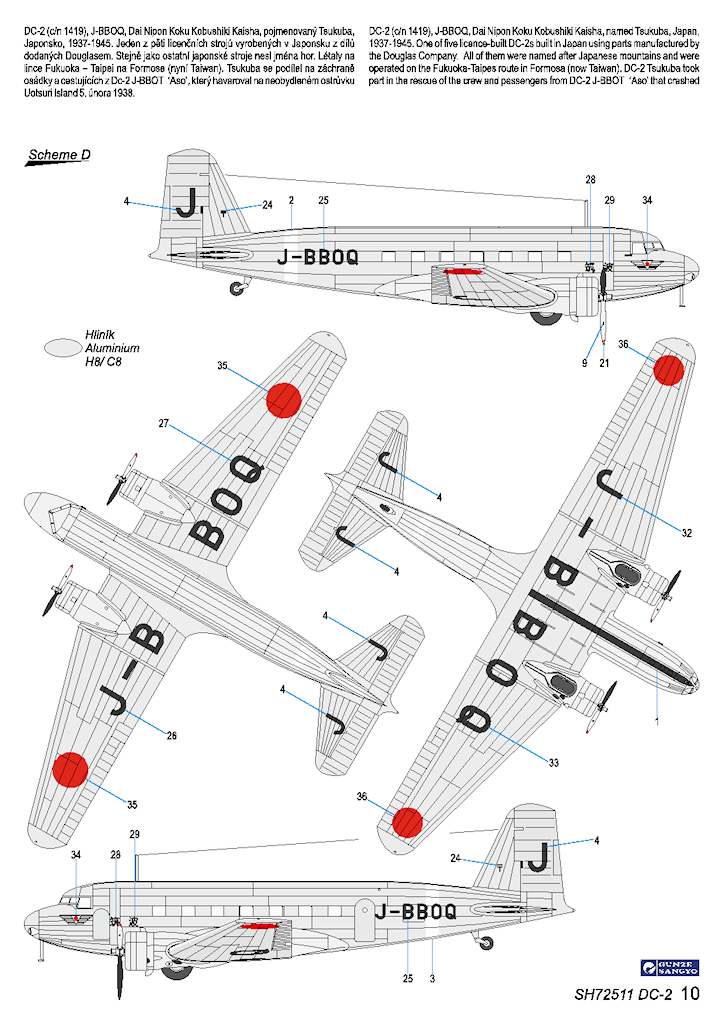 - DC-2, c/n 1419, J-BBOQ, Eigenname Tschukuba, eine von fünf in Bauteilen von Douglas gelieferten Exemplaren, Japan;