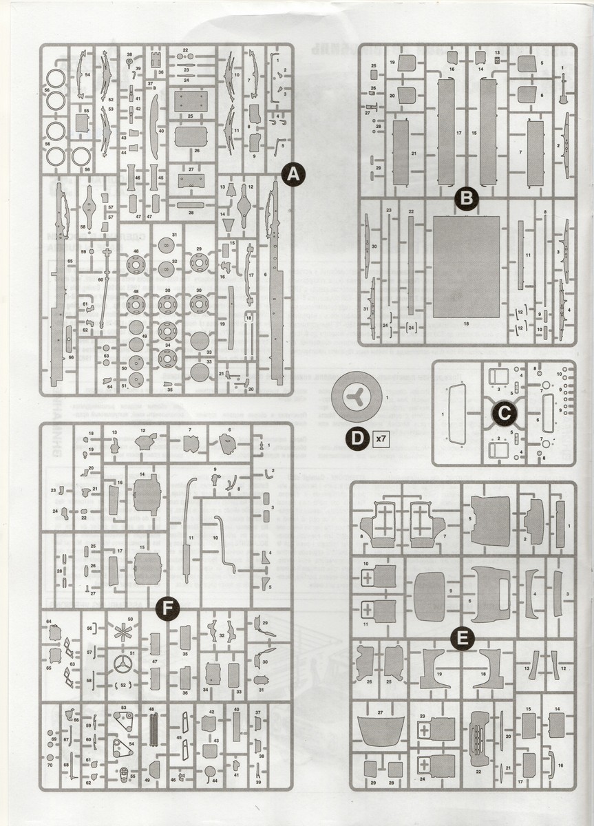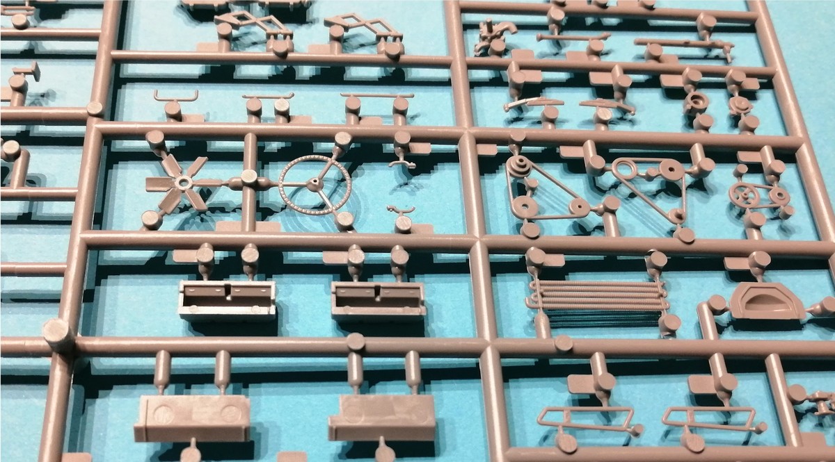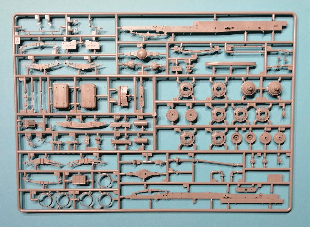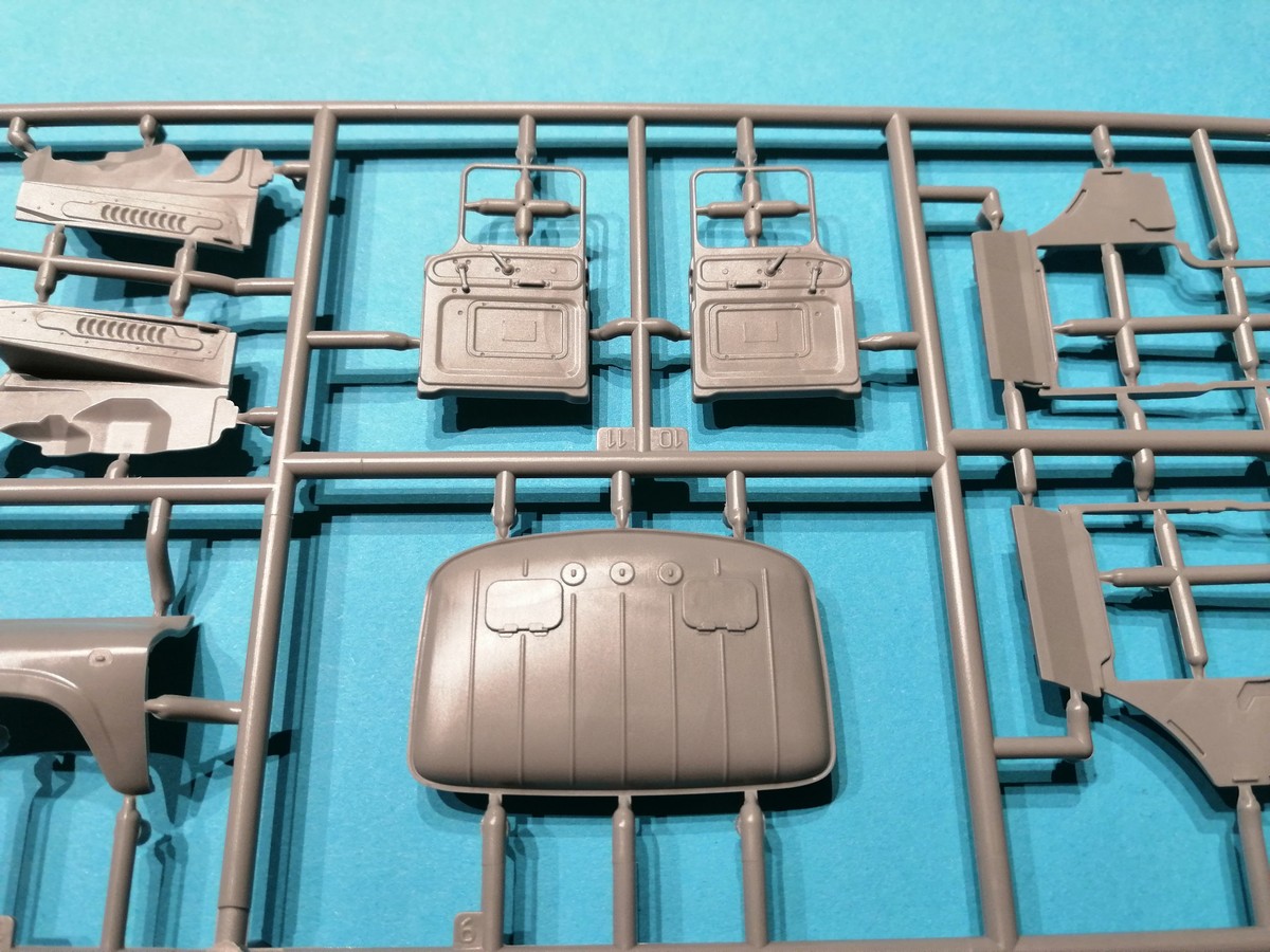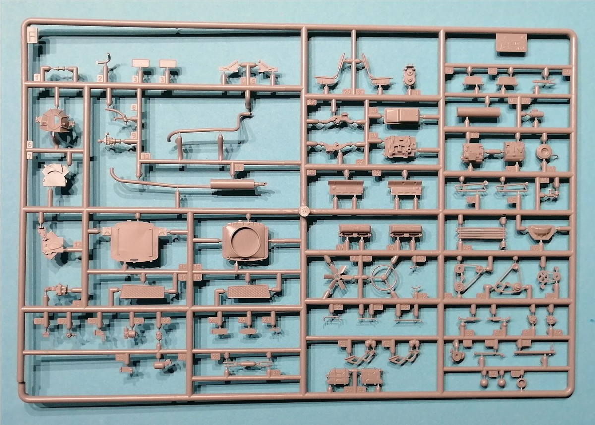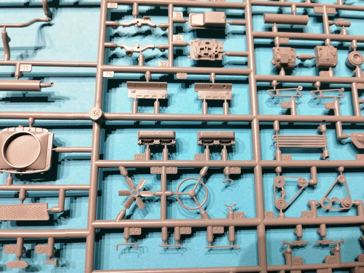 Der Bau startet mit dem V8 Motor, welcher sich bereits sehr detailliert zeigt nur aus dem Kasten heraus. Im Vergleich mit Bildern von Originalen müssen höchstens noch ein paar Leitungen aus Draht ergänzt werden. Damit man später auch noch diese Arbeit sehen kann, bietet der Bausatz die Möglichkeit, die Motorhaube geöffnet darzustellen. Der nächste Abschnitt widmet sich dem Fahrerhaus. Dieses entsteht aus vielen Teilen und zeigt alle wesentlichen Details. Für die Darstellung des Instrumentenbretts gibt es ein Decal. Das Dach ist ein Einzelteil und ist die Ausführung mit zwei Dachluken und drei Positionslampen. Die Türen, welche aus drei Teilen in Sandwichbauweise entstehen, können auch wieder geöffnet oder geschlossen angebaut werden.