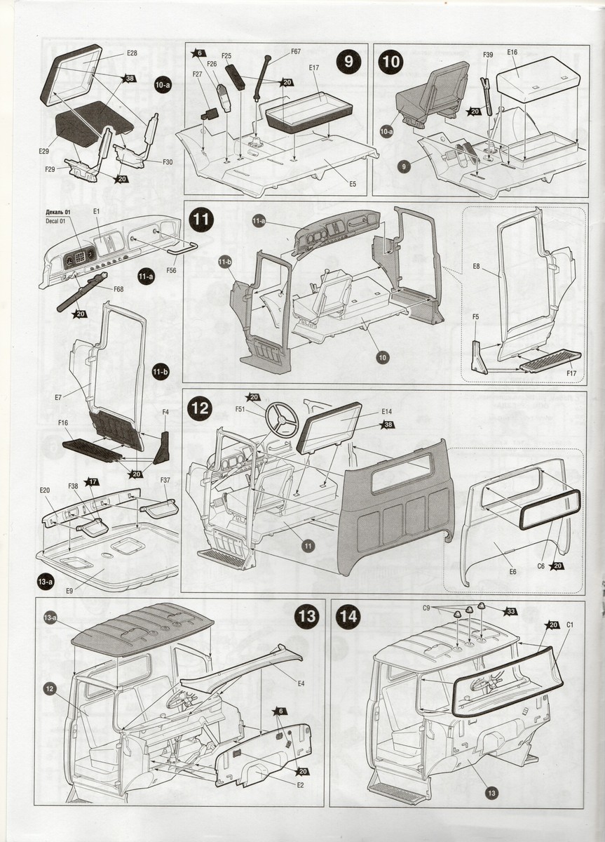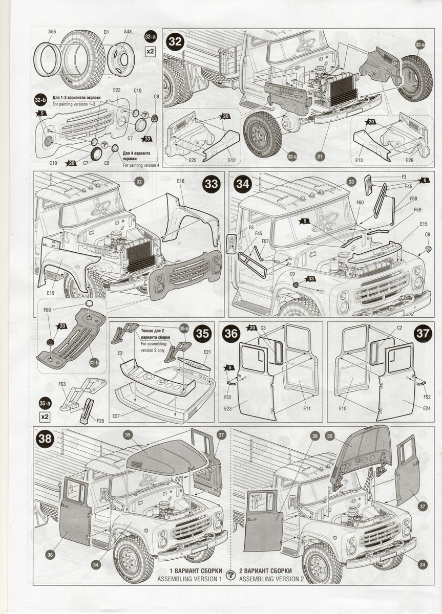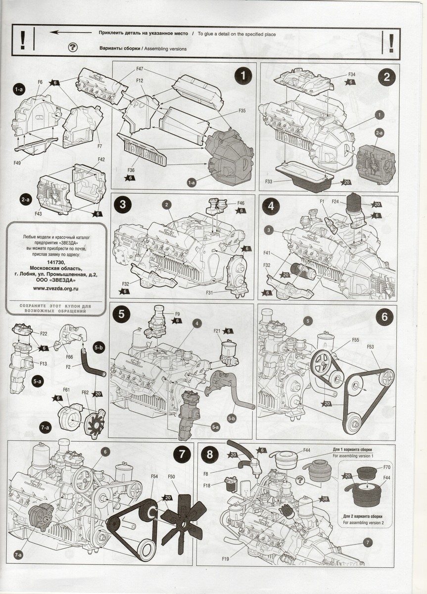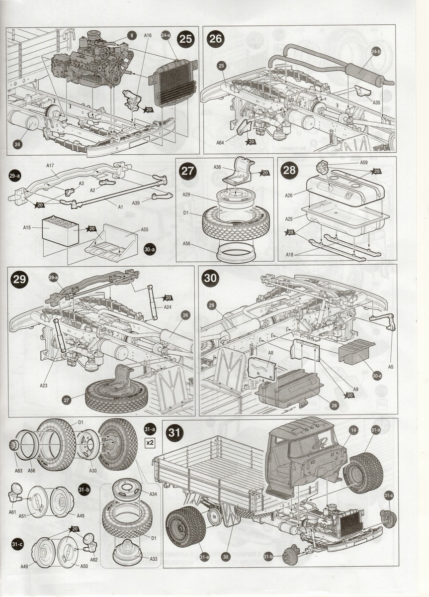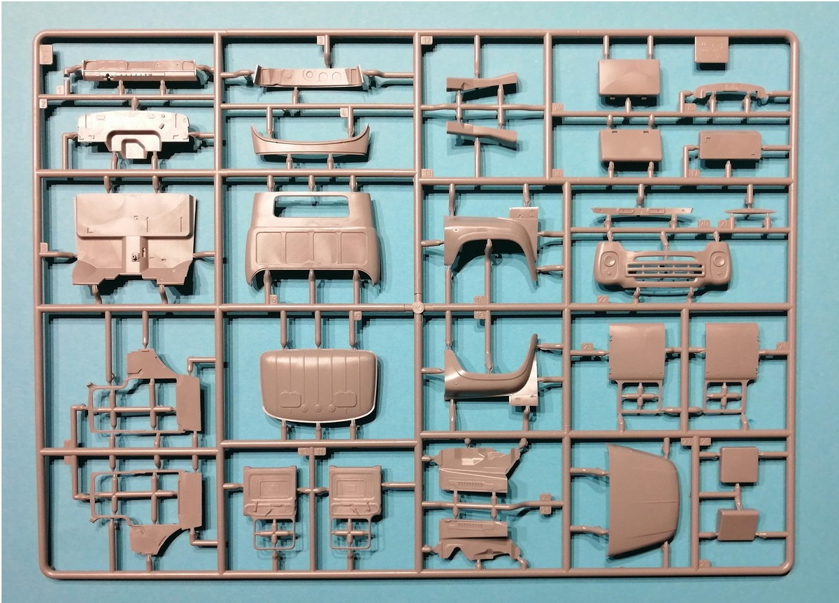 Der Bau startet mit dem V8 Motor, welcher sich bereits sehr detailliert zeigt nur aus dem Kasten heraus. Im Vergleich mit Bildern von Originalen müssen höchstens noch ein paar Leitungen aus Draht ergänzt werden. Damit man später auch noch diese Arbeit sehen kann, bietet der Bausatz die Möglichkeit, die Motorhaube geöffnet darzustellen. Der nächste Abschnitt widmet sich dem Fahrerhaus. Dieses entsteht aus vielen Teilen und zeigt alle wesentlichen Details. Für die Darstellung des Instrumentenbretts gibt es ein Decal. Das Dach ist ein Einzelteil und ist die Ausführung mit zwei Dachluken und drei Positionslampen. Die Türen, welche aus drei Teilen in Sandwichbauweise entstehen, können auch wieder geöffnet oder geschlossen angebaut werden.