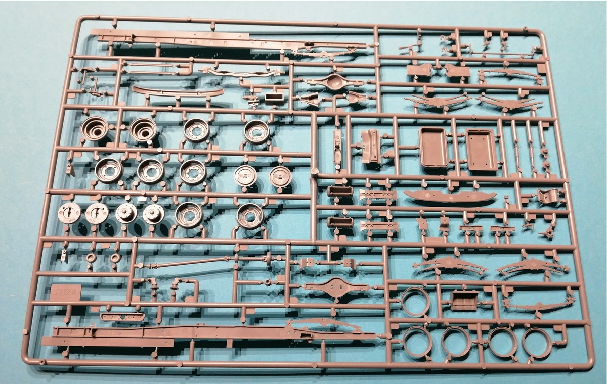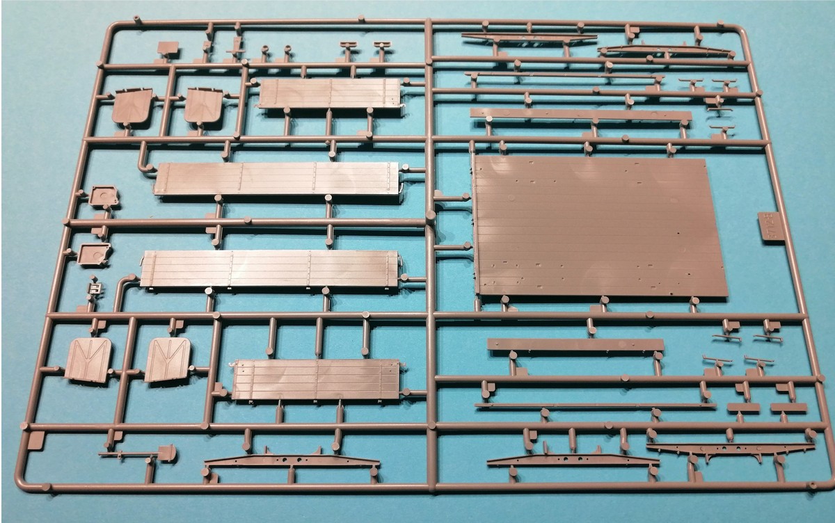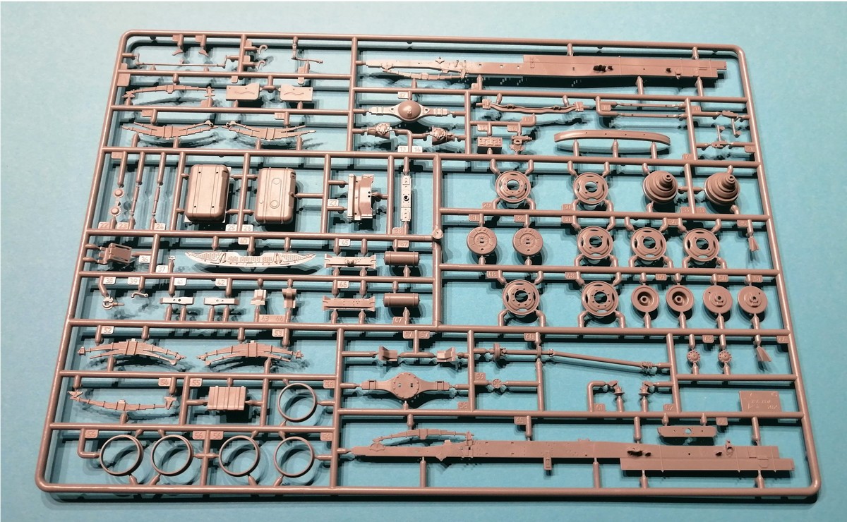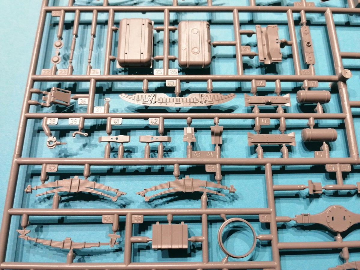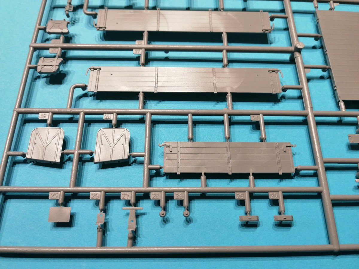 Der Pritschenaufbau, welcher in der Entstehung des Modells den nächsten Abschnitt bildet, lässt etwas Kritik zu bzgl. der etwas zu gleichförmigen Darstellung der Holzbohlen. Hier könnten die Modellbauenden mit passenden Werkzeugen versuchen, etwas mehr Struktur zu erzeugen. Dies gilt auch für die Darstellung von geöffneten Ladebordwänden, welche Zvezda so zunächst nicht anbietet lt. Bauanleitung. Das Rückgrat des Fahrzeugs, sprich der Hauptrahmen entsteht klassisch für einen LKW-Bausatz aus mehreren Teilen. Etwas ungewöhnlich ist dabei die Aufteilung der Blattfederpakete in jeweils zwei Hälften. Hier könnte etwas diffizile Versäuberungsarbeit anfallen. Positiv ist dabei, das Auswerfermarkierungen aber dadurch nur auf den Klebeflächen zu finden sind.