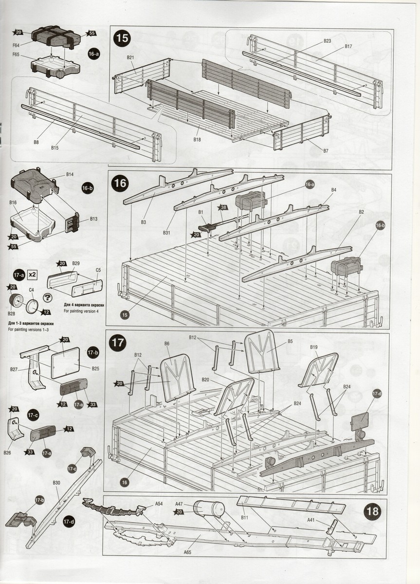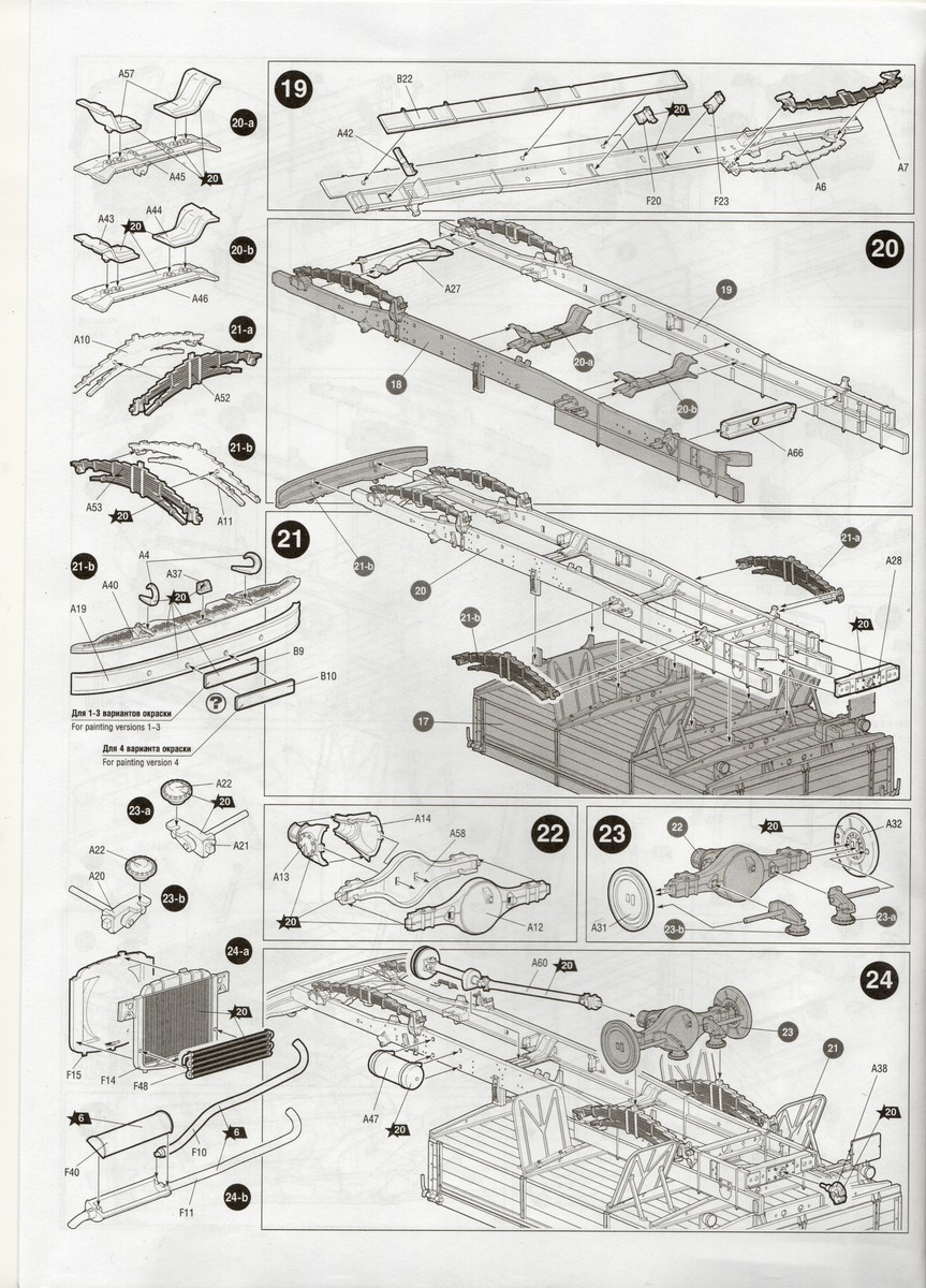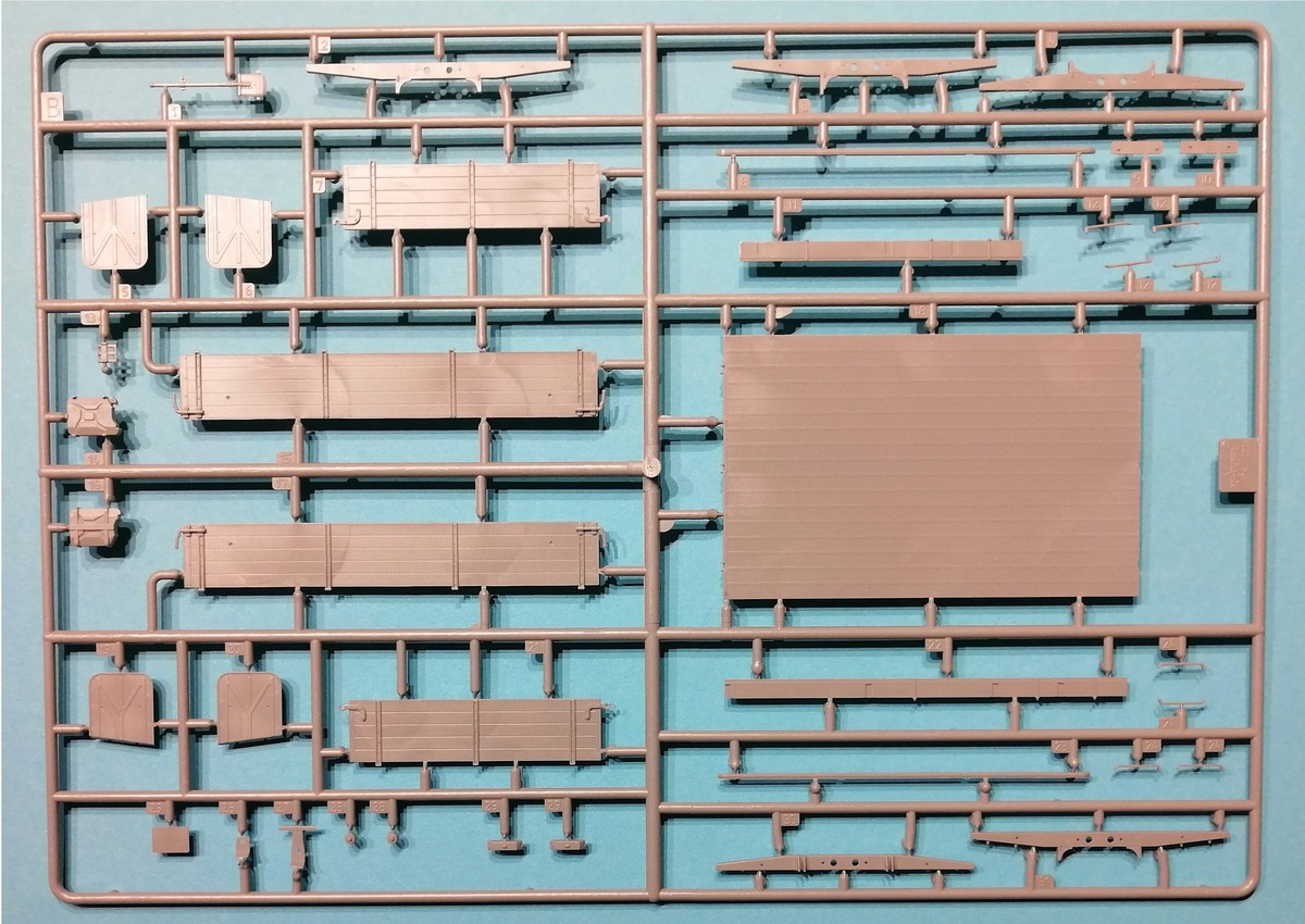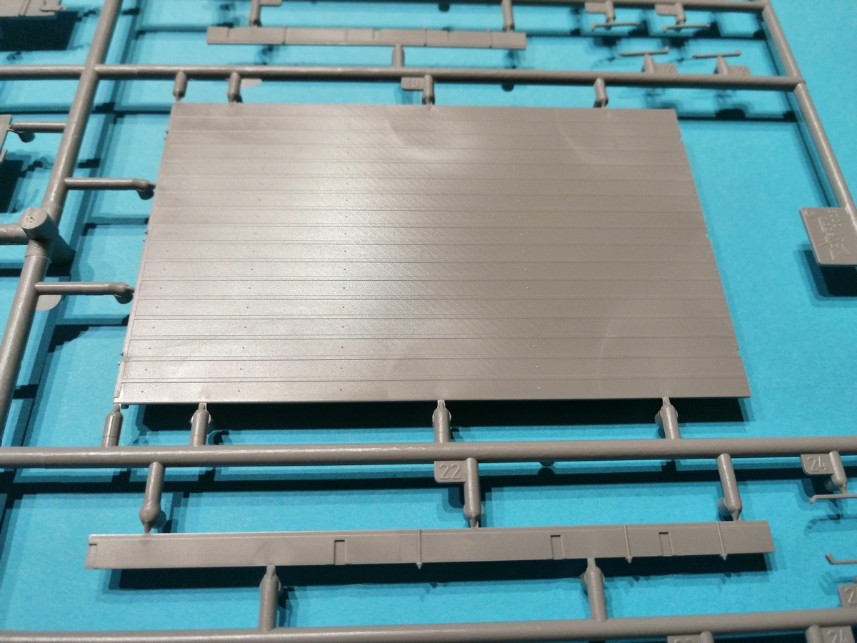 Der Pritschenaufbau, welcher in der Entstehung des Modells den nächsten Abschnitt bildet, lässt etwas Kritik zu bzgl. der etwas zu gleichförmigen Darstellung der Holzbohlen. Hier könnten die Modellbauenden mit passenden Werkzeugen versuchen, etwas mehr Struktur zu erzeugen. Dies gilt auch für die Darstellung von geöffneten Ladebordwänden, welche Zvezda so zunächst nicht anbietet lt. Bauanleitung. Das Rückgrat des Fahrzeugs, sprich der Hauptrahmen entsteht klassisch für einen LKW-Bausatz aus mehreren Teilen. Etwas ungewöhnlich ist dabei die Aufteilung der Blattfederpakete in jeweils zwei Hälften. Hier könnte etwas diffizile Versäuberungsarbeit anfallen. Positiv ist dabei, das Auswerfermarkierungen aber dadurch nur auf den Klebeflächen zu finden sind.