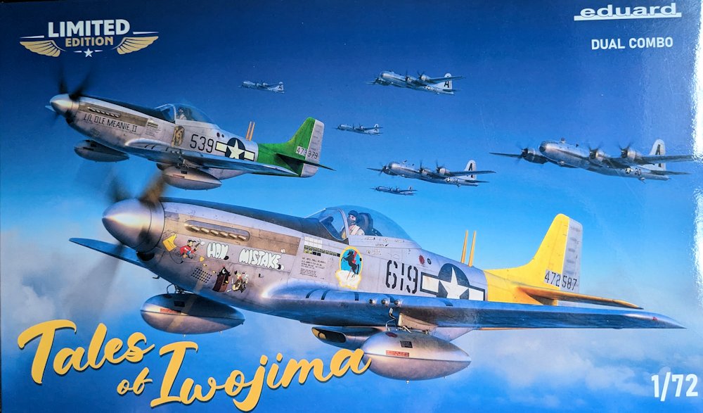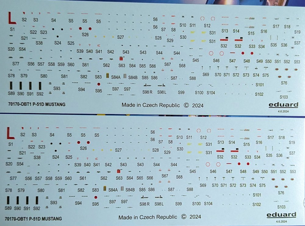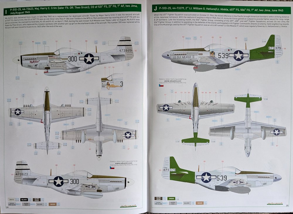 Ein großer, bei Eduard gedruckter Abziehbilderbogen liefert die Kennungen für 12 verschiedene P-51D, die im Sommer 1945 auf Iwojima stationiert waren. Auf zwei weiteren Bogen befinden sich über 100 Wartungs- und Sicherheitshinweise.