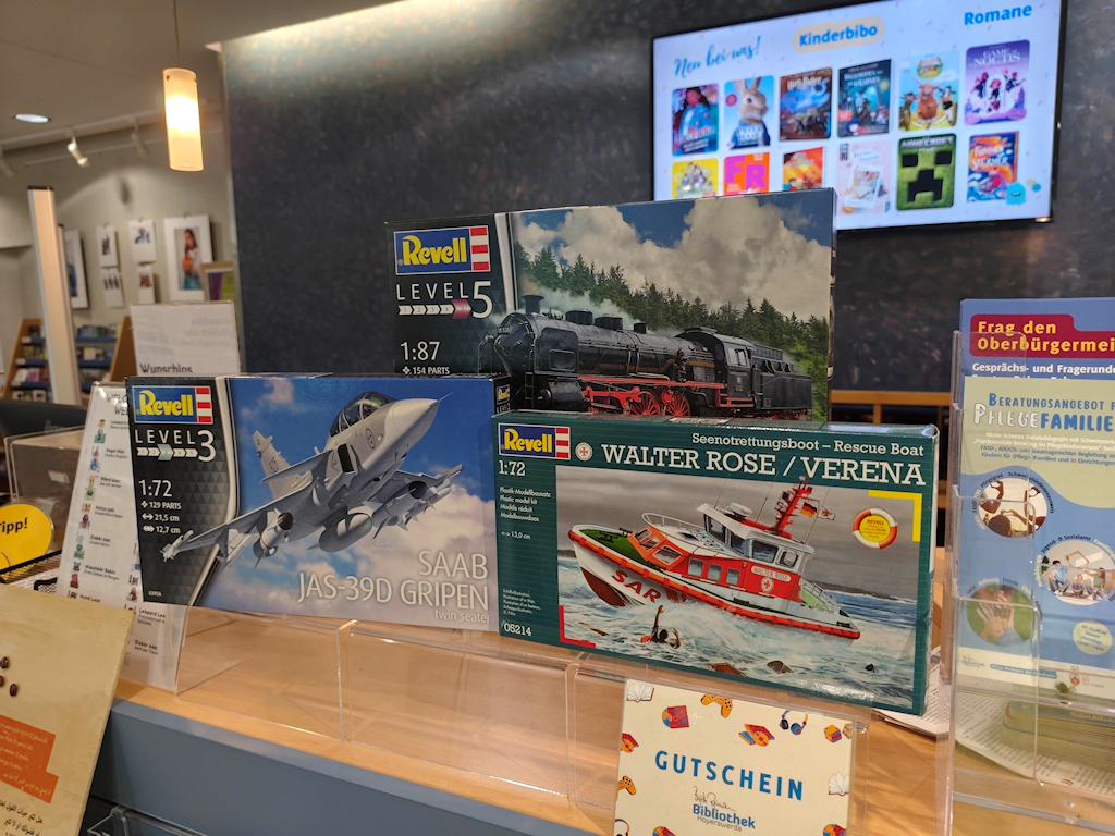 Bereits am Vormittag gegen 10 Uhr öffnete die Bibliothek ihre Türen für die Besucherinnen und Besucher, der Ansturm war von Beginn an enorm, so dass wir keine Pause hatten. Schon seit 3 Wochen konnten in einer Vitrine im Eingangsbereich der Bibliothek zahlreiche detailgetreue Modelle aus den Bereichen Flugzeug-, Auto- und Gebäudemodellbau bestaunt werden. Mitglieder des Modellbauclub Hoyerswerda e.V. standen für Fragen zur Verfügung und gaben Einblicke in ihre aufwendige Handarbeit und Techniken.