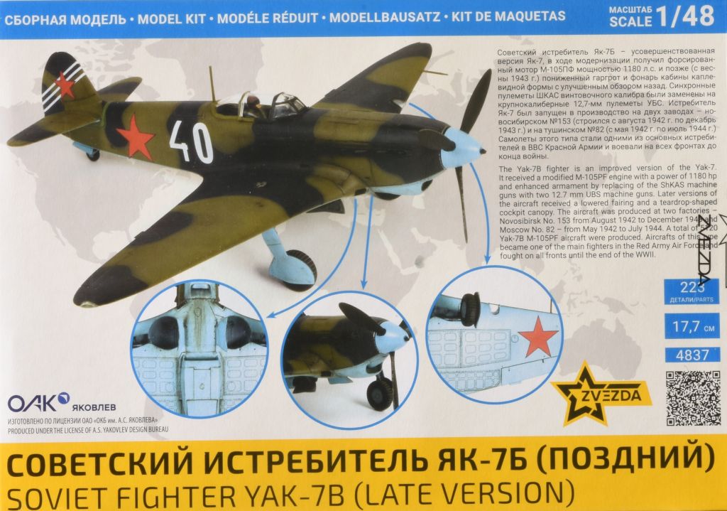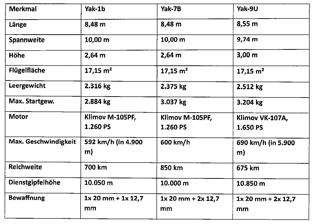 Vorbild: Mit etwa 30.000 bis zum Ende des II. Weltkrieges gebauten Exemplaren stellte die Baureihe Jakowlew Jak-1-7-9 neben den Mustern LaGG-5/La-5/7 und den MiG-1/3 das Rückgrat der sowjetischen Jagdfliegerverbände. Die Jaks unterschieden sich in erster Linie hinsichtlich der Triebwerke und der Bewaffnung, die Jak-9 mit ihrer Metallzelle auch in der Bauweise. Die eigentlich als Trainingsflugzeuge konzipierten Jak-7 hatten noch einen hohen Rumpfrücken, ähnlich der frühen Jak-1. Eine kleine KI-basierte tabellarische Übersicht über die technischen Daten der diversen Jaks.