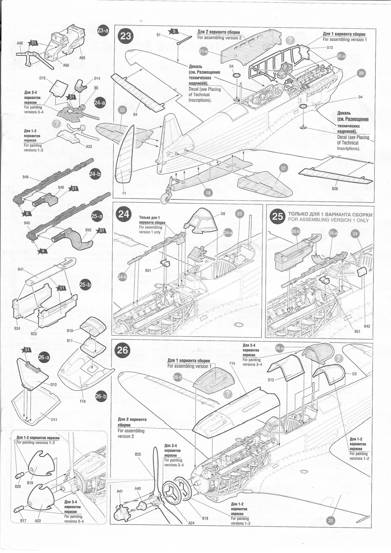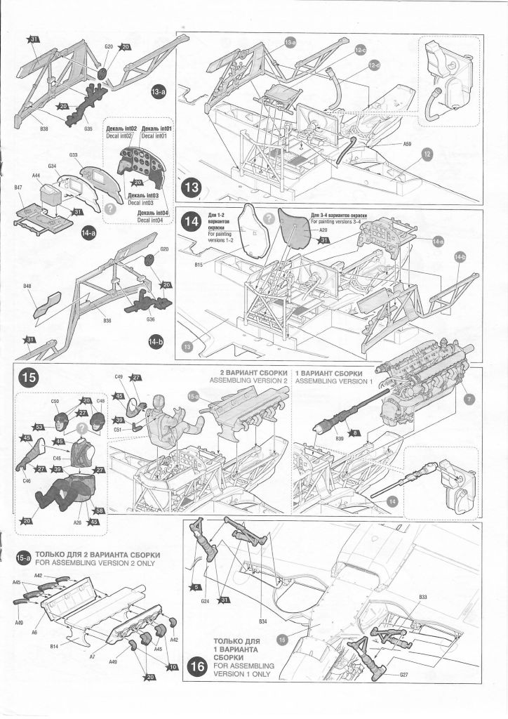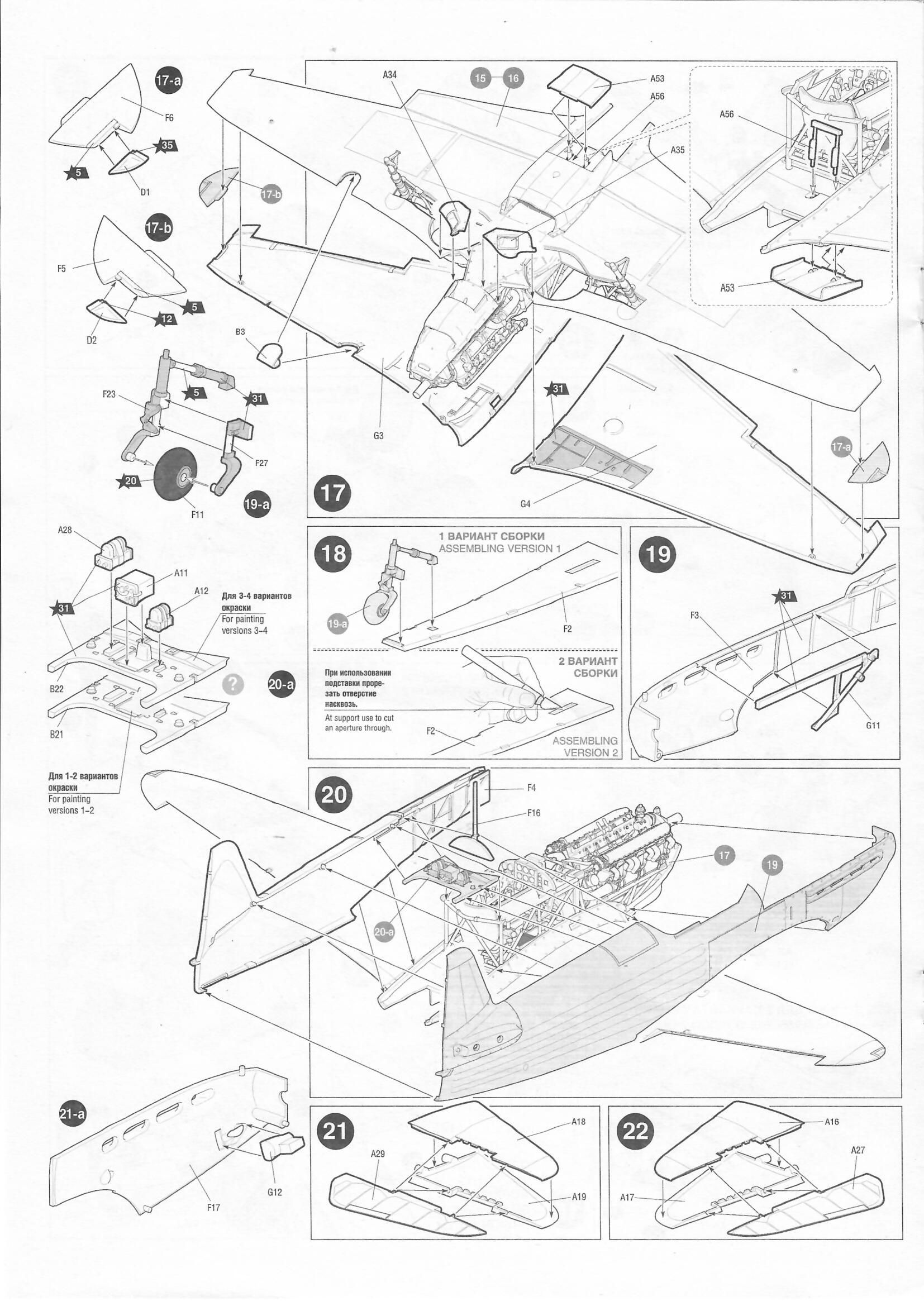 Die Bauanleitung ist ebenfalls sehr typisch für Zvezda. Immerhin kommt sie als geheftete Version. Teilweise ist sie unübersichtlich, die genaue Platzierung von Teilen lässt sich nur erahnen, und vor allem bedarf sie eines gründlichen Studiums vor dem Bau des Modells. Aus diesem Grunde soll sie hier vollständig dokumentiert sein.