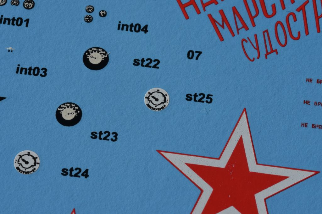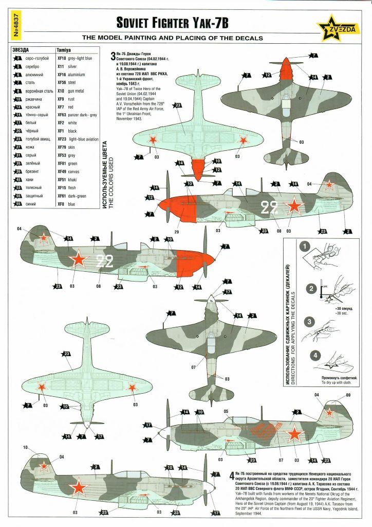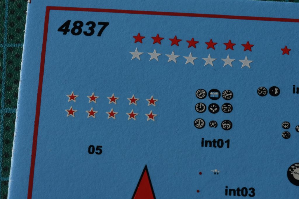 Ein doppelseitiges Hochglanzblatt enthält Informationen für die Markierungsmöglichkeiten dieses Bausatzes. Die Farbangaben sind leider sehr beschränkt und beziehen sich nur auf die Farbsysteme von Zvezda und Tamiya.