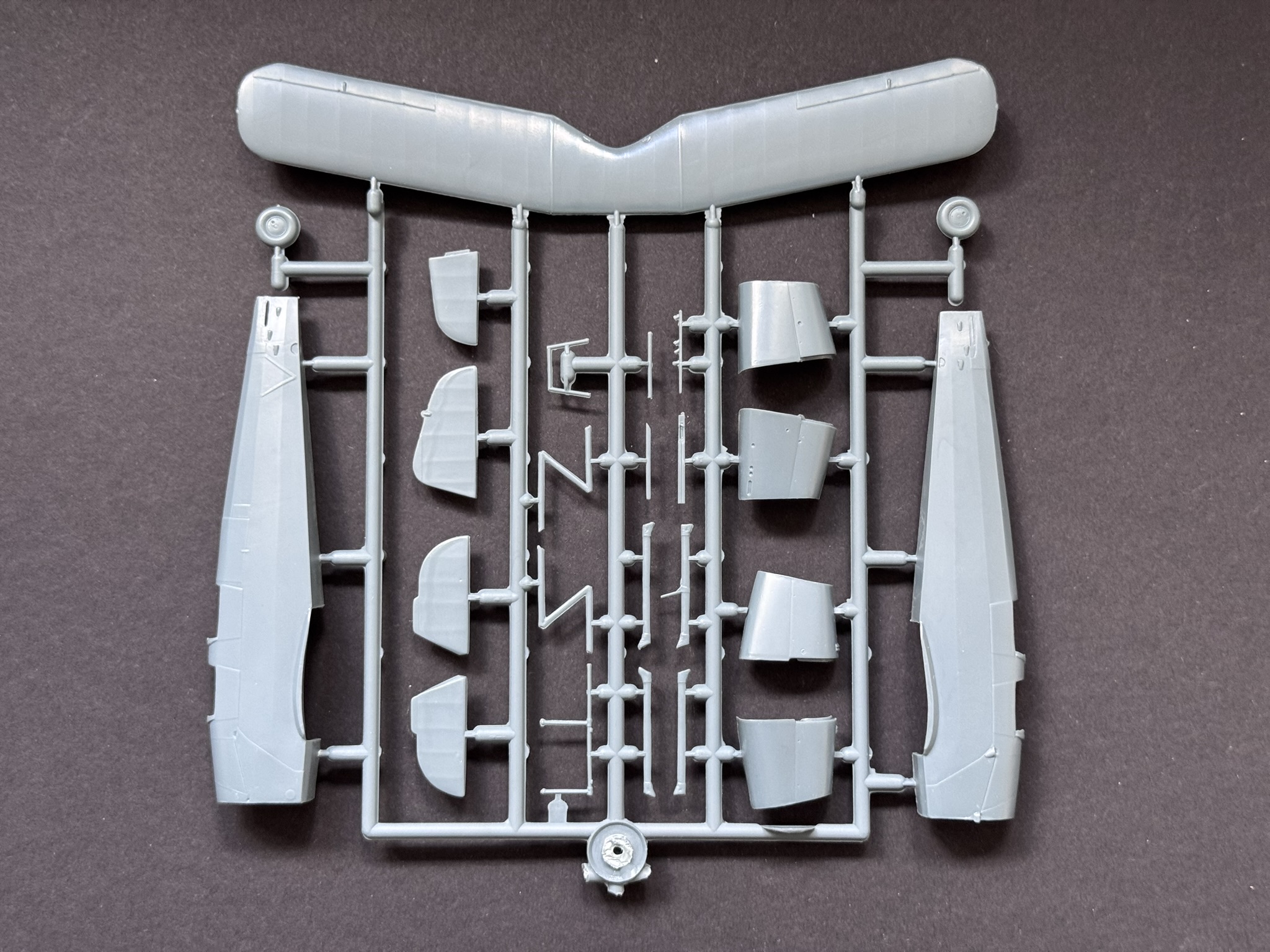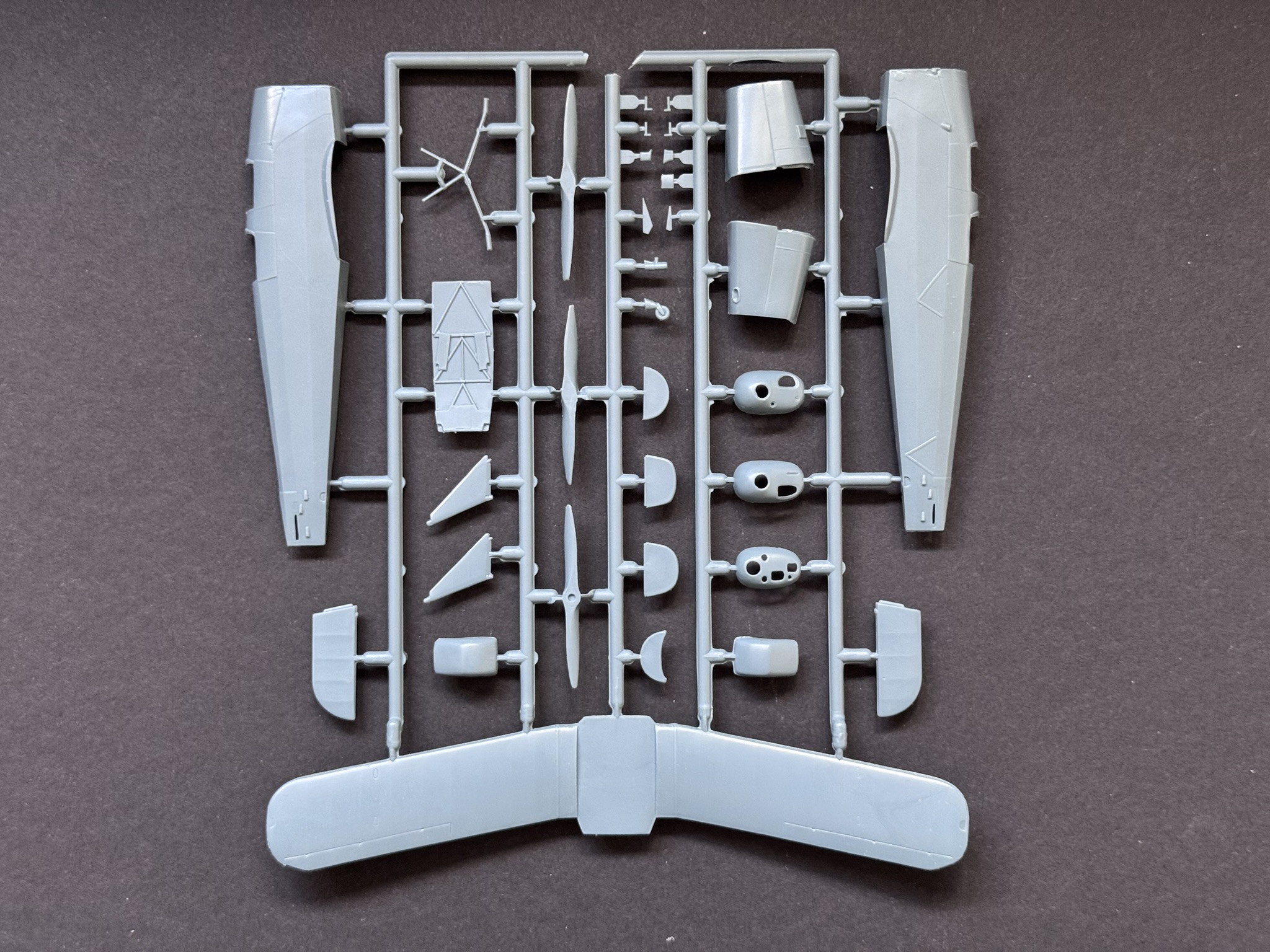 Die kleine Schachtel hat innen einiges zu bieten: Neben dem Gussrahmen liegen auch eine kleine PE-Platine sowie ein Set 3D-gedruckter Teile bei. Der Gussrahmen enthält verschiedene Motorabdeckungen, Propeller und sogar einen zusätzlichen Rumpf, die zu anderen Versionen der Bücker gehören. Das helle Plastik macht einen guten Eindruck; hier und da findet man zwar etwas Fischhaut aber keine groben Fehler oder Ähnliches. Persönlich finde ich einige Angusspunkte etwas ungünstig platziert, so sind die Flügel an der Vorderkante angegossen, diese sauber zu entfernen, ist gerade für Anfänger nicht ideal.