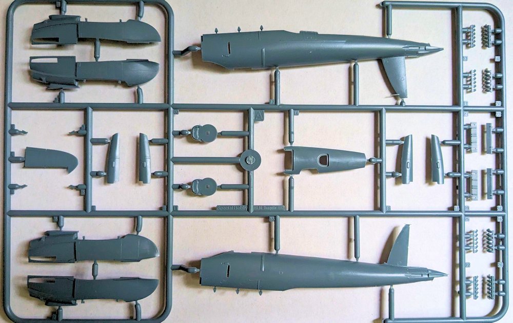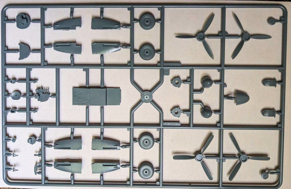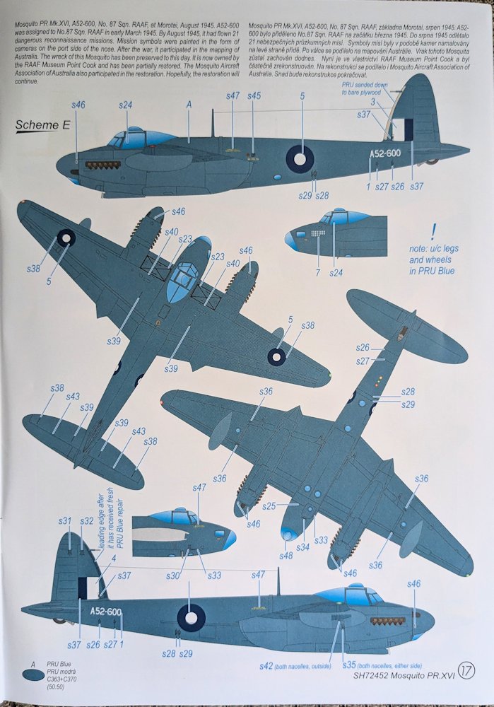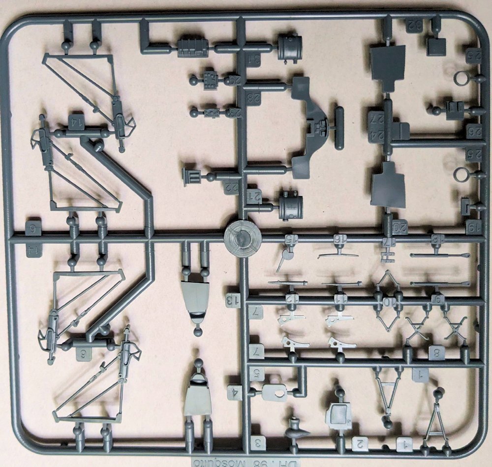 Bausatz: Der größere Karton von Special Hobby ist randvoll mit 220 Teilen aus einer neuen Form. Aus sechs grauen Rahmen, einem klaren Gussast und den Abziehbildern soll mit Hilfe der Bauanleitung der späte Mosquitoauflärer PR. XVI entstehen. Der modulare durchdachte Aufbau verspricht weitere Varianten, liefert aber eine Menge Teile für die Ersatzteilkiste.