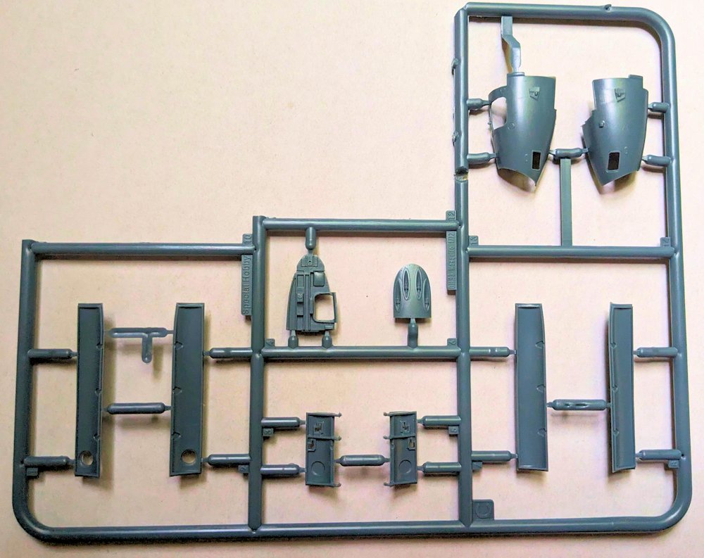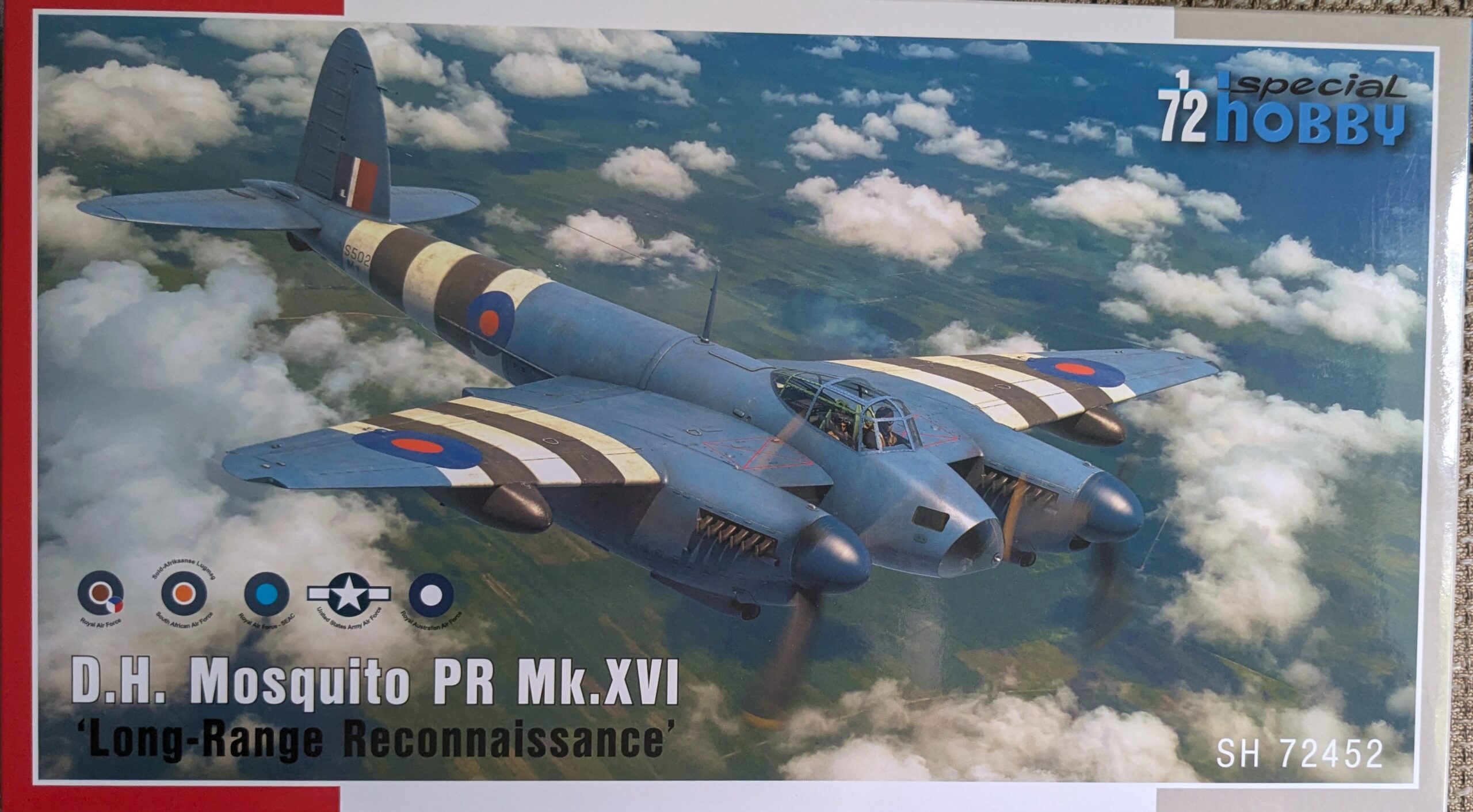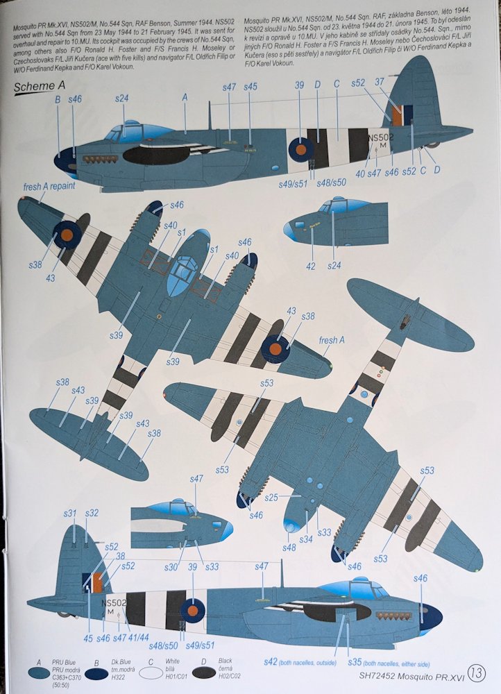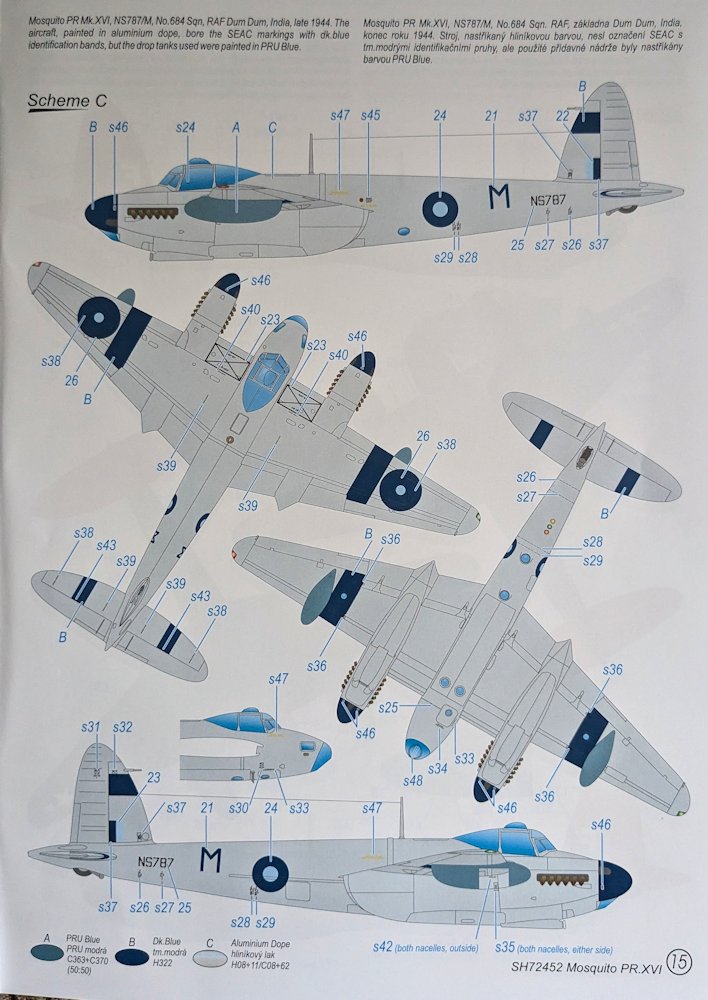 Bausatz: Der größere Karton von Special Hobby ist randvoll mit 220 Teilen aus einer neuen Form. Aus sechs grauen Rahmen, einem klaren Gussast und den Abziehbildern soll mit Hilfe der Bauanleitung der späte Mosquitoauflärer PR. XVI entstehen. Der modulare durchdachte Aufbau verspricht weitere Varianten, liefert aber eine Menge Teile für die Ersatzteilkiste.