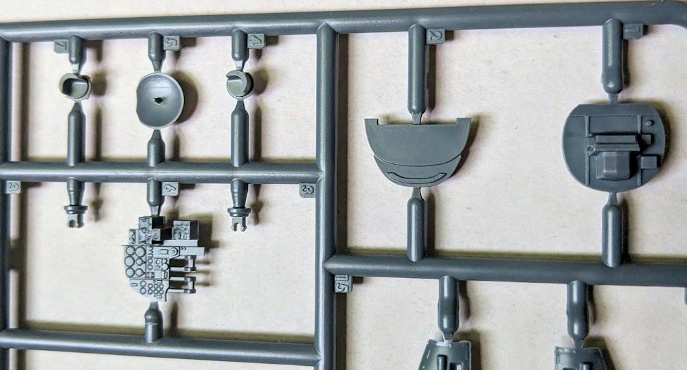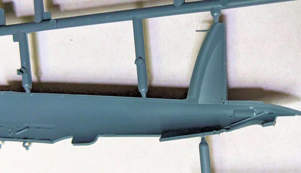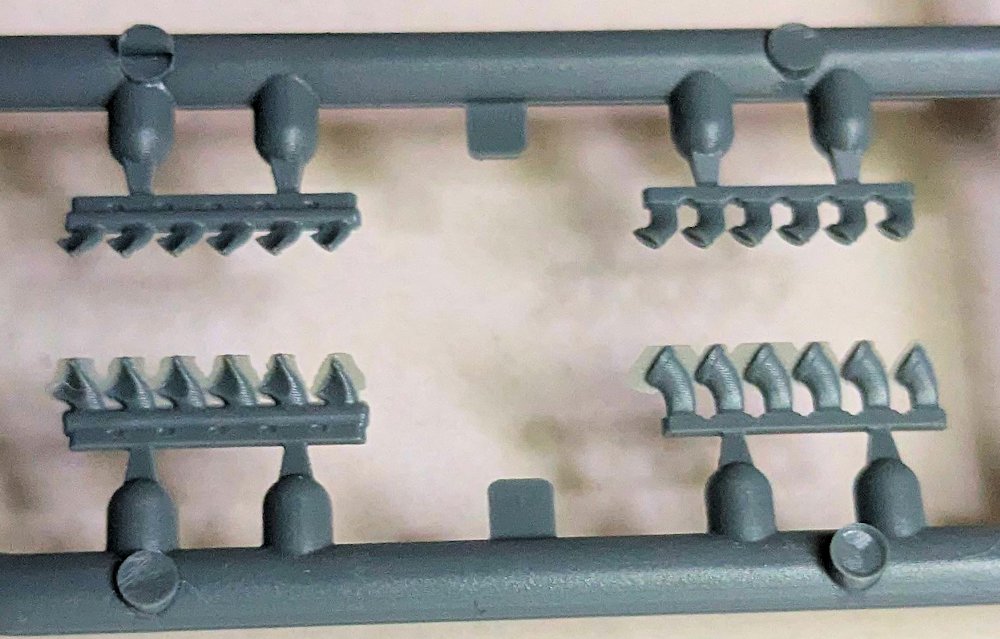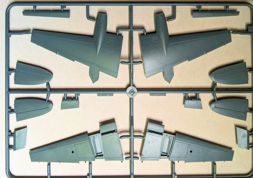 Eine weniger gute Idee ist der Einbau des Hauptfahrwerks vor der Montage der Motorgondeln, denn so ist es beim Farbspritzen im Weg. Allerdings ist es sehr sauber, filigran und detailliert ausgeführt. Also Vorsicht beim Heraustrennen und der Montage. Die Räder sind ebenfalls gut. Gleiches kann man von den Motorgondelhälften nicht sagen. Die Strukturen im Fahrwerkschacht hinterlassen Sinkstellen und Dellen auf der Außenseite. Zwei der vier Auspuffreihen weisen leider Grat auf.