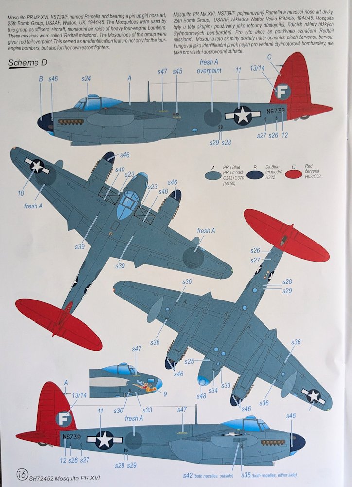 Vorbild: Die zweimotorige, zweisitzige Maschine wurde in Holzbauweise hergestellt und mit großem Erfolg als Bomber, Aufklärer und Nachtjäger und in anderen Aufgabenbereichen eingesetzt. Zwischen 1940 und 1950 wurden über 7700 Maschinen in GB, Kanada und Australien gebaut. Die letzte Mosquito – eine NF Mk.38 – lief 1950 vom Band. Aufgrund ihrer überragenden Flugeigenschaften hatte sie die geringste Verlustrate der RAF-Bomber. Die Maschine wurde auch von den USA, Kanada, Australien, Neuseeland, Südafrika, der CSR, Jugoslawien und Israel genutzt. (Wikipedia)