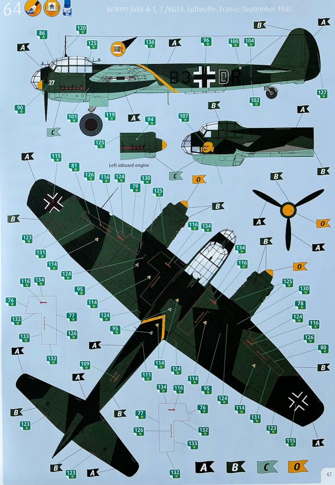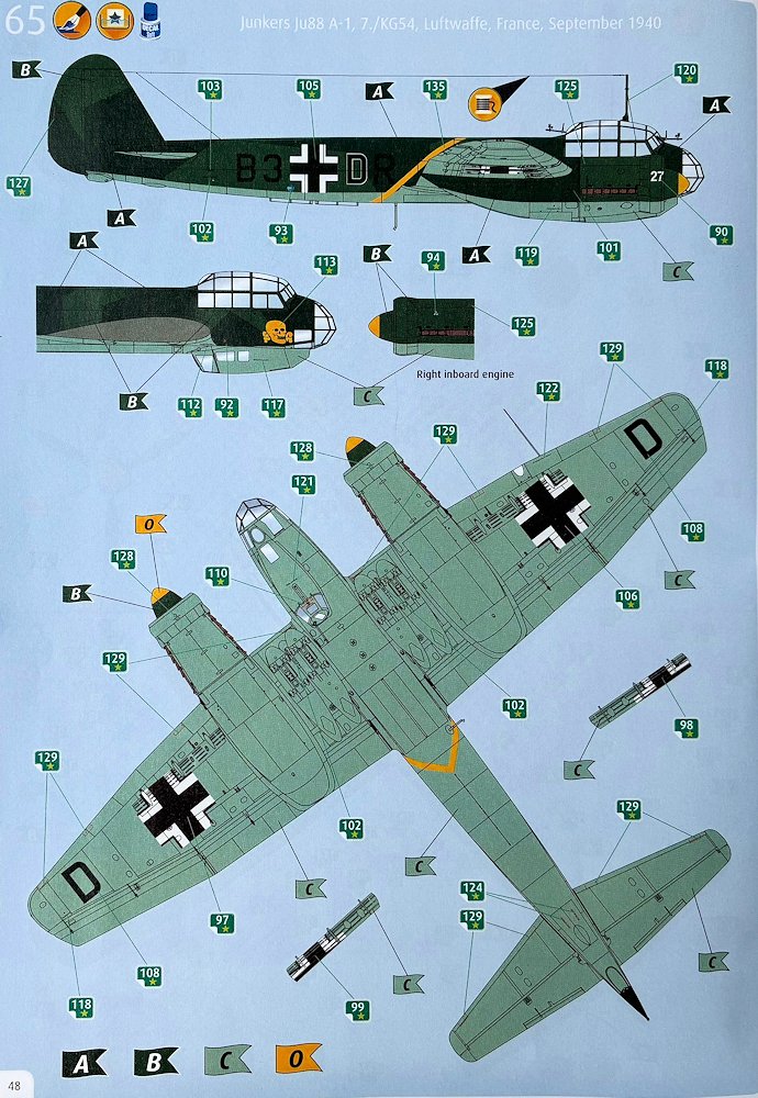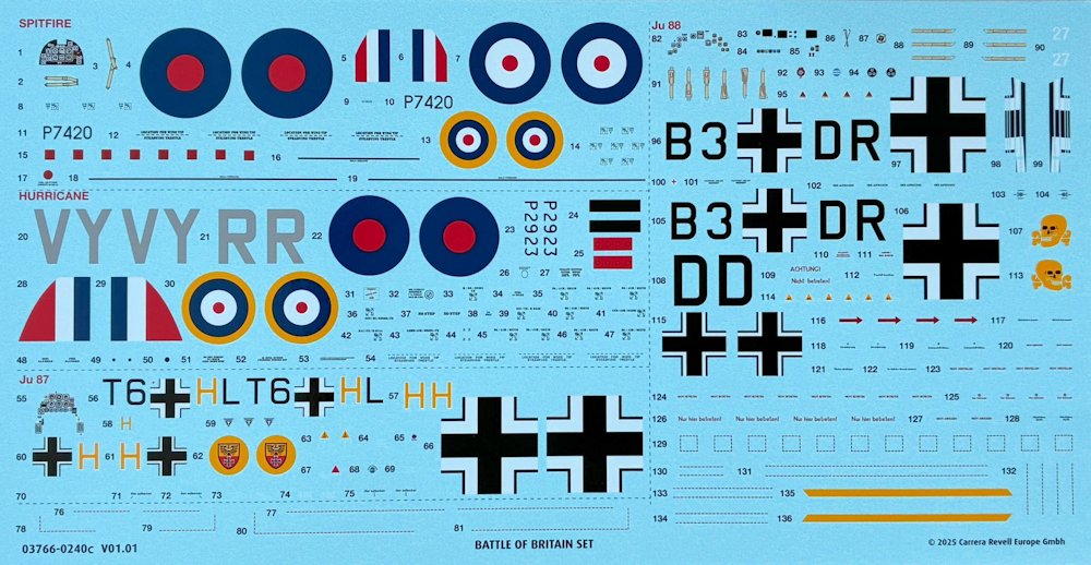 Anleitung/Bemalung: Problemlos führen die vier Kapitel zum Erfolg. Für die Ju 88 ist es etwas komplexer. Die anstandslos gedruckten Abziehbilder bieten Kennung und Wartungshinweise für vier Maschinen. Selbst kleine Schriftzüge sind lesbar. Alle Vorschläge fallen in den Zeitraum August-September 1940.