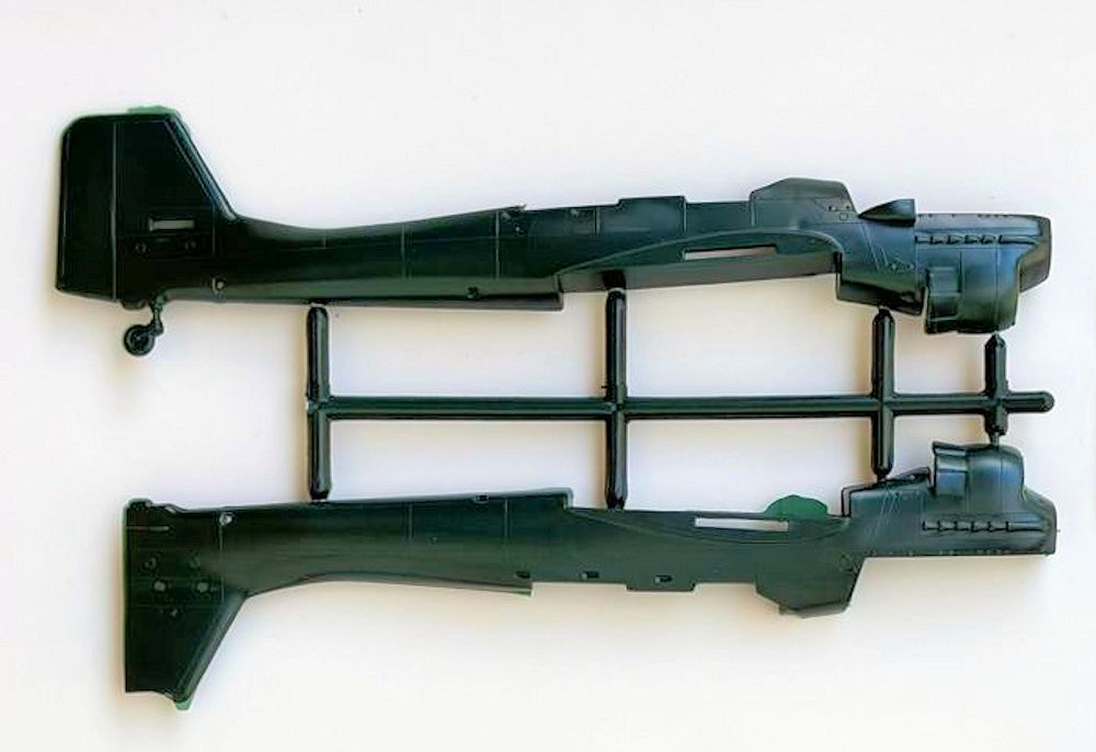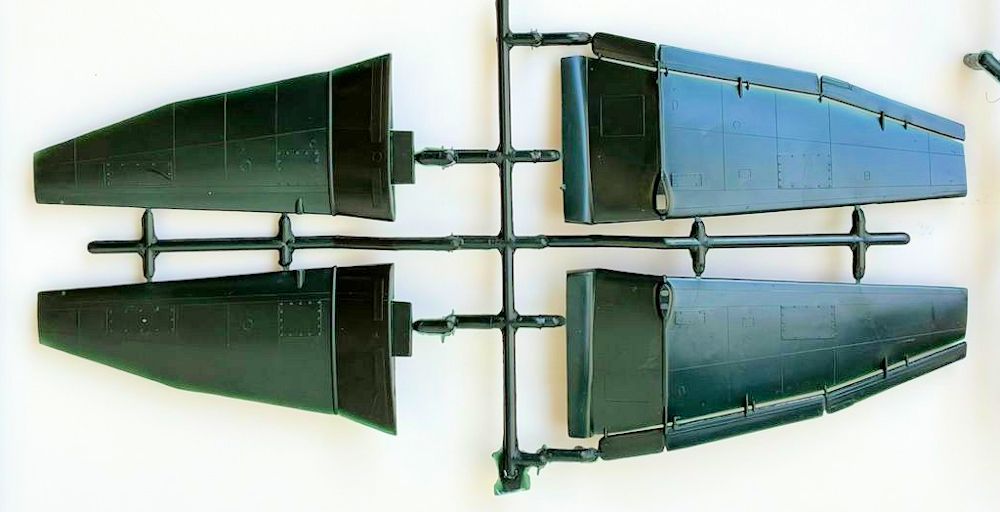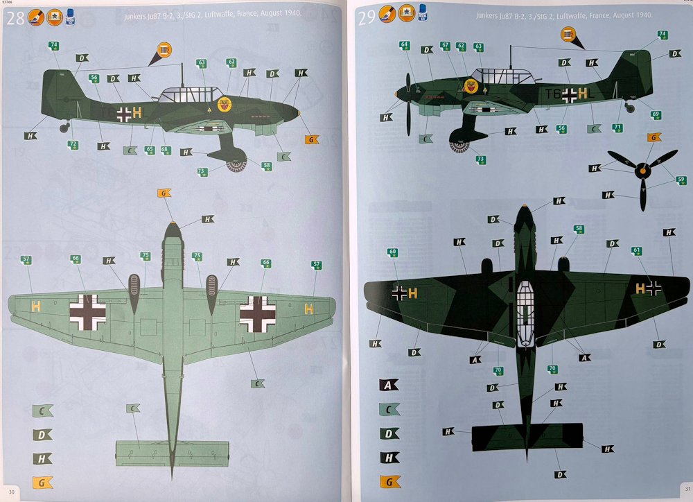 Junkers Ju 87B: 1976 erscheint diese Variante erstmals. Bis auf Motorabdeckung und Kühler ist sie identisch mit dem Kit der Ju 87G. Teile- und Oberflächengestaltung ist ähnlich rustikal wie bei der Hurricane. 56 grüne Teile mit positiven Gravuren. Die Kanzel ist klar. Das Cockpit hat acht Teile. Für Instrumente und Gurte sind Decals vorhanden. Die Motornachbildung ist Markenzeichen des Kits. Die Betrachtung des Stuka führt bei Älteren zur Überlegung, wo das Modell damals gekauft wurde. Die meisten kleinen Bastelläden sowie die großen Kaufhäuser sind heute Geschichte.