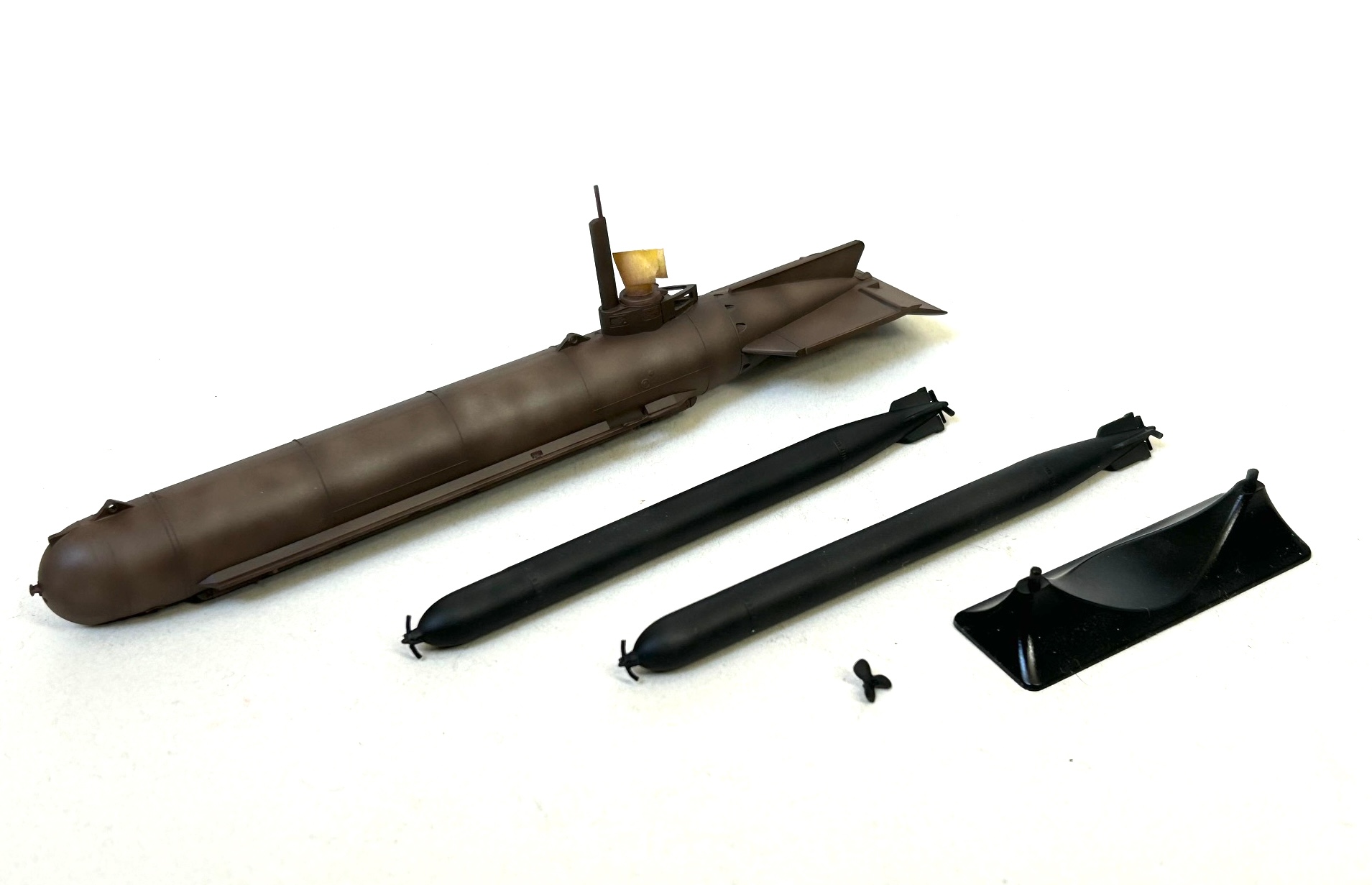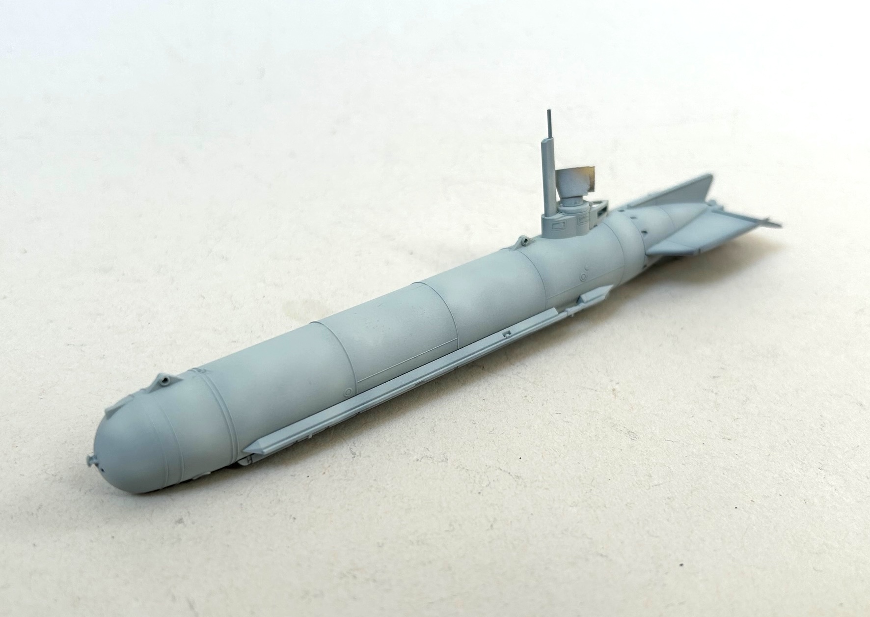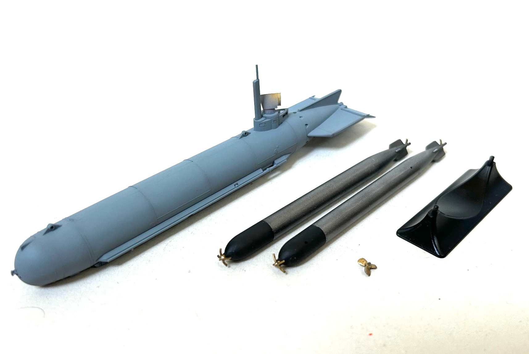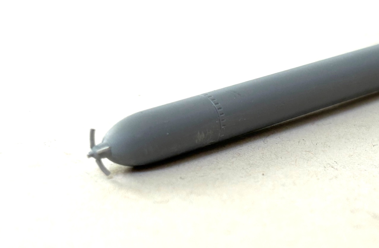 Die beiden Torpedos waren auch schnell zusammengebaut. Die beiden Antriebsschrauben am Heck, die Formen bedingt in gleicher Ausrichtung umgesetzt sind, habe ich mit einer Mikrosäge voneinander getrennt und etwas versetzt wieder angeklebt. Am Zündkopf der Torpedos wurden dann noch die vier kleinen gekrümmten Stege angebracht womit der Bau des Modelles abgeschlossen war.