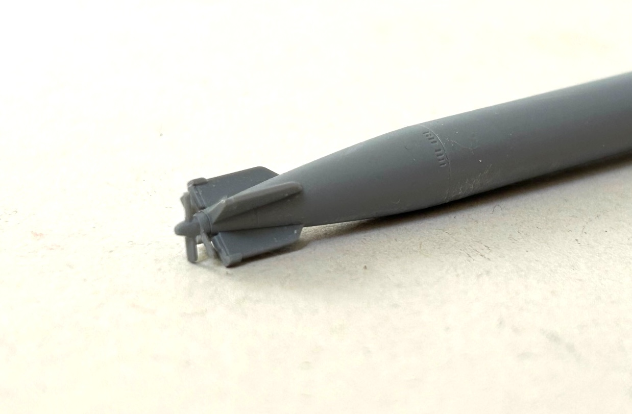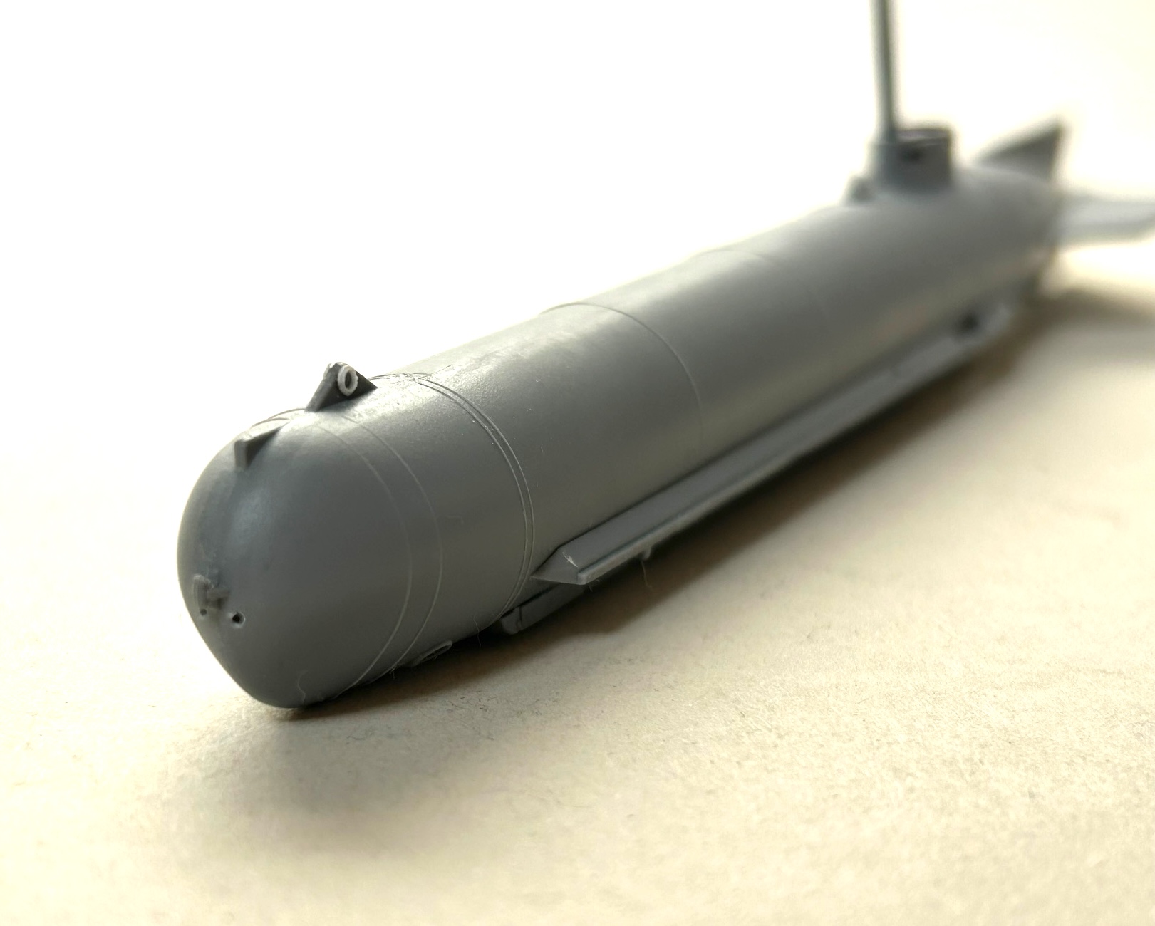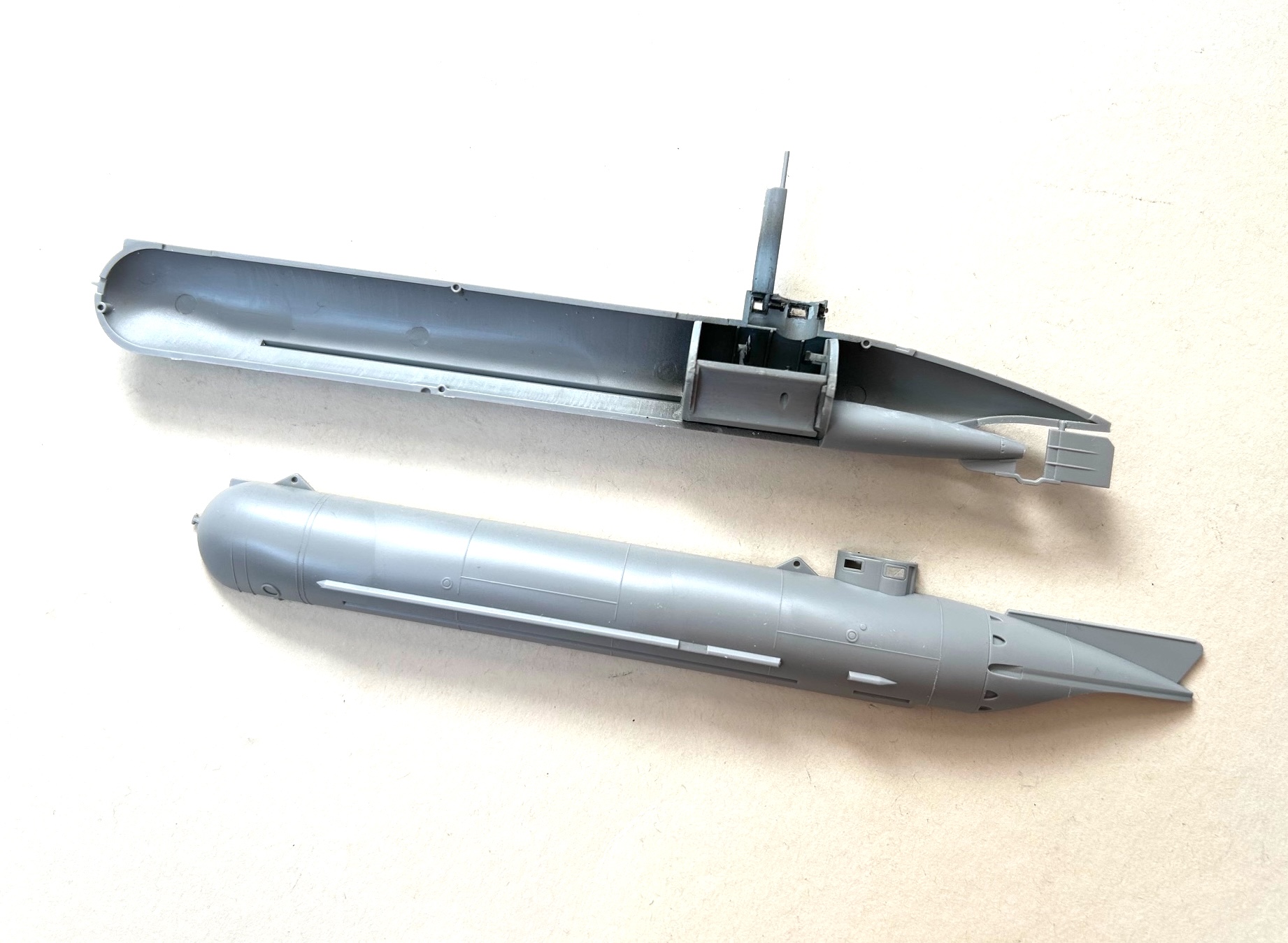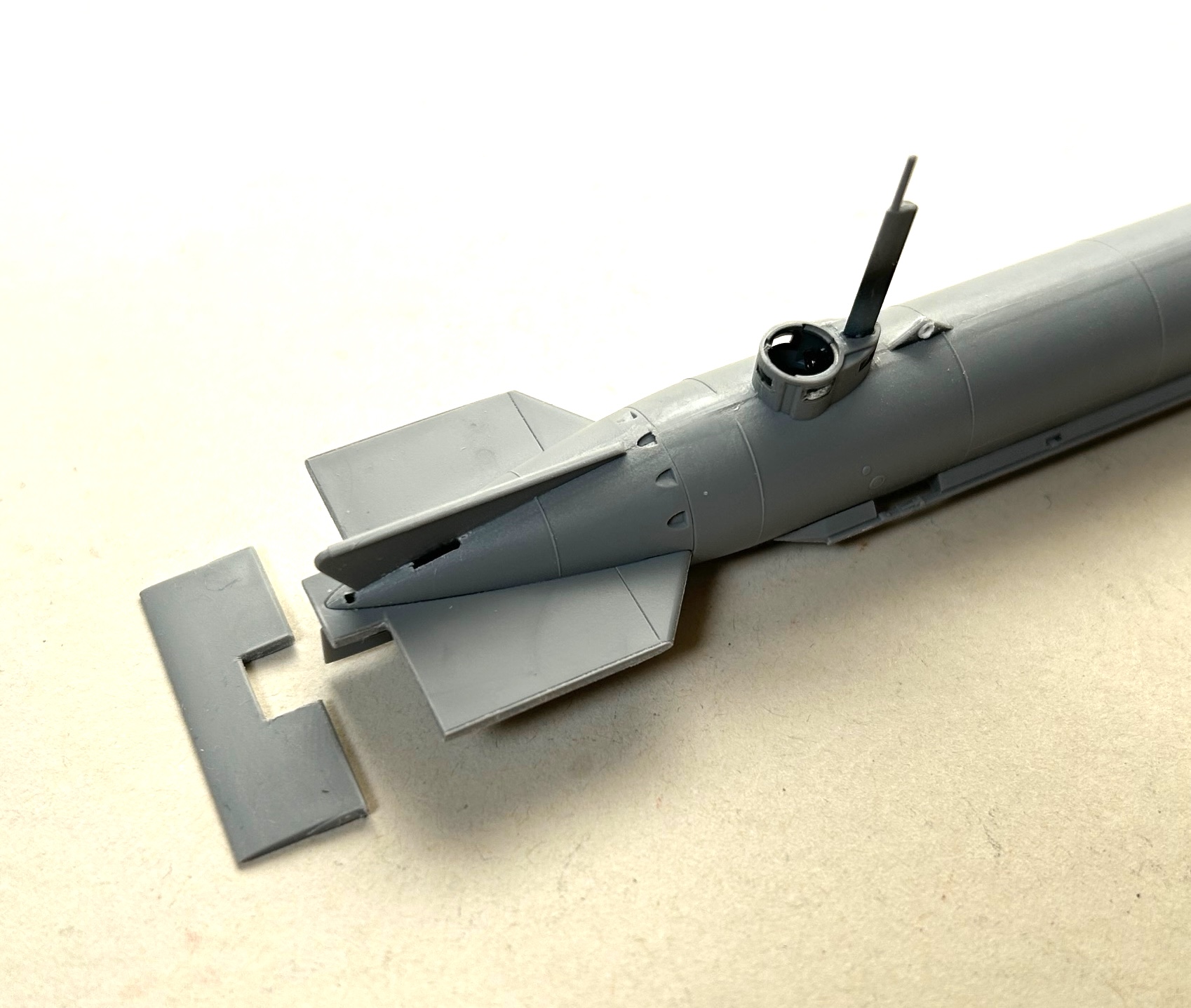 Die beiden Torpedos waren auch schnell zusammengebaut. Die beiden Antriebsschrauben am Heck, die Formen bedingt in gleicher Ausrichtung umgesetzt sind, habe ich mit einer Mikrosäge voneinander getrennt und etwas versetzt wieder angeklebt. Am Zündkopf der Torpedos wurden dann noch die vier kleinen gekrümmten Stege angebracht womit der Bau des Modelles abgeschlossen war.