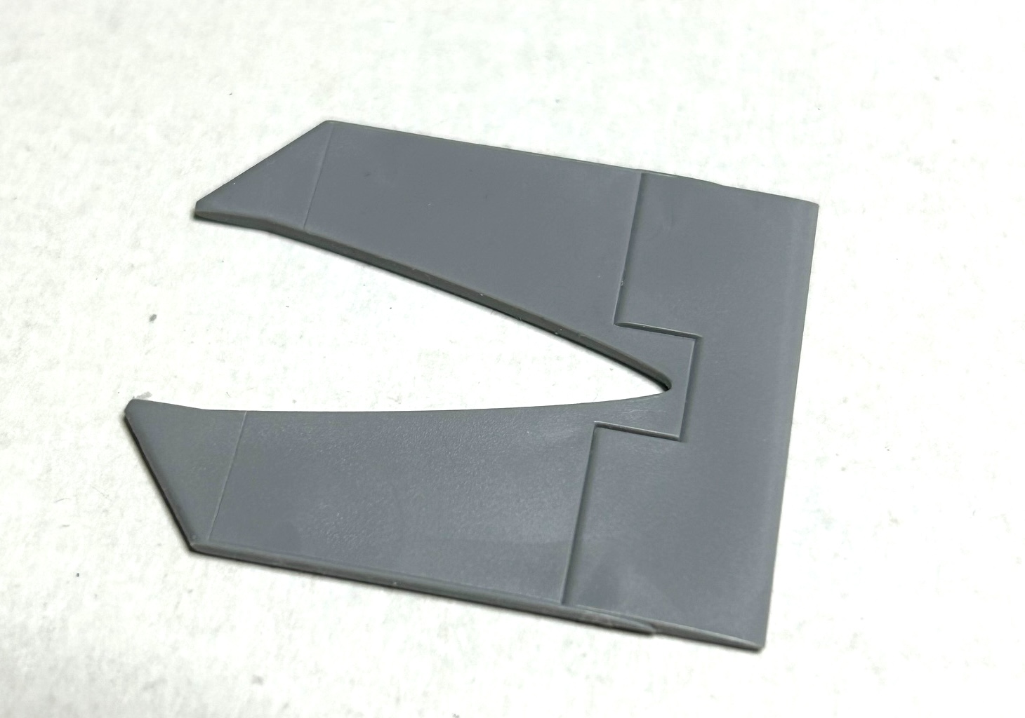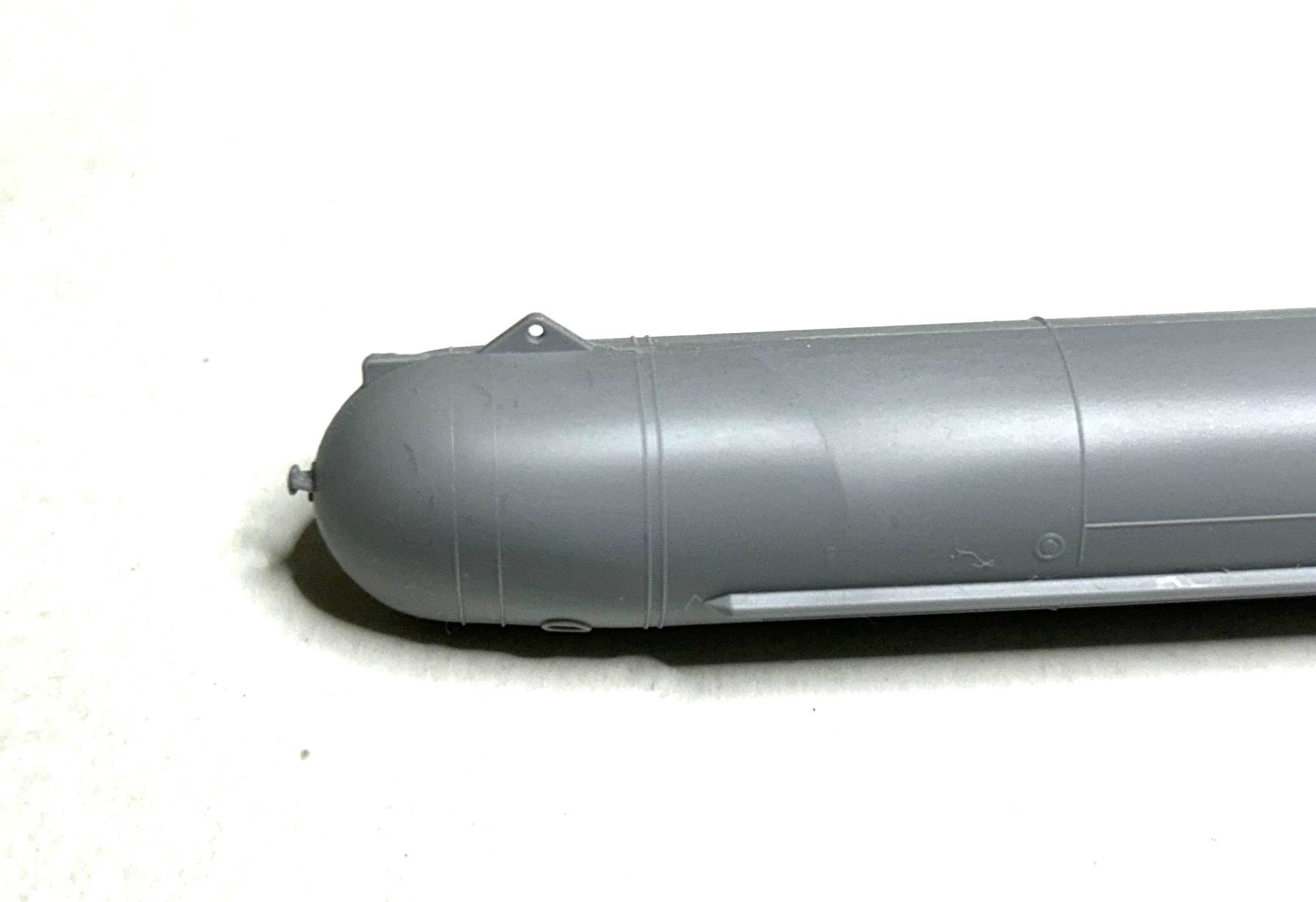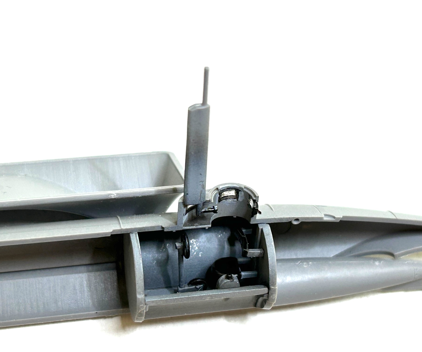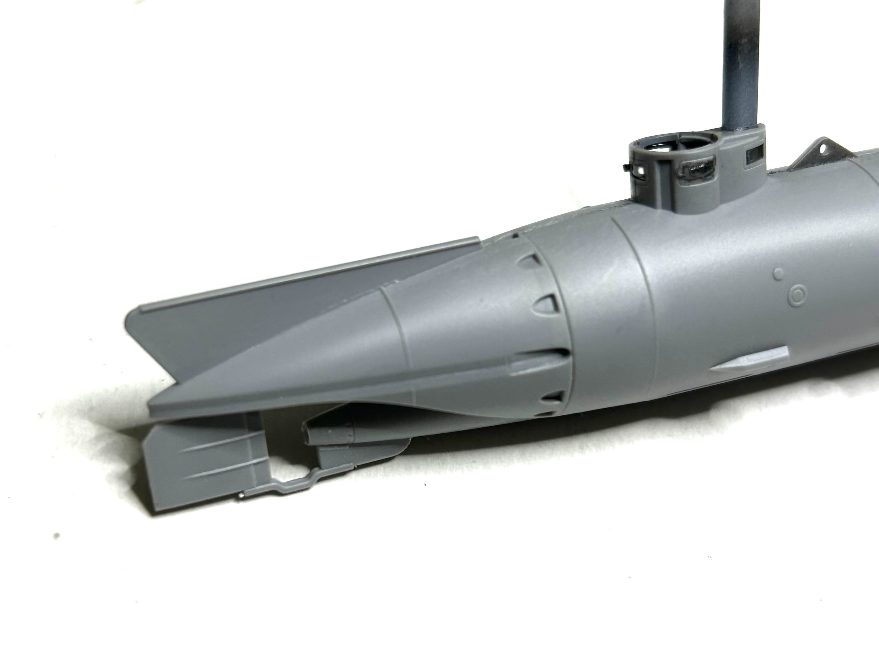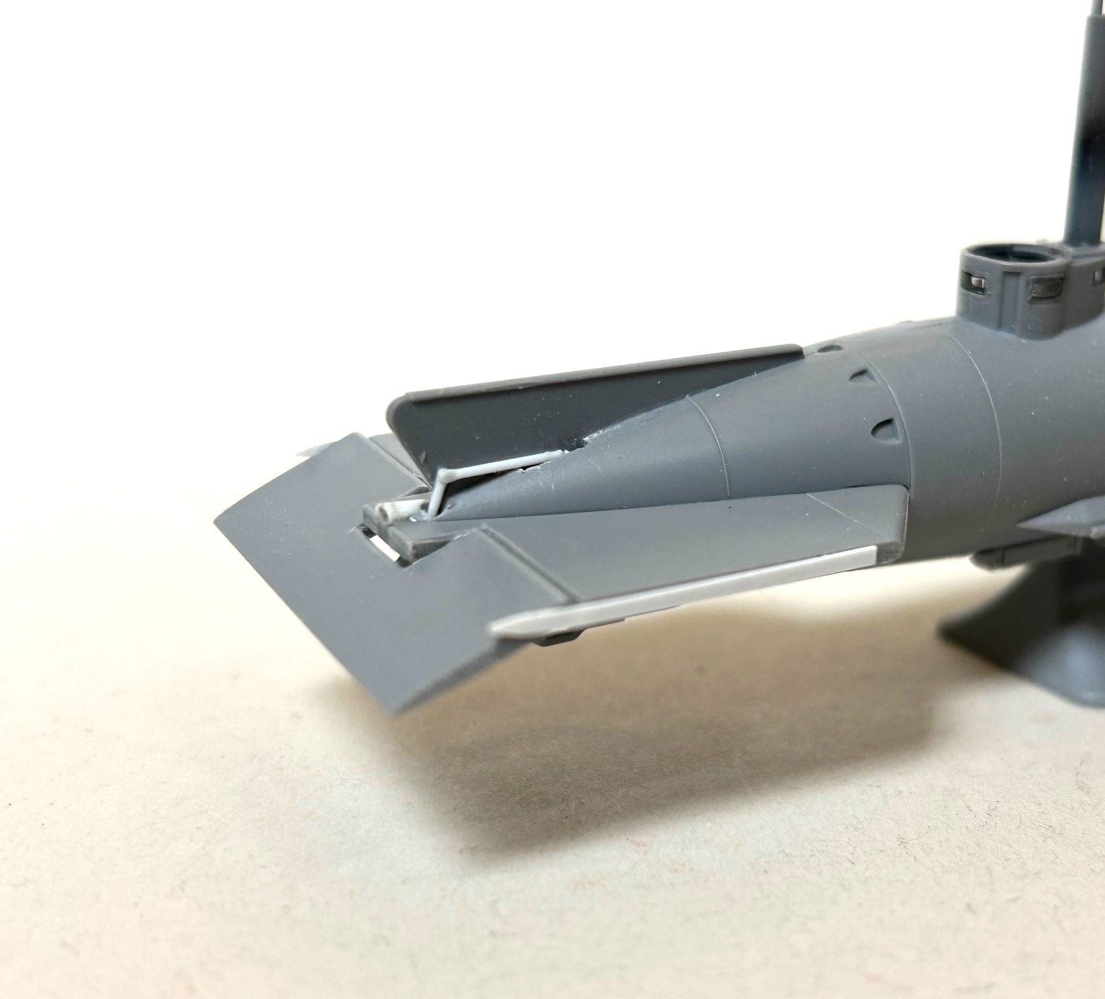 Mit einem scharfen Bastelmesser habe ich dazu die Fugen solange bearbeitet, bis das Heckruder entfernt werden konnte. Nach vorsichtigem Glätten der Schnittstellen wurden im Innenbereich zwei dünne Plastikscheiben eingesetzt um das Quergestänge zu simulieren und an den beiden Aussenkanten dünne Plastikstreifen angebracht. Schließlich habe ich seitlich an der Finne noch zwei Öffnungen für das Rudergestänge erzeugt und mit dünnem Rundmaterial das fehlende Rudergestänge ergänzt. Auf Originalfotos ist noch ein kleiner Zylinder am Heck erkennbar, der ebenfalls aus Rundmaterial ergänzt werden konnte.
