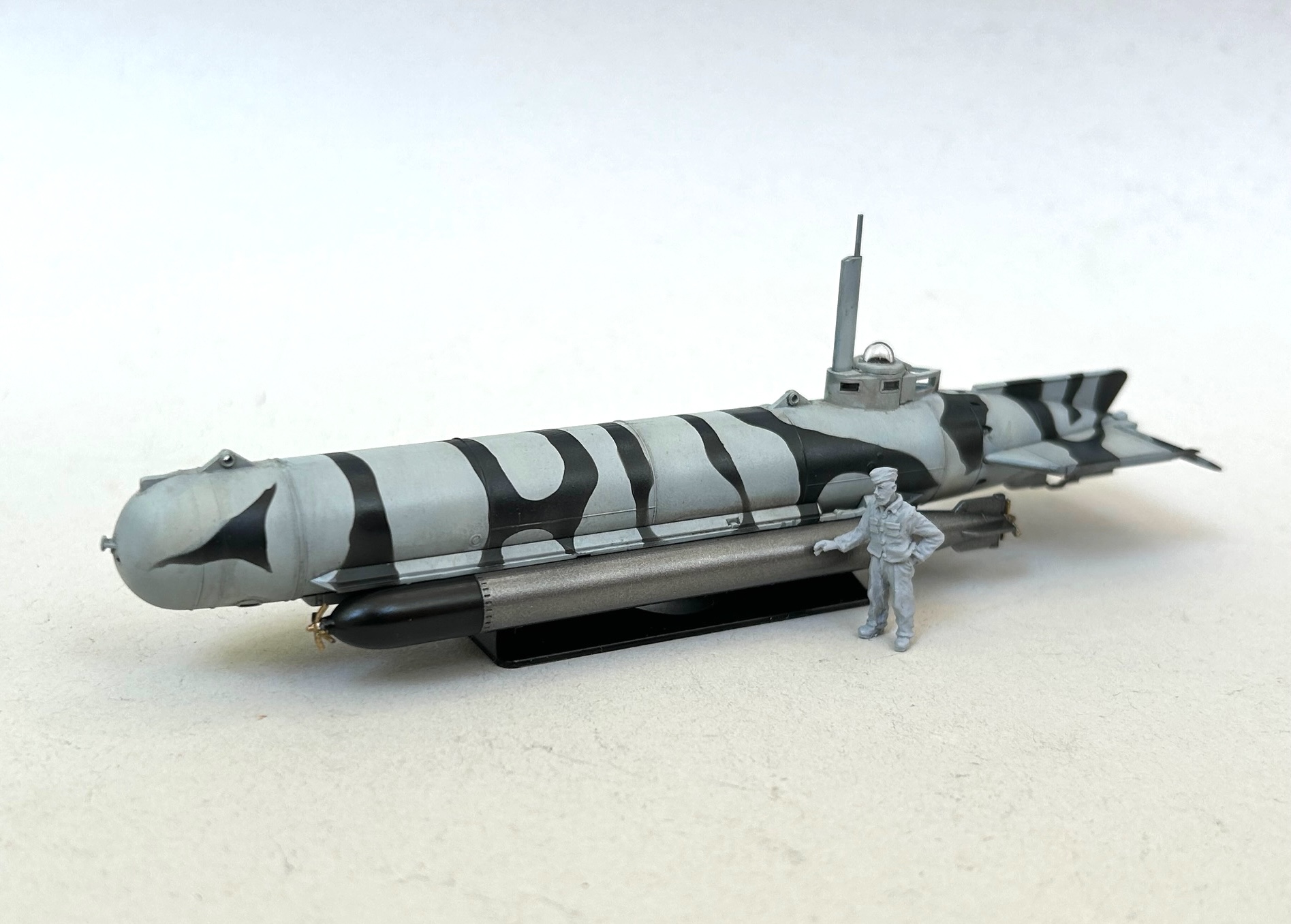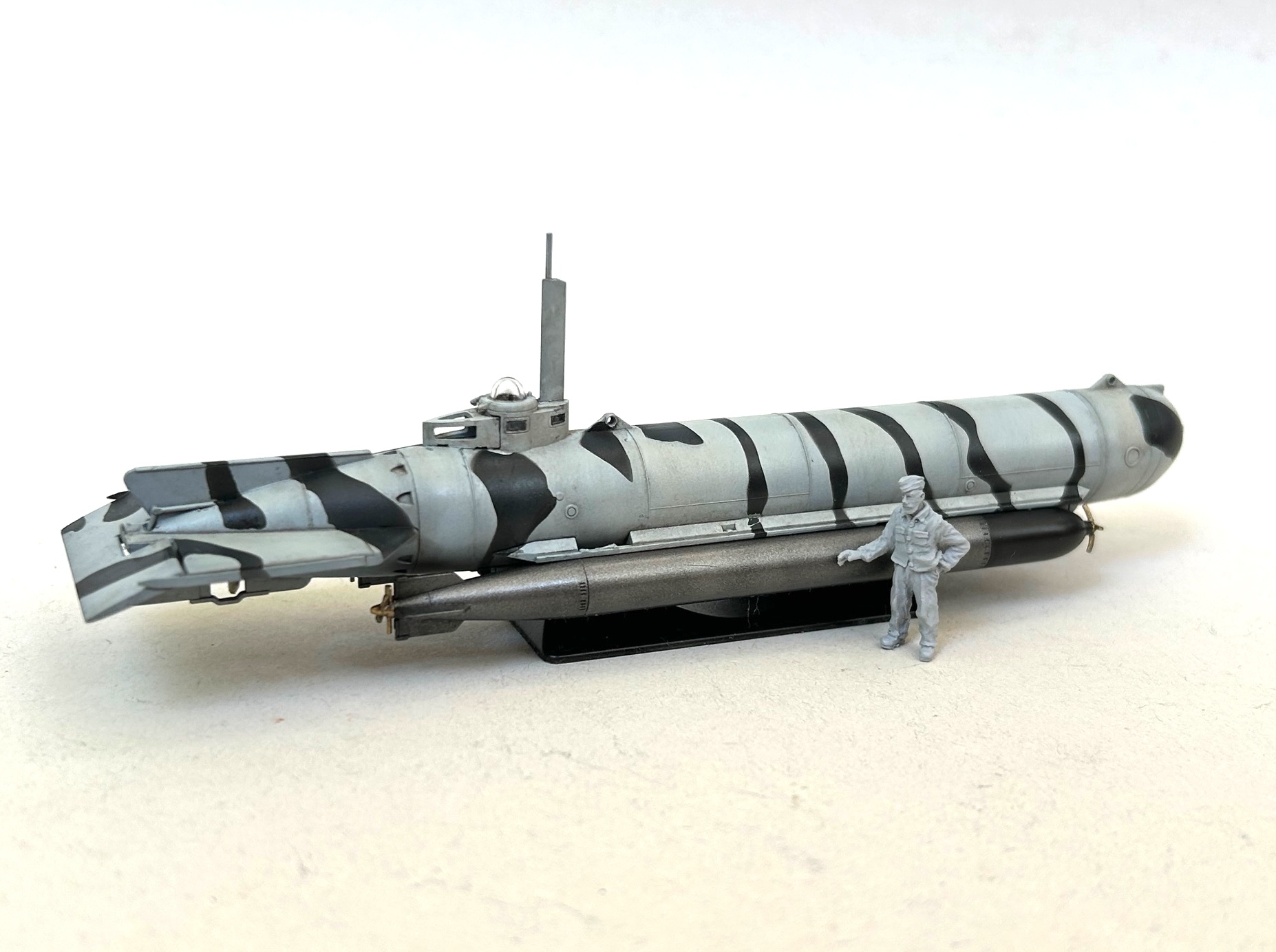 Für die Präsentation des Modells habe ich noch einen passenden Holzsockel im Schrank gefunden und mit einem kleinen Schild versehen. Um sich der Größe des Kleinst-U-Bootes bewusst werden zu können, wurde noch ein Matrosen der Deutschen Kriegsmarine im Maßstab 1:72 von CMK bemalt und neben dem Modell platziert.