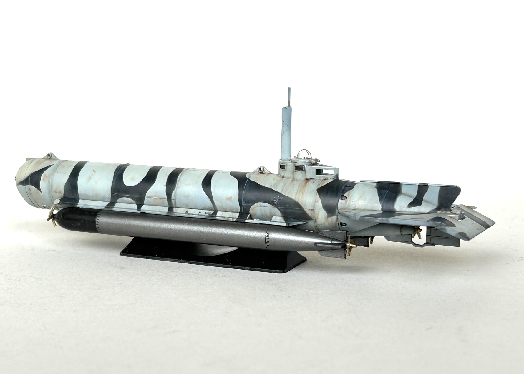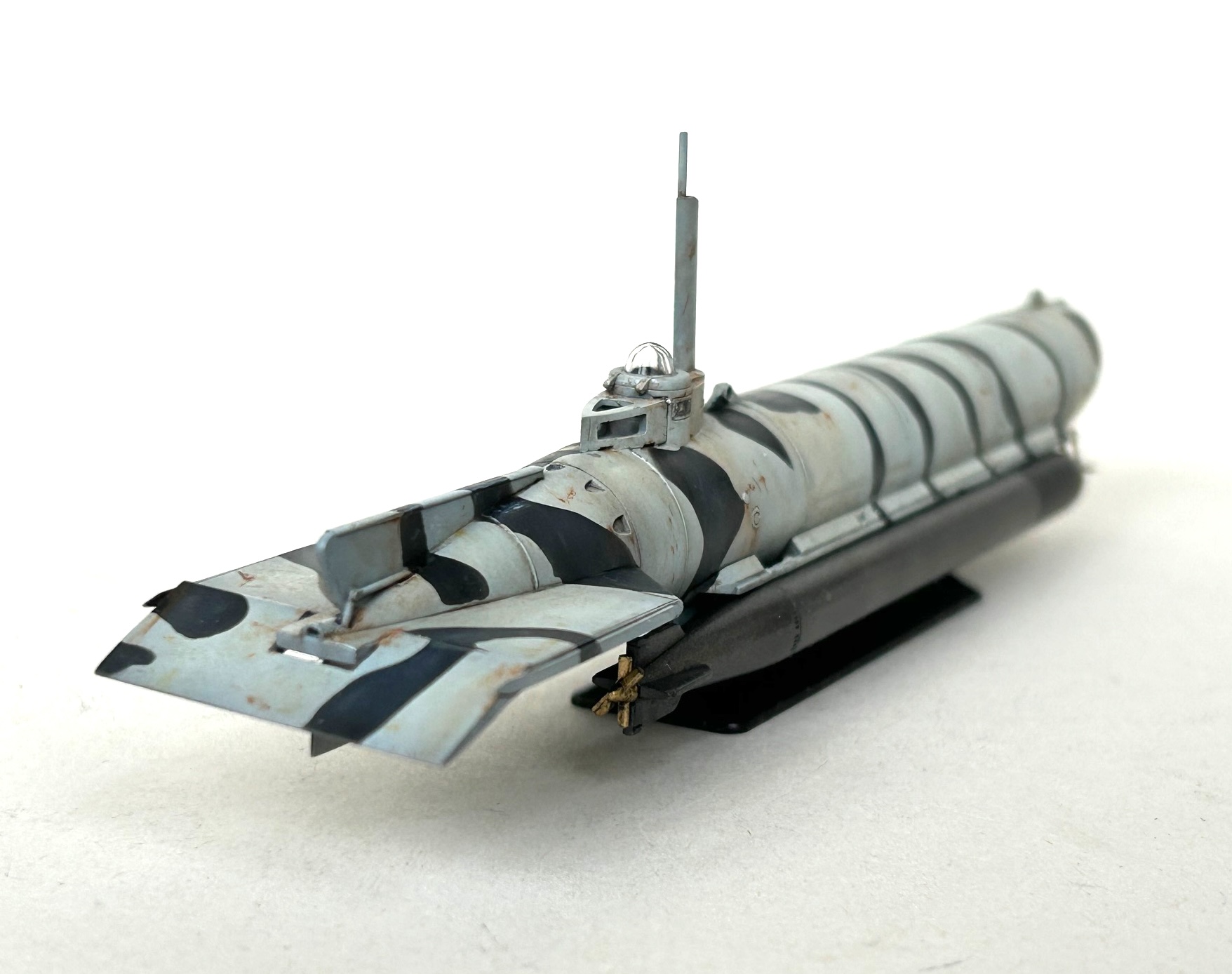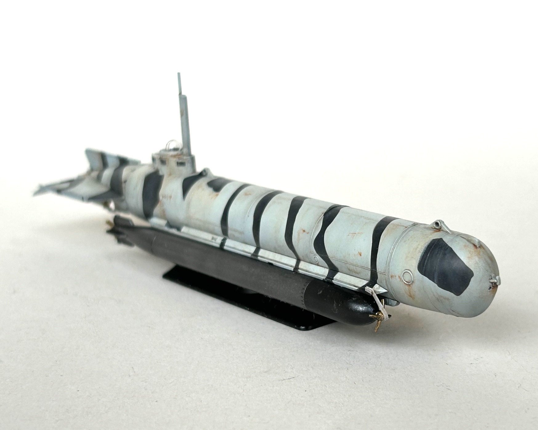 Nach einer angemessenen Trockenzeit folgte ein Wash des U-Boot Modells inklusive Torpedos mit einer „Brühe“ aus schwarzer und erdbrauner Ölfarbe und die Betonung von Details mit Pin-Washes. Schließlich wurden noch ein paar Abnutzungsspuren und Roststellen mit dem Pinsel aufgebracht und das Modell war damit fertig bemalt.