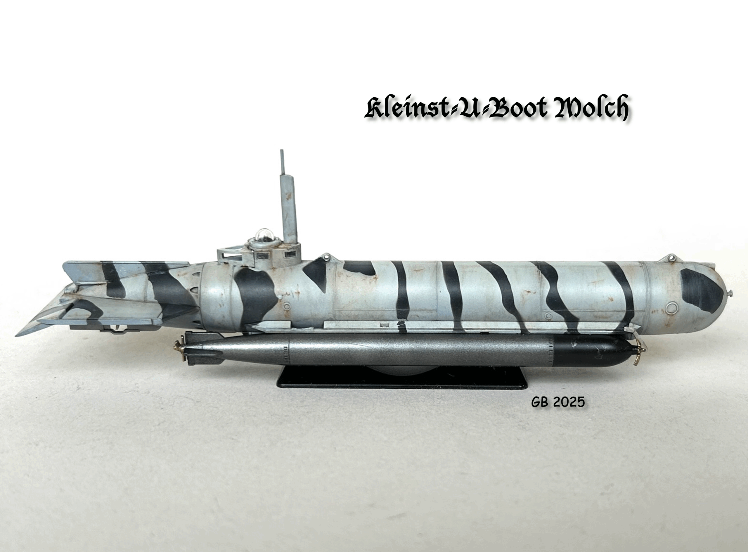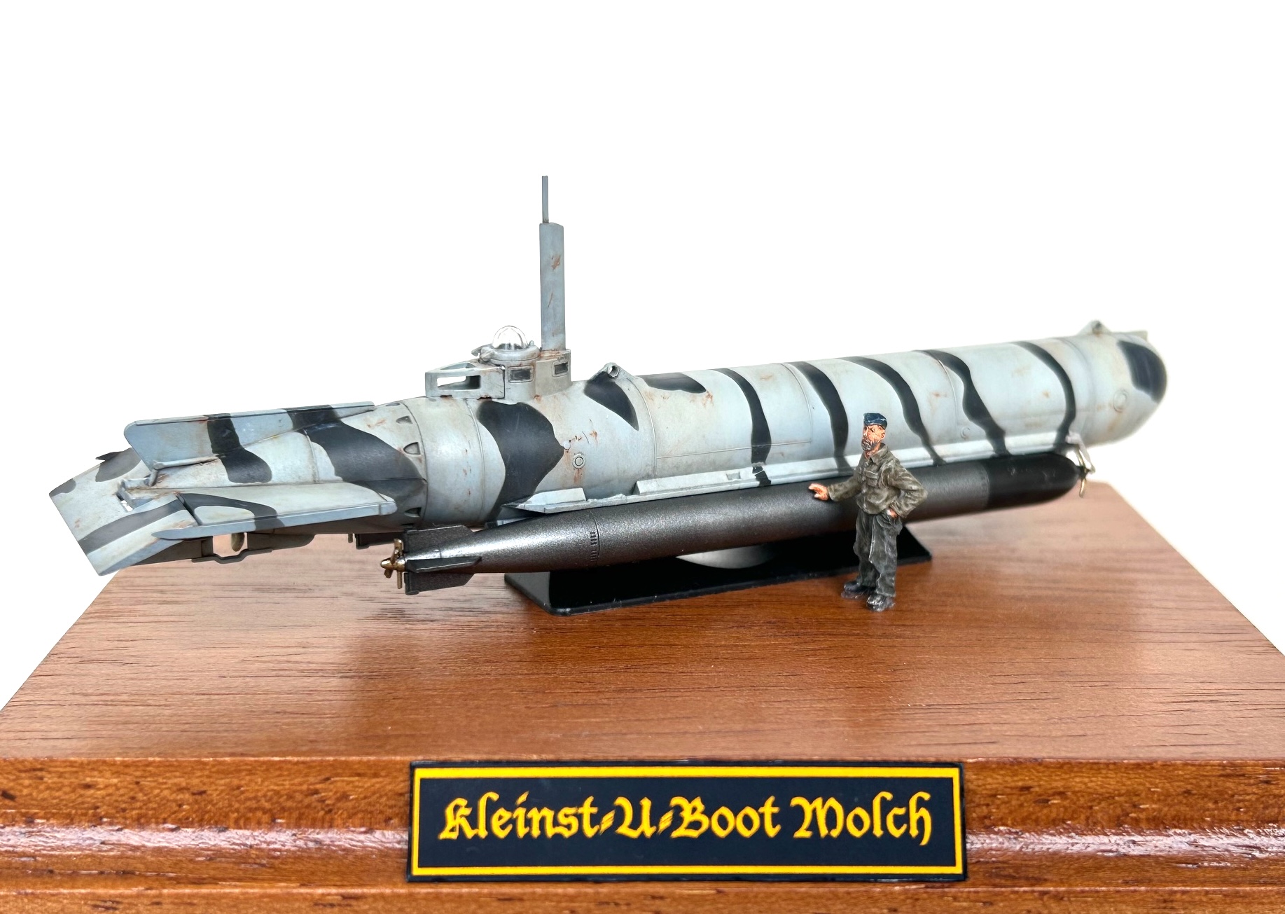 Das Vorbild: Der Molch war ein in Serie produziertes Ein-Mann Kleinst-U-Boot für die Kleinkampfverbände der deutschen Kriegsmarine während des Zweiten Weltkrieges. Sein unbefriedigendes Seeverhalten führte jedoch dazu, dass der Molch erst sehr spät zum Fronteinsatz herangezogen wurde. Bis Januar 1945 wurden 363 Stück produziert. Zugunsten des Kleinst-U-Bootes Seehund, wurde dann die Fertigung eingestellt.