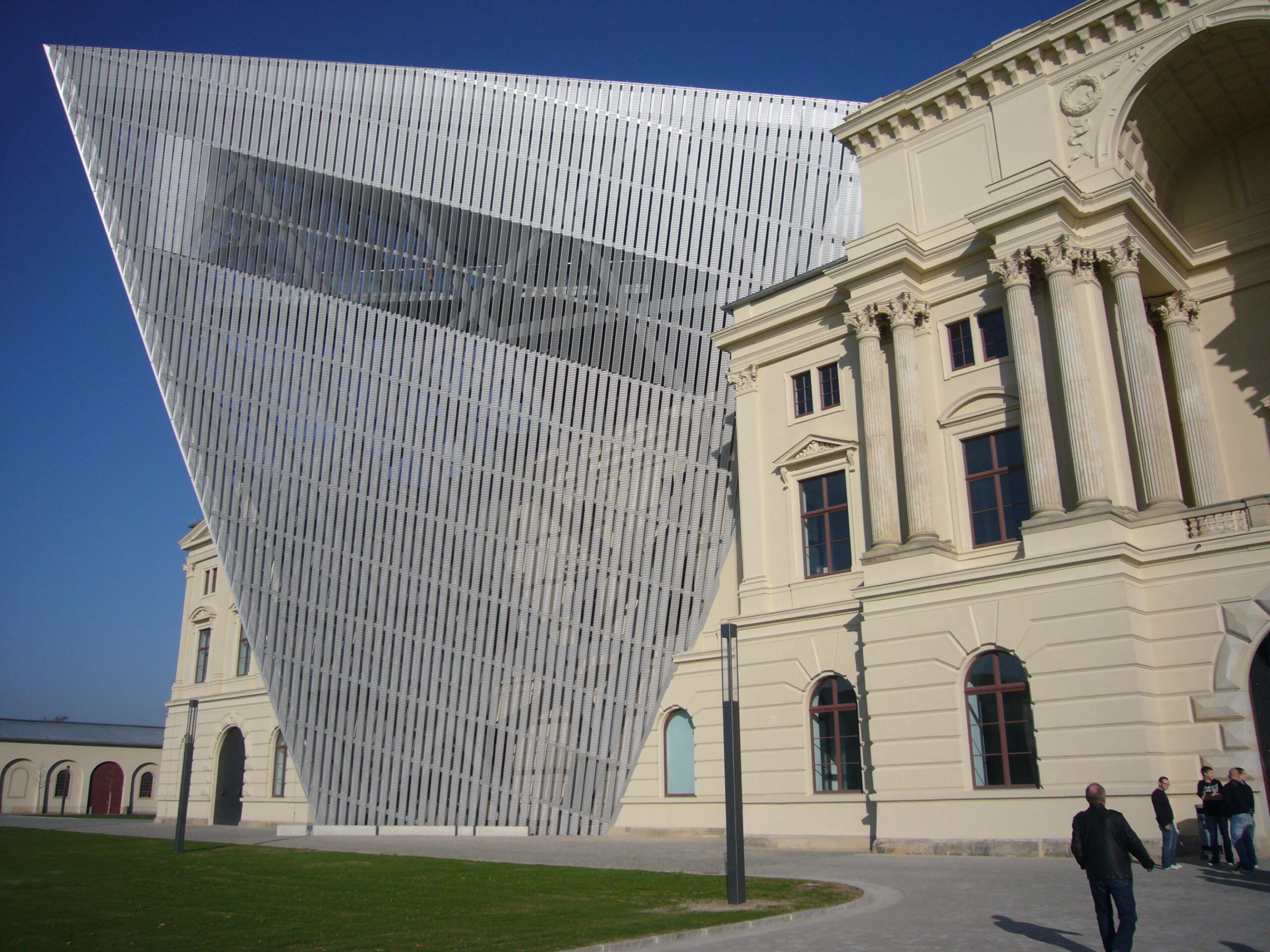 Steht man vor dem riesigen Gebäude, provoziert bereits die von Daniel Libeskind im Jahr 2011 neu gestaltete Fassade nach dem Motto „Klassizismus prallt auf Moderne“. Ein riesiger, aus Metall und Beton gestalteter Keil in V-Form durchdringt den eher schnörkeligen Museumsbau sowohl innen wie auch außen. Man merkt bereits jetzt: Dieses Militärmuseum scheint anders zu sein.