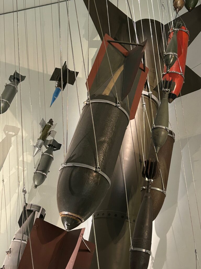 Weiter geht es dann zu den Räumen, die sich thematisch mit dem Zeitraum 1300 – 1914, Militär und Technologie sowie Schutz und Zerstörung befassen. Obwohl man zeitlich in der Regel eine grobe Orientierung hat, ist es bei diesem Museum eher so, dass Kontext und Thema Vorrang gegenüber Zeit und Provenienz besitzen. So sieht man auch in einem Gang diverse Bomben aus verschiedensten Kriegen und Nationen bedrohlich von der Decke hängen, wodurch man fast automatisch den Kopf einzieht und versucht, einer potenziellen Gefahr zu entfliehen.