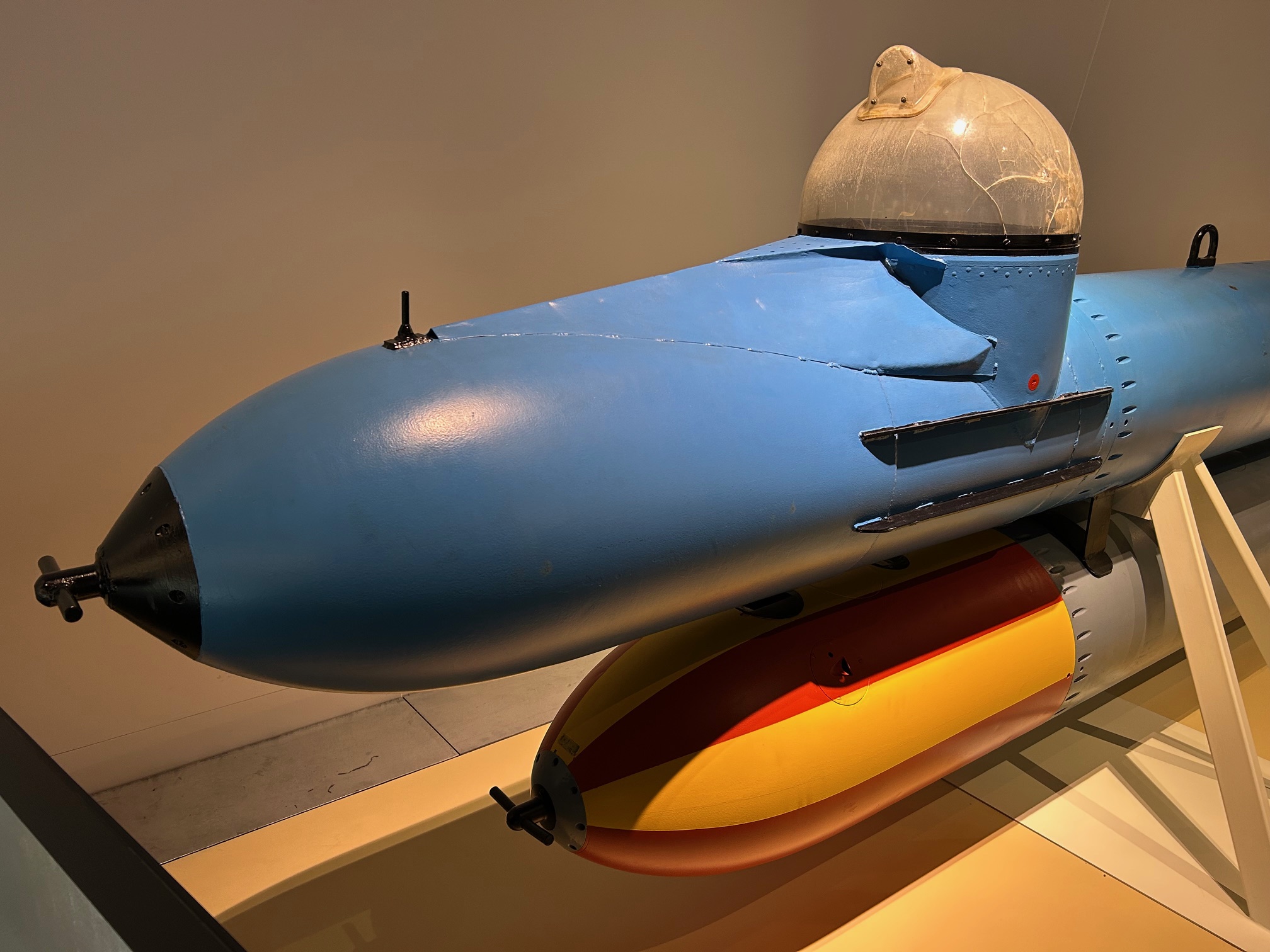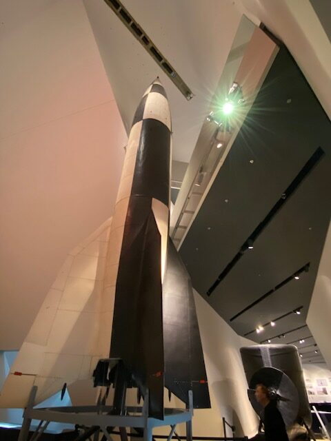 Erkundet man eine der Ecken im Erdgeschoss, steht man völlig unerwartet und überraschend vor einer sehr gut restaurierten V2-Rakete, die sich über mehrere Stockwerke in die Höhe reckt.