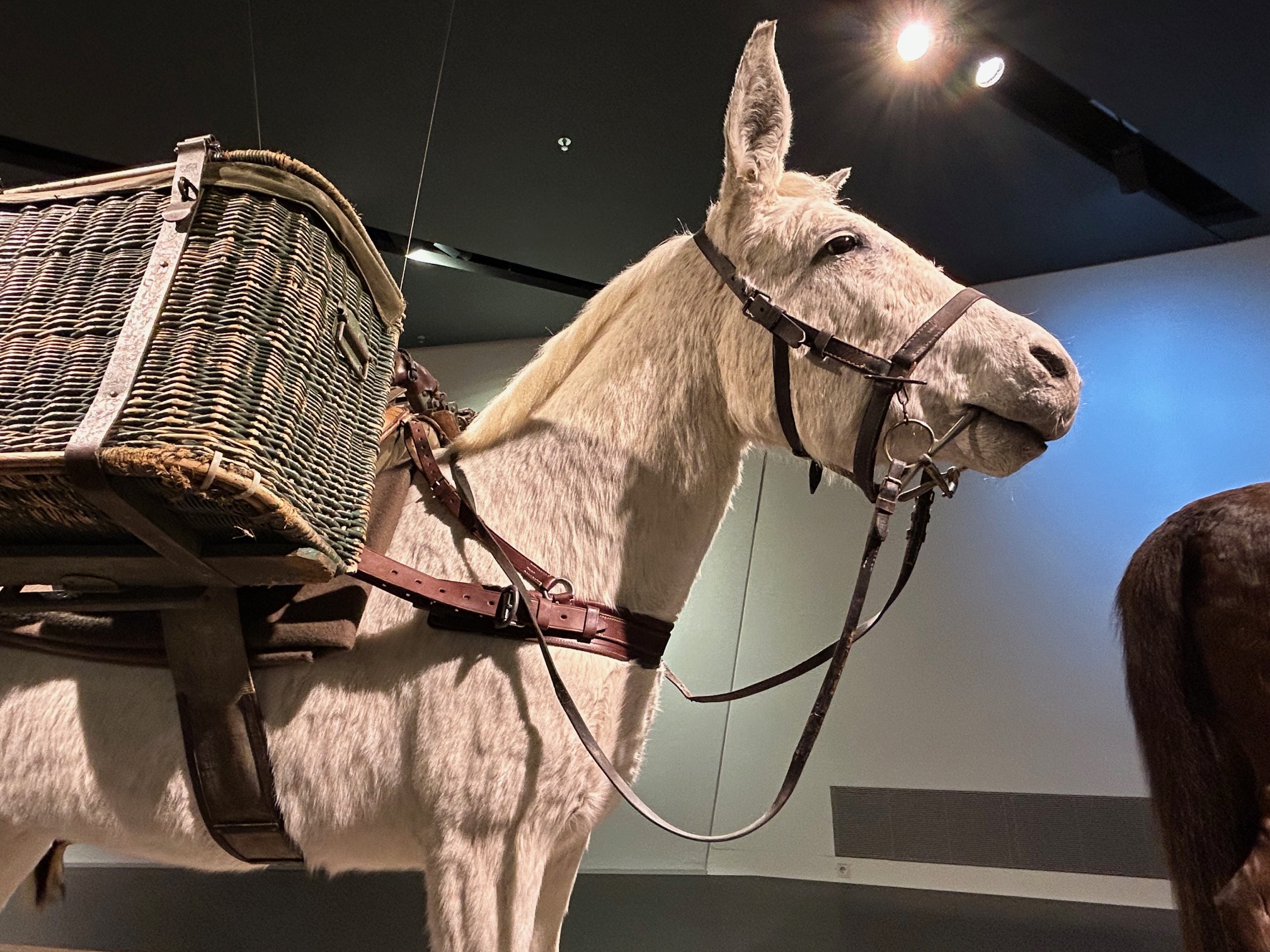 Auf der nächsten Ebene hat mich ein Arrangement besonders beeindruckt, bei dem mittels professionell präparierten lebensgroßen Exponaten die Rolle von Tieren beim Militär aufgezeigt wird. Angeführt von einem Elefanten (die Nutzung von Hannibal bei der Alpenüberquerung kennt man) geben sich Dromedar, Muli, Schlange, Taube, Hund, Wildschwein, Katze, Delphin und viele andere Tiere auf einer Art Bühne ein Stelldichein. Vor jedem Tier kann man sich dann über einen Monitor darüber informieren, welchen (nicht immer schönen) Beitrag gerade dieses im Kontext Militär geleistet hat und eventuell noch immer leistet. Vielleicht ist dem einen oder anderem bekannt, dass man Gänse bereits zu den Zeiten der Römer als verlässliche Alarmanlage genutzt hat, aber dass man auch heute noch auf Gänse für den Objektschutz insbesondere bei Munitionslagern vertraut, war mir nicht bewusst.
