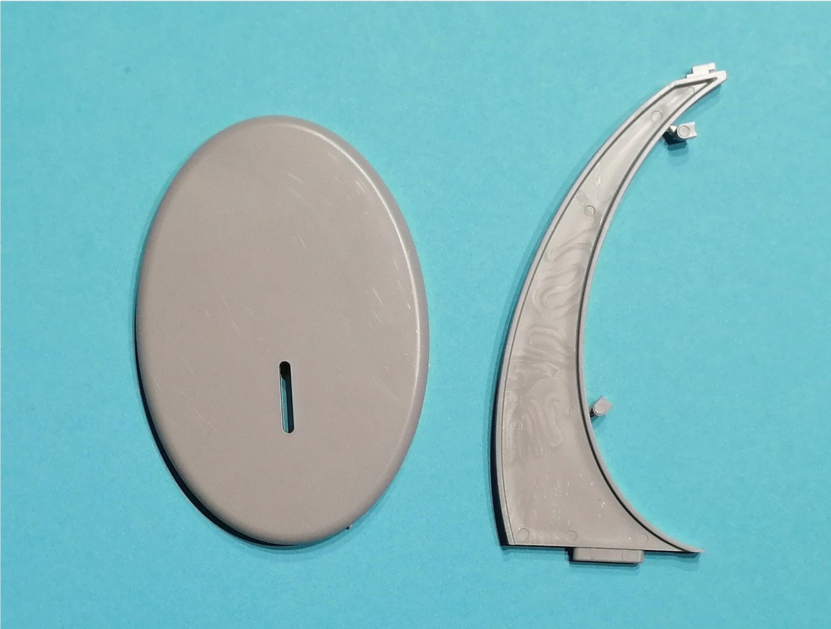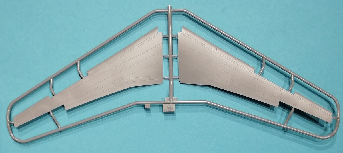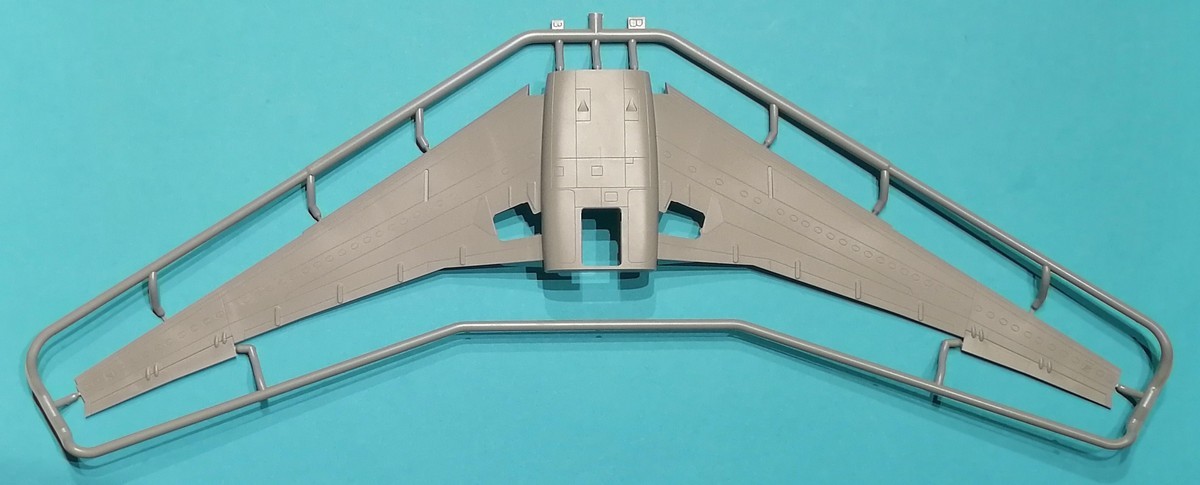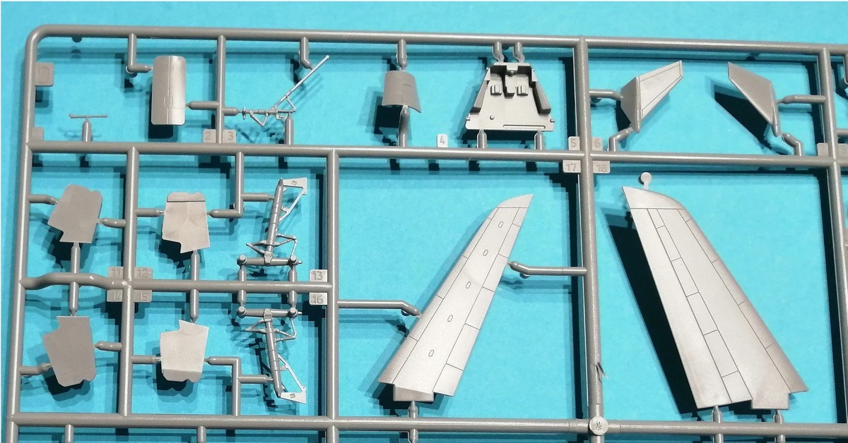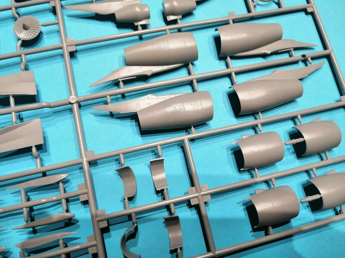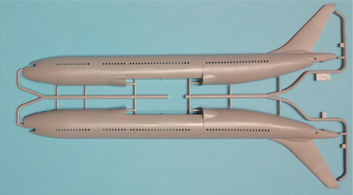Schauen wir aber nun auf die Bauteile im Konkreten. Der Rumpf ist über die gesamte Länge längsgeteilt. Die Gravuren sind gleichmäßig und nicht zu tief. Erhaben sind die Regenablaufbleche über den Türen dargestellt. Einzelne Bauteile sind das Radom und das Seitenruder, was eine gute Lösung ist. Wie schon gesagt, wird oberhalb des Ansatzes der Tragflächen ein separates Bauteil mit dem WBF eingeklebt. Die Fenster der Passagiere und des Cockpits sind durchbrochen dargestellt und es gibt entsprechende Bauteile auf dem Rahmen aus klarem Plastik. Hier müssen die Modellbauenden jeweils vier der einzuklebenden Streifen kürzen. Wo dies zu geschehen hat, sind entsprechende Markierungen klar erkenntlich. Ein einfaches Cockpit ist vorhanden.