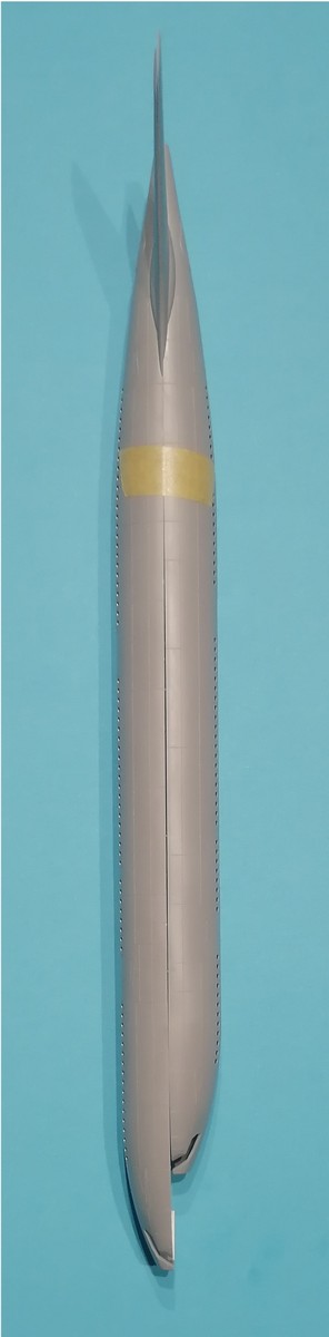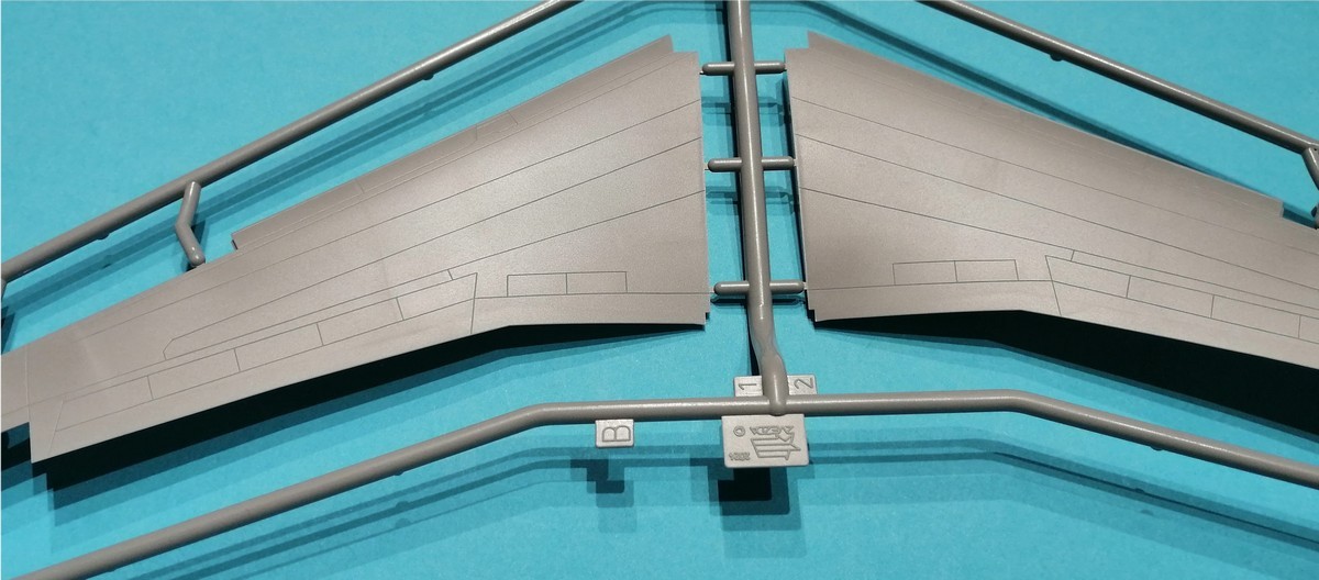 Laut der Bauanleitung soll das Bugfahrwerk gleich komplett montiert werden, was im weiteren Montagefortschritt dann einfach wieder erhöhte Bruchgefahr bedeutet. Ich würde versuchen, das Bugfahrwerk erst nach Abschluss der Hauptmontage zu verkleben. Ein Hinweis auf ein Gewicht in der Nase ist nicht gegeben, es kann sicherlich nicht schaden. Gut ist, dass die Antennen und Abläufe einzelne Bauteile sind. Dies gilt auch für die APU in Form der Bauteile D4 und D47. Kommen wir als nächstes zu den Tragflächen. Diese bestehen aus einem durchgängigen Unterteil und den beiden Oberteilen. Damit ergibt sich quasi automatisch die „richtige“ V-Stellung der Flügel. Die Hinterkante ist grundsätzlich zweiteilig, im Bereich der Querruder einteilig. Die Winglets und die Verkleidungen des Ladeklappenmechanismus sind wiederum separate Bauteile. Die einzelnen Bauteile D33/D34 der Flügelvorderkante hängen vermutlich mit einem möglichen vierstrahligen A340 zusammen. Die Höhenleitwerke entstehen aus jeweils zwei Teilen, wobei die Hinterkante einteilig ist.