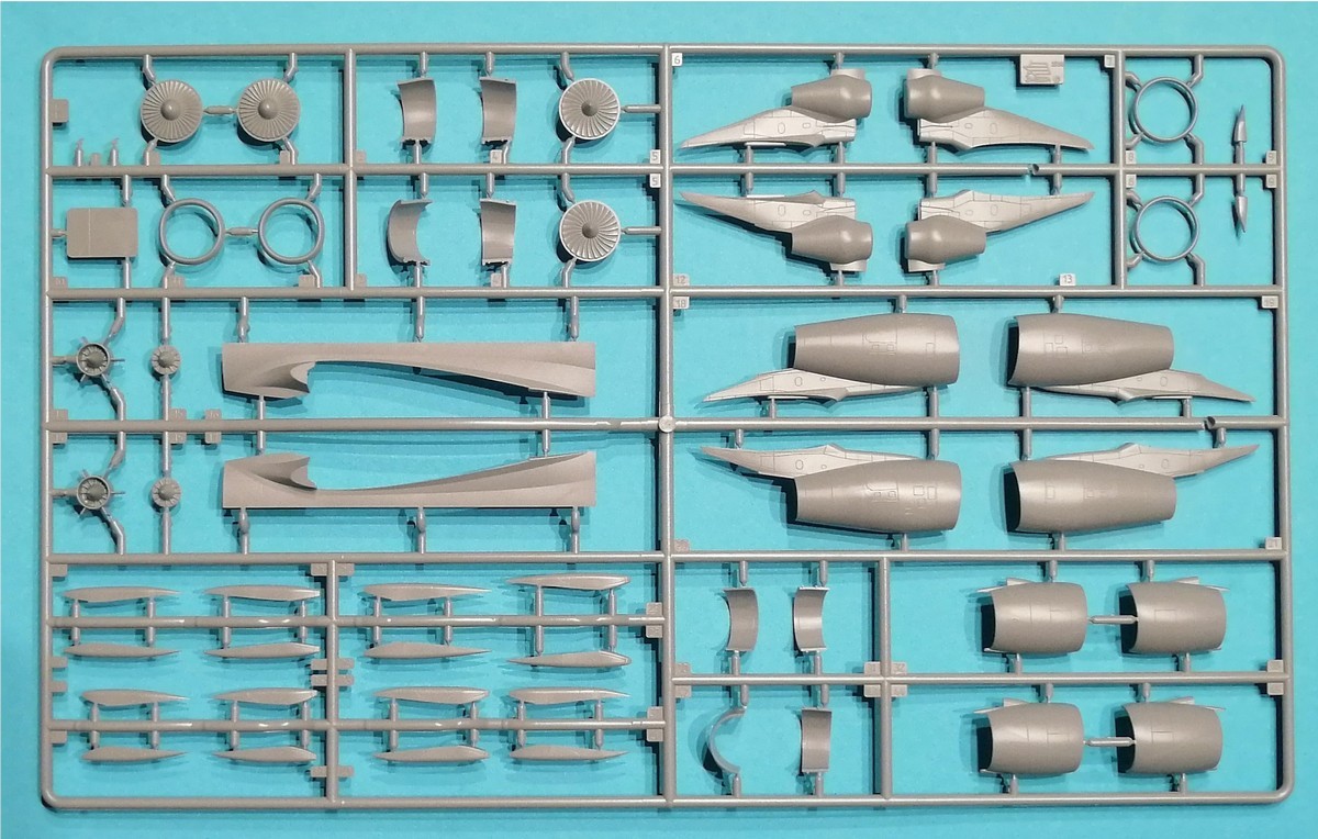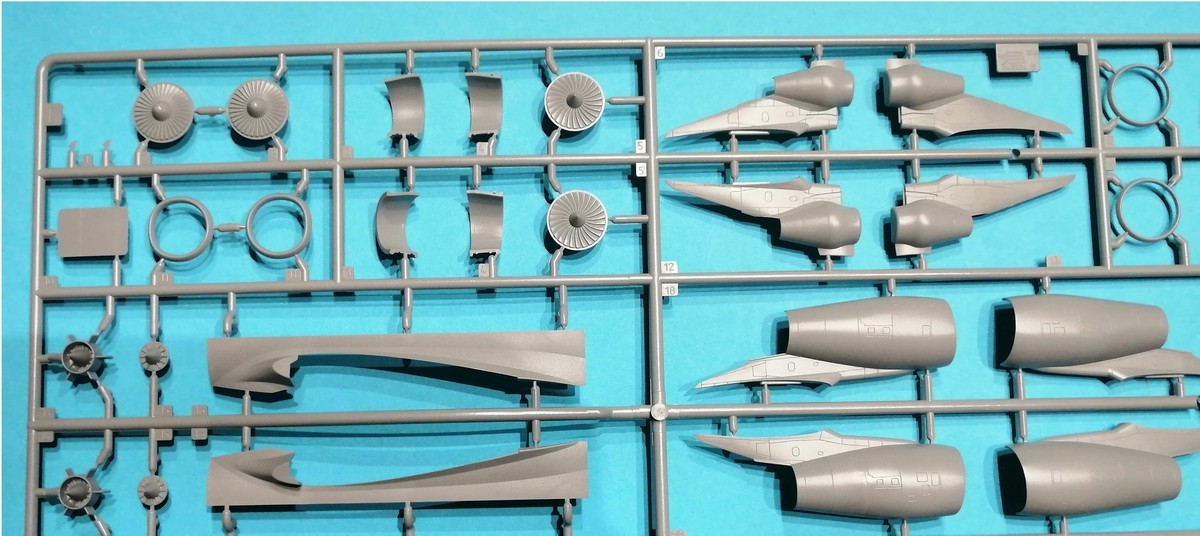 Als nächstes betrachten wir die Triebwerke. Im Karton finden wir wie schon gesagt das Trent 700 und das Pratt & Whitney PW4000, wobei diese entsprechend der gewählten Option genutzt werden. Die Triebwerke entstehen in üblicher Manier. Der Einlauf vor dem Fan ist zweiteilig, die entstehende Naht lässt sich aber sicherlich ganz gut bearbeiten, um sie unsichtbar zu machen. Der Einlaufring, Fan und der Auslass sind einzelne Bauteile, was die Lackierung erleichtert. Der Bau schließt dann ab mit der Montage des Hauptfahrwerks, welches sehr detailliert ist. Optional bietet Zvezda hier auch ein eingefahrenes Fahrwerk unter Verwendung des beiliegenden Ständers an.