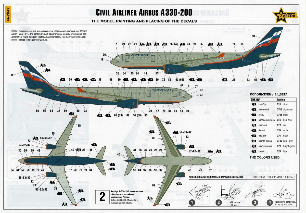 Anleitung/Bemalung: Der Bau des am Ende rund 41 cm langen Modells zeigt die S/W-Bauanleitung in elf Schritten klar und deutlich an. Farbangaben werden auch für Detailbereiche gemacht und beziehen sich auf die Systeme von Tamiya oder Zvezda. Für die grundsätzliche Farbgebung und Position der Abziehbilder liegt ein farbiges A4-Blatt bei. Aus dem Kasten lassen sich zwei Maschinen darstellen: