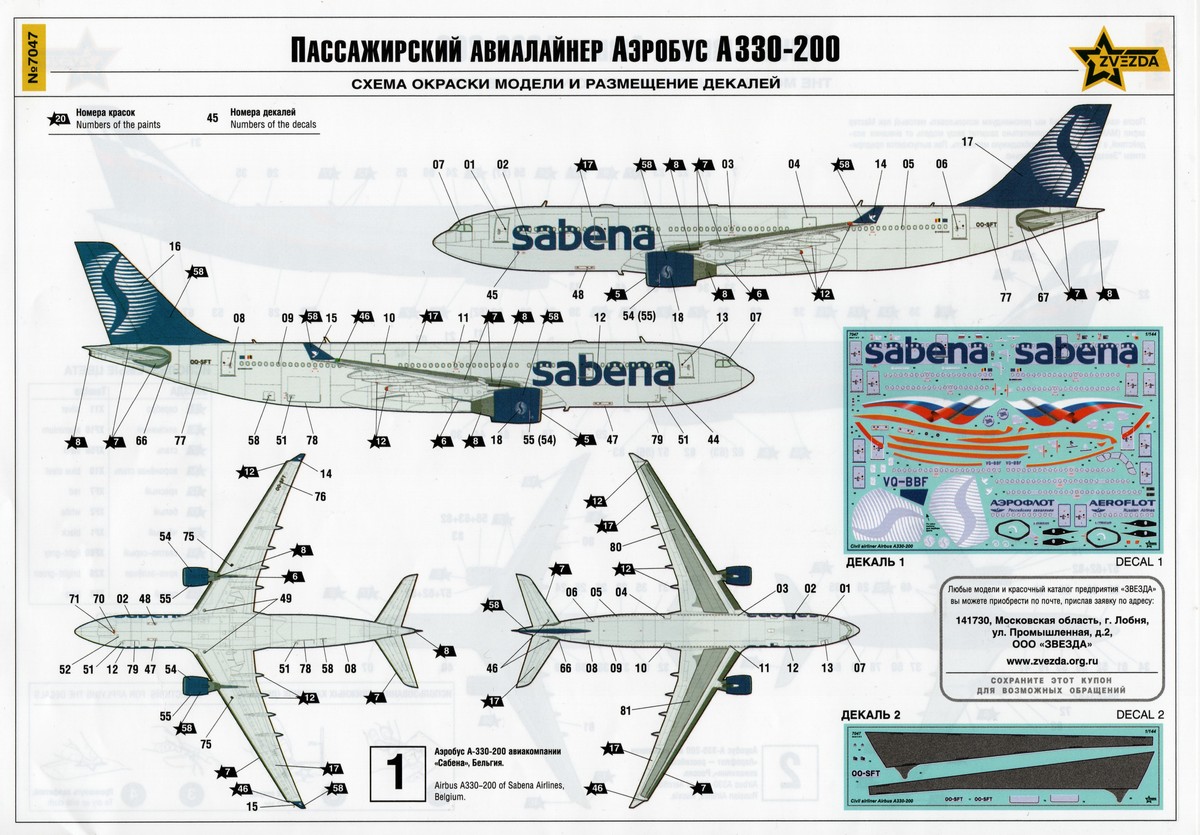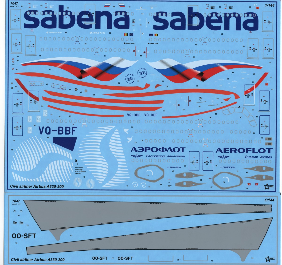 Die dafür notwendigen Nassschiebebilder finden sich auf zwei Bögen, welche neben den Elementen für die Airlines auch zahlreiche Stencilits enthalten sowie auch die Silverframes für die Fenster. Hervorheben möchte ich auch die vorhandenen große grauen Bereiche für die Tragflächen. Die großen Titel von Sabena sind zusammen mit den Fenstern und Türen gruppiert dargestellt. Fenster in Decalform werden nicht angeboten. Die glänzend gedruckten Abziehbilderbögen machen einen guten Eindruck in qualitativer Hinsicht.