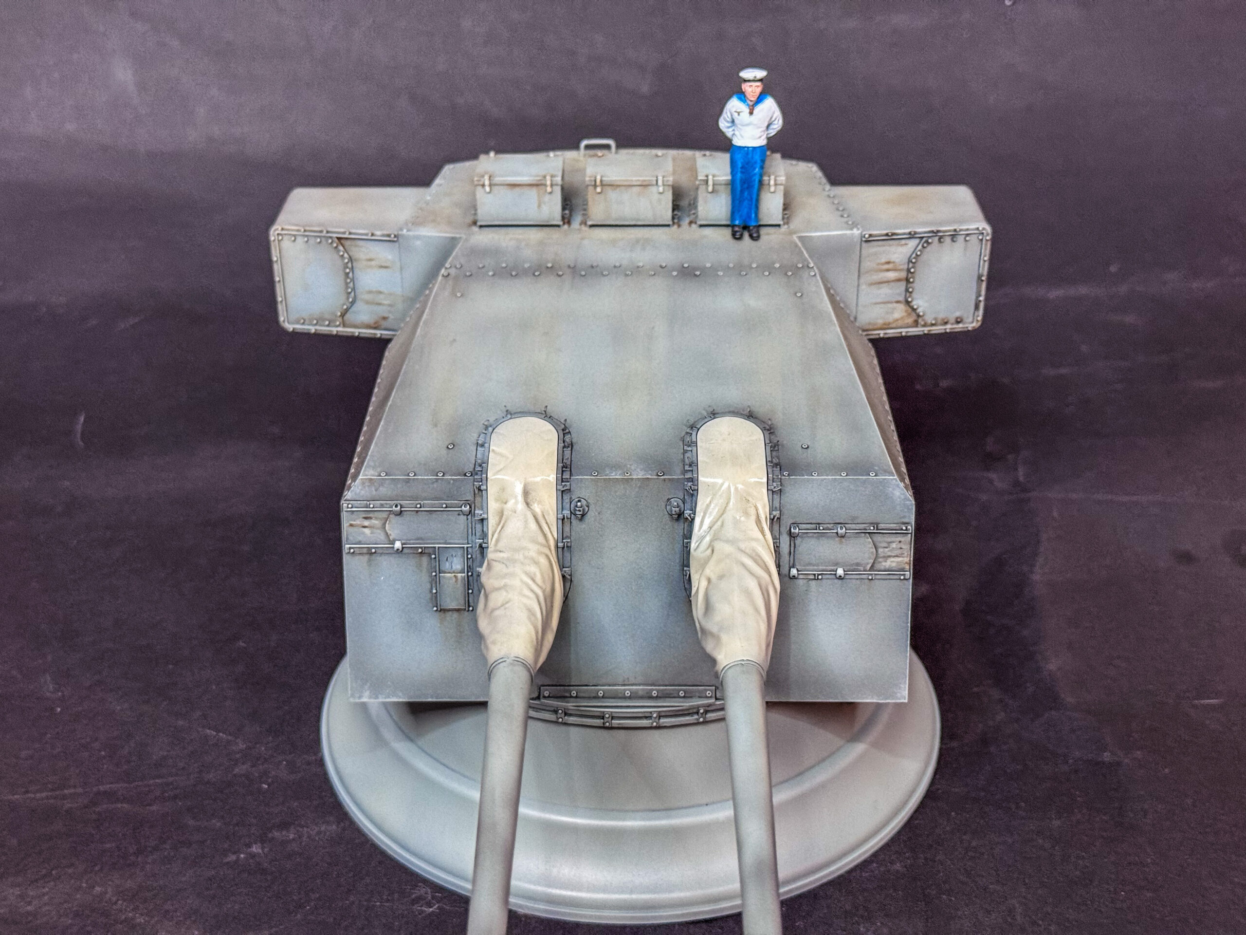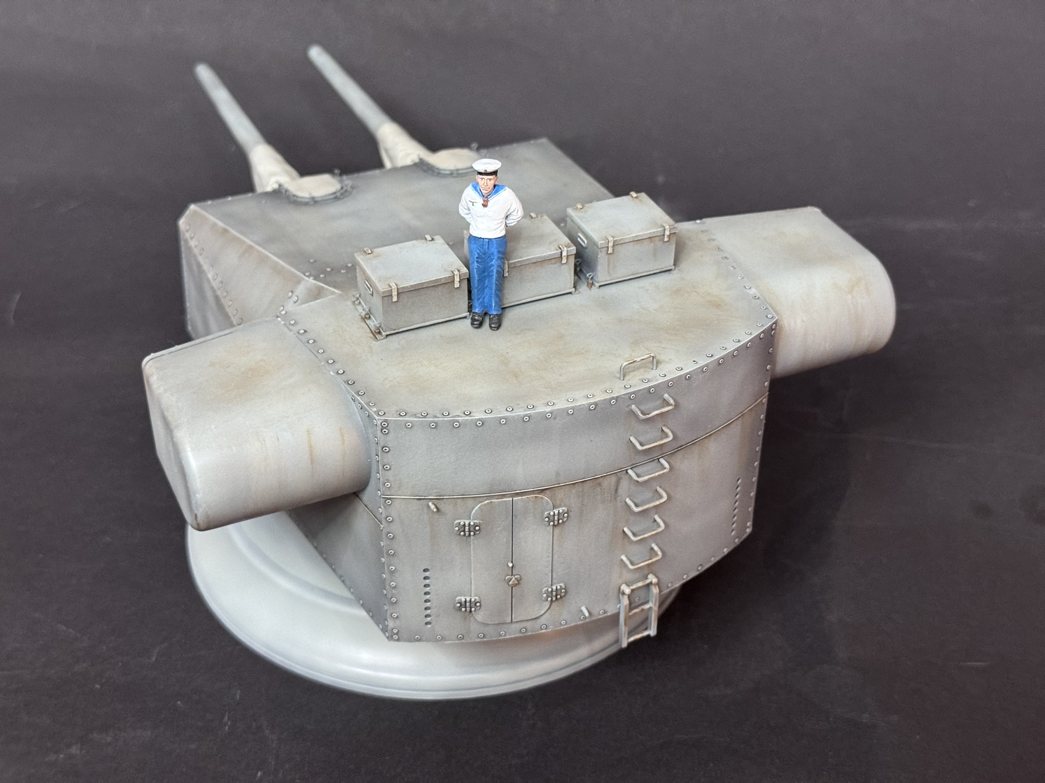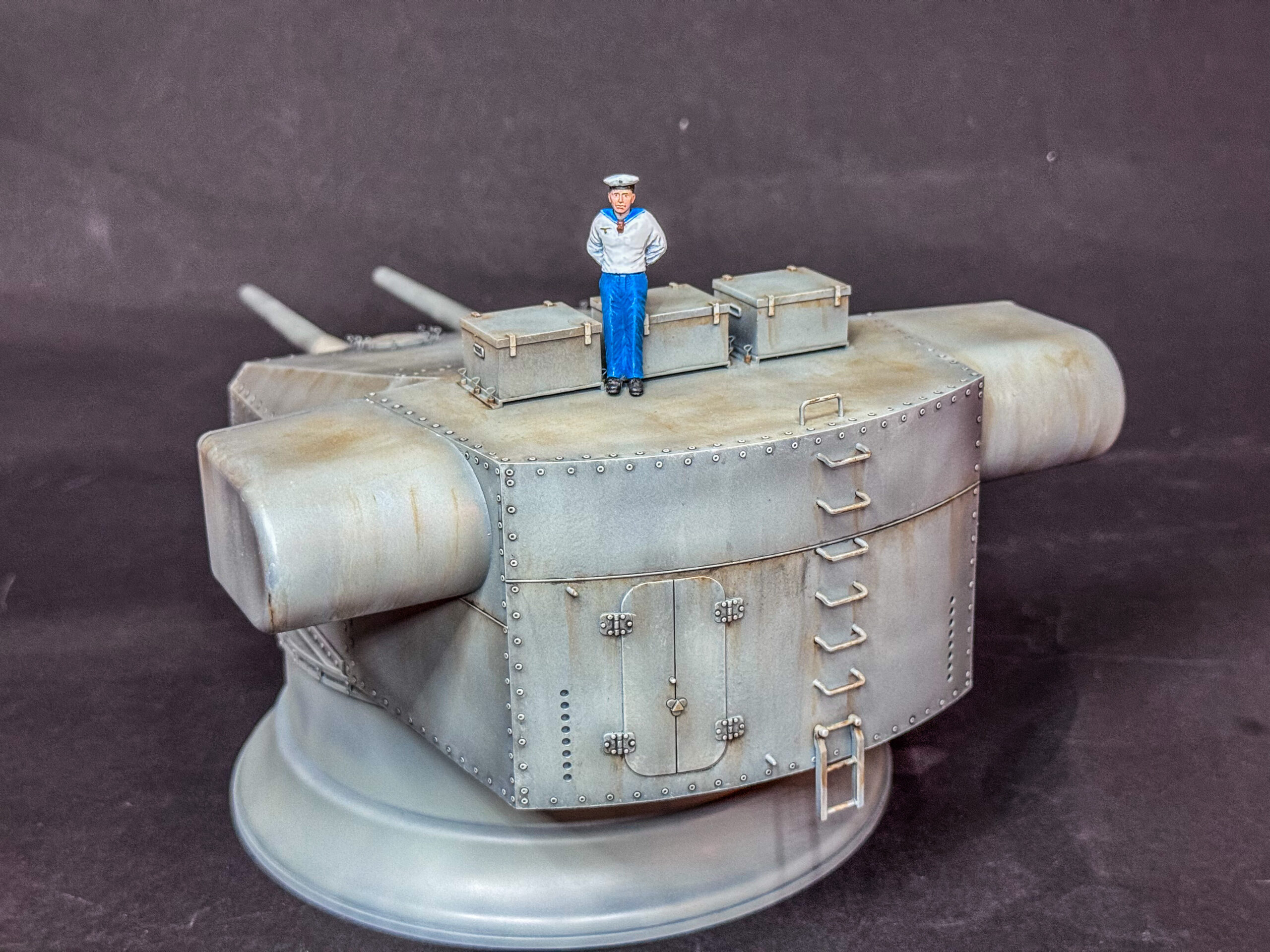 Danach folgte ein leichtes Panel-Wash mit Schwarz und grob wurde alles mit einem Rost-Wash bearbeitet. Ich weiß nicht, wie realistisch das Ganze nun aussieht aber ich fand es interessant und das Ergebnis gefiel mir, also war der Turm soweit fertig. Für den Größenvergleich besorgte ich mir noch einen Matrosen und das kleine Projekt war damit abgeschlossen. Ich hoffe, es gefällt euch.
