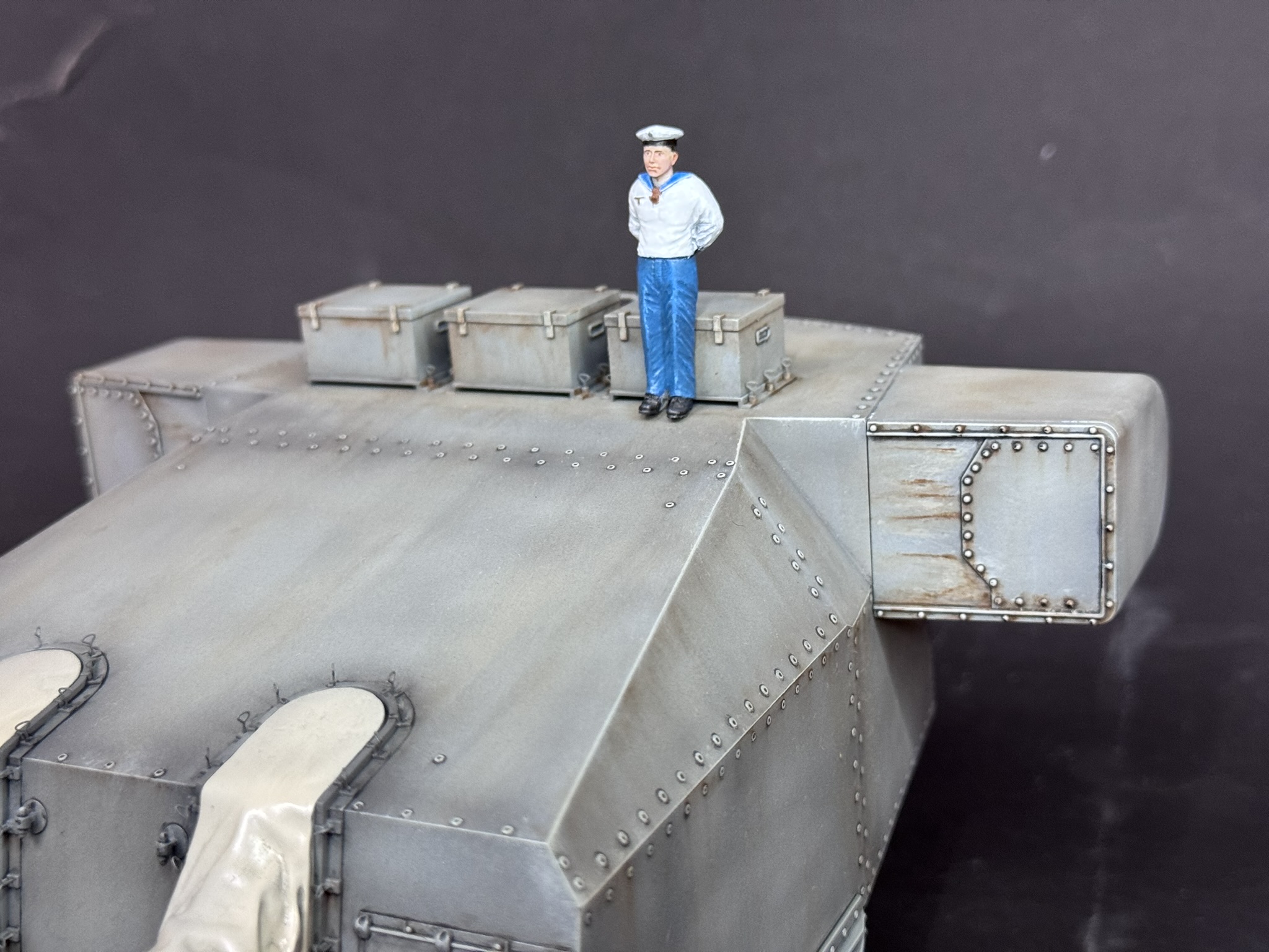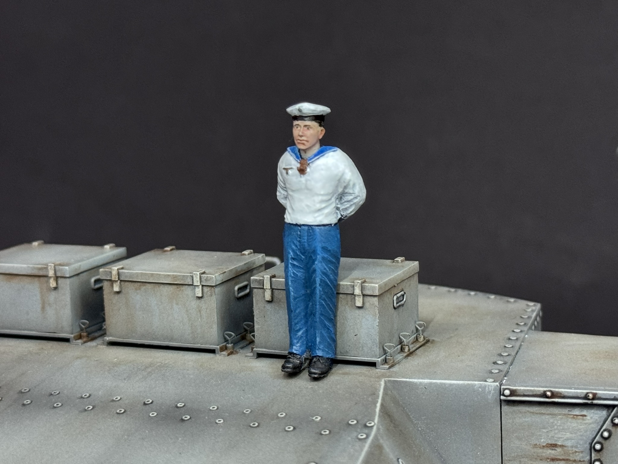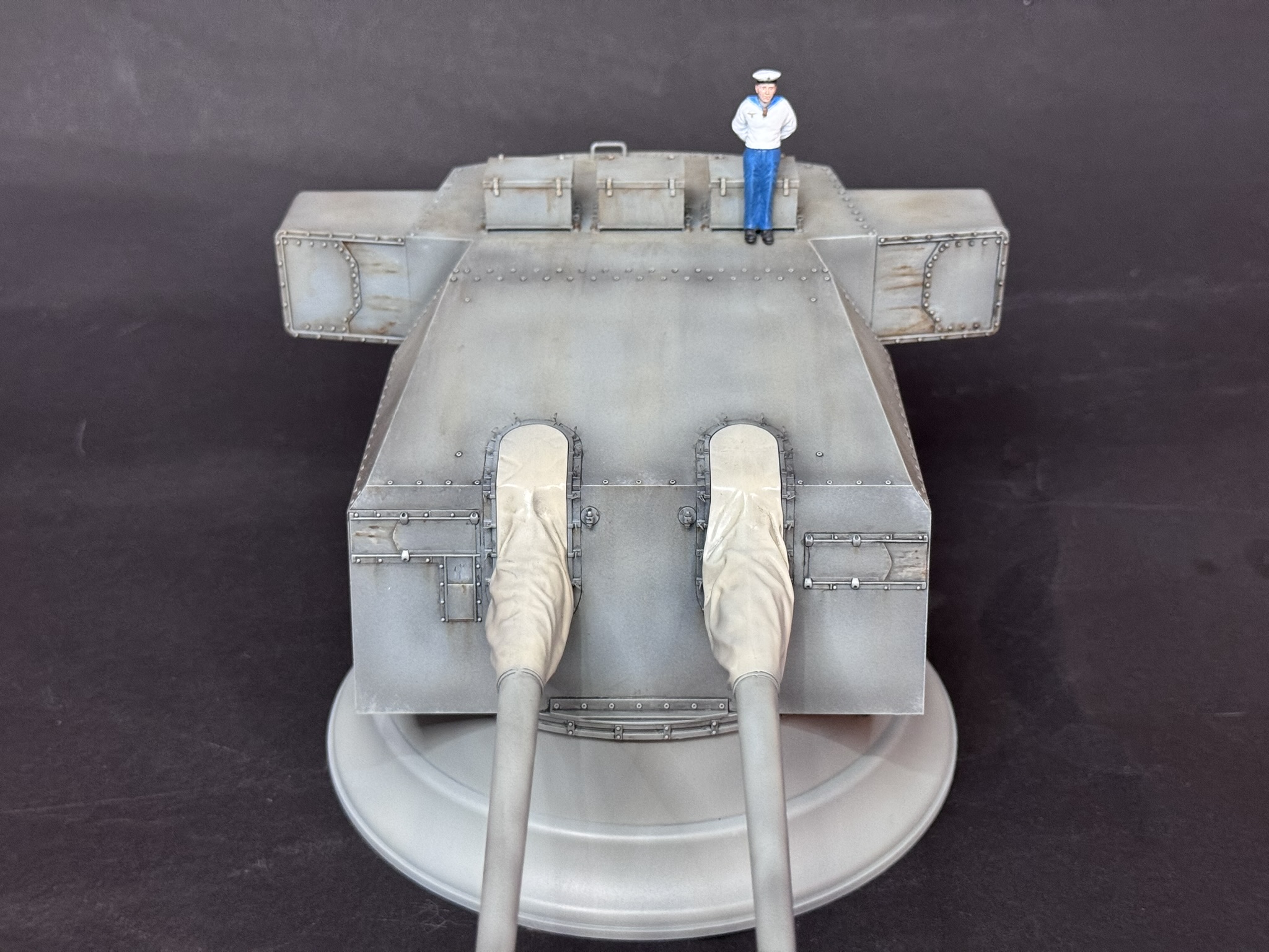 Danach folgte ein leichtes Panel-Wash mit Schwarz und grob wurde alles mit einem Rost-Wash bearbeitet. Ich weiß nicht, wie realistisch das Ganze nun aussieht aber ich fand es interessant und das Ergebnis gefiel mir, also war der Turm soweit fertig. Für den Größenvergleich besorgte ich mir noch einen Matrosen und das kleine Projekt war damit abgeschlossen. Ich hoffe, es gefällt euch.