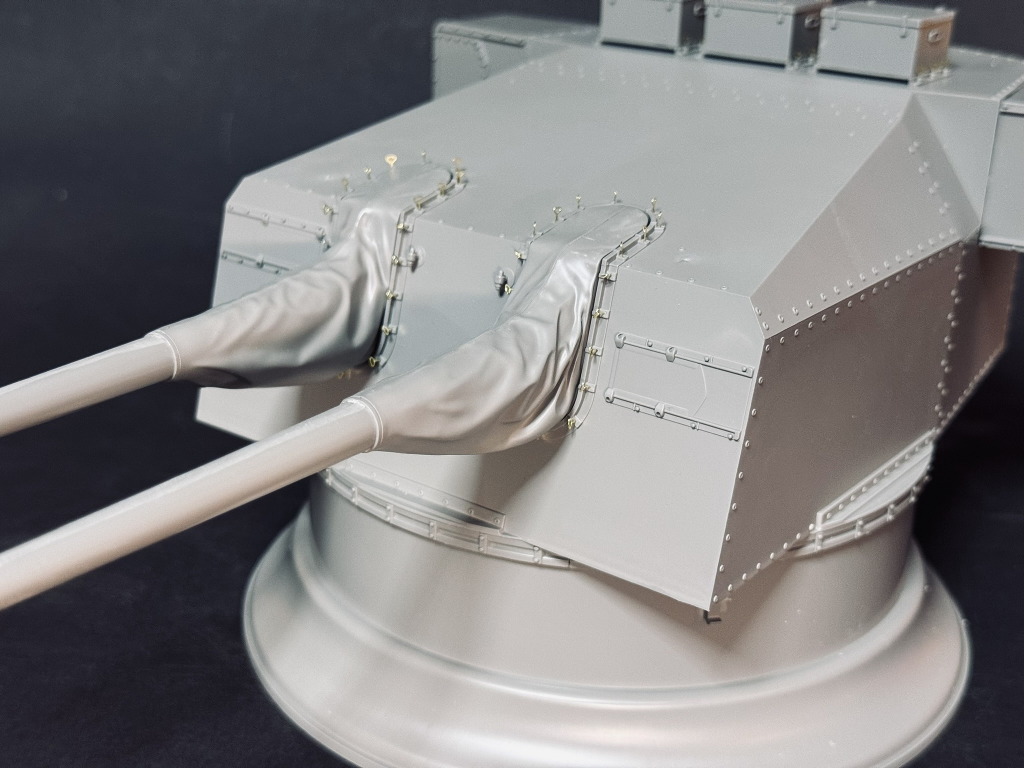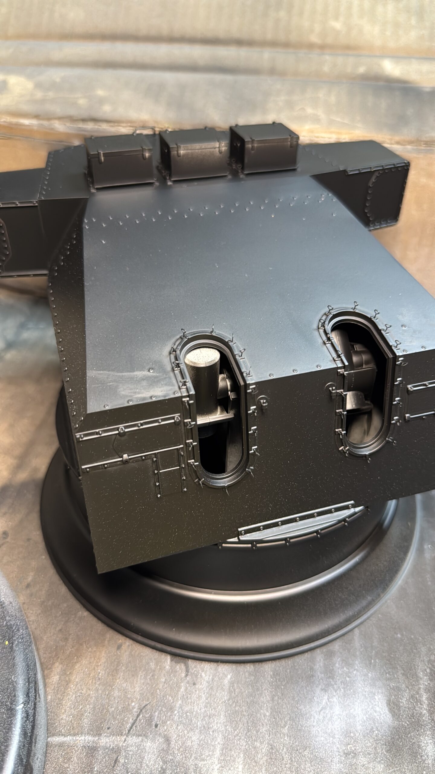 Soweit sah das Ergebnis eigentlich ganz nett aus aber da war noch mehr drin. Also fing ich an, jede Niete noch einmal mit einem helleren grau anzumalen und an den Kanten mit drybrushing ebenfalls mit einem hellen Grau noch etwas mehr Details auszuarbeiten.