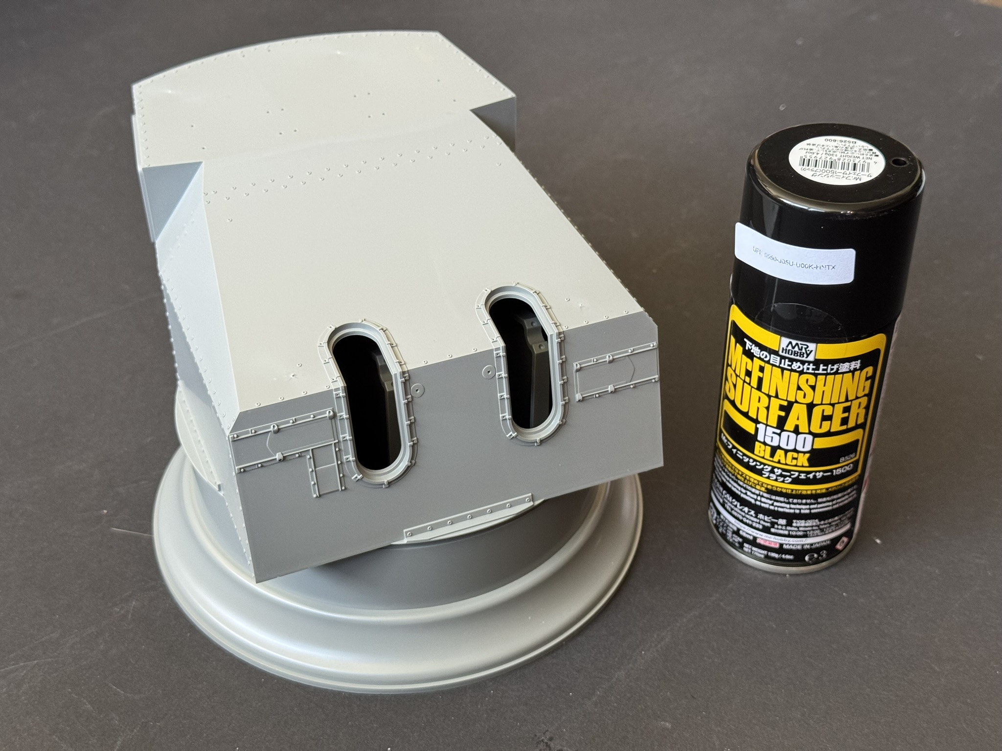 Nachdem der Turm zusammengebaut war, gab es wie immer eine Schicht Mr.Surfacer 1500 black als solide Basis für die Lackierung.