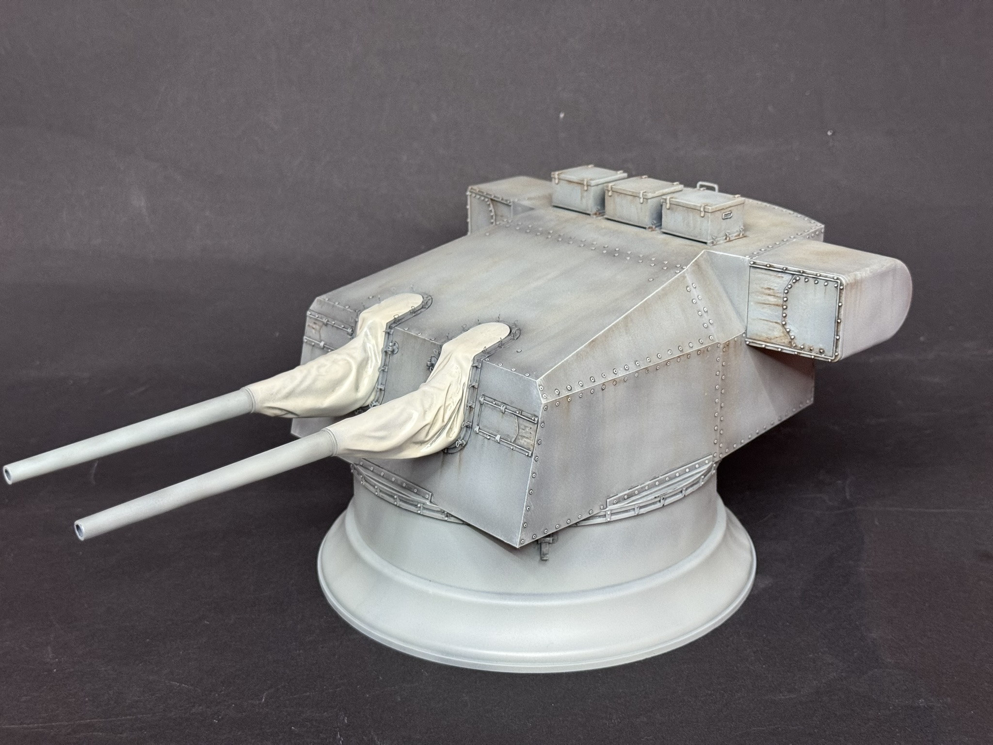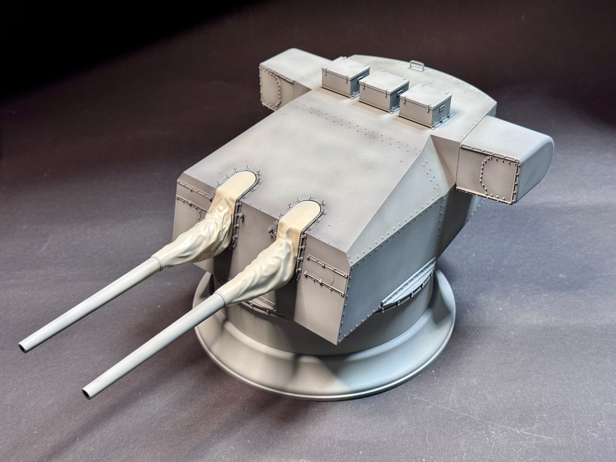 Solche Projekte sind für mich immer ein kleines Experiment. Farbfotos sind fast nicht zu finden und von der Alterung im Detail möchte ich gar nicht erst anfangen. Also tastete ich mich langsam ran, zunächst wurde alles mit einem hellen Grau lackiert und als ich den Turm so sah, entschied ich mich für ein leichtes Post Shading mit einem dunkleren Grau.