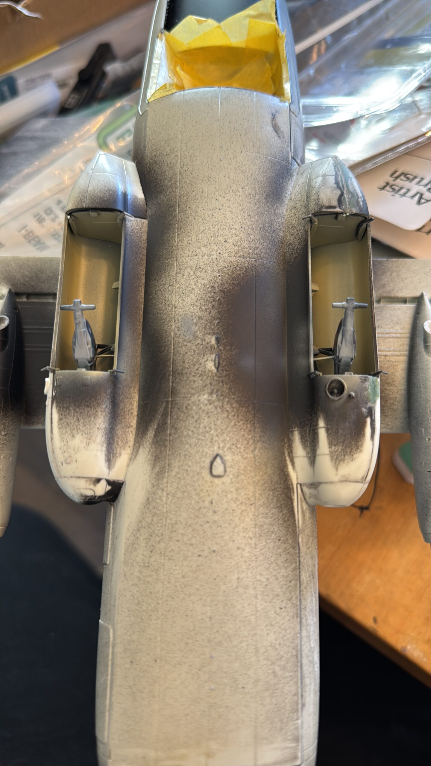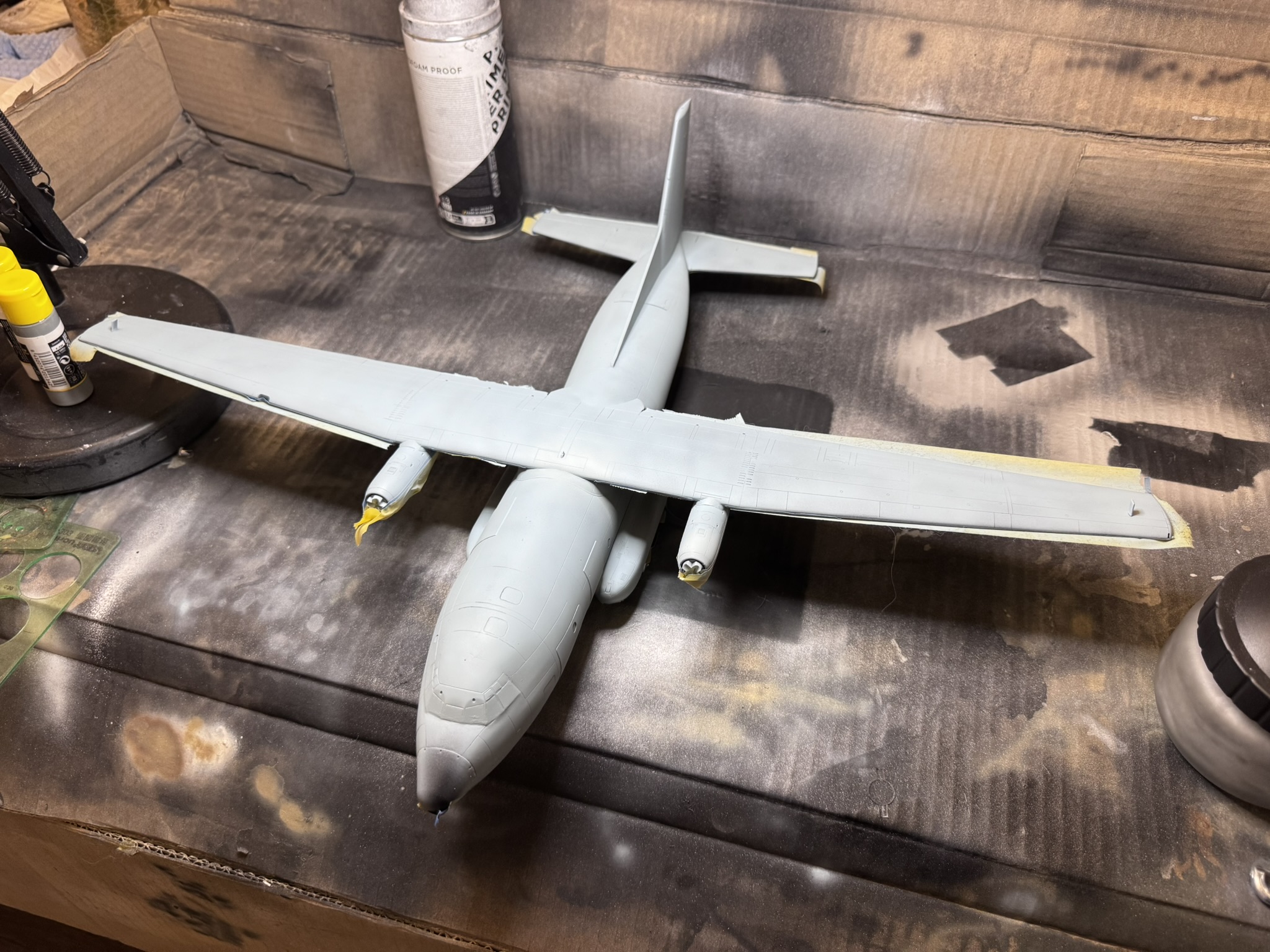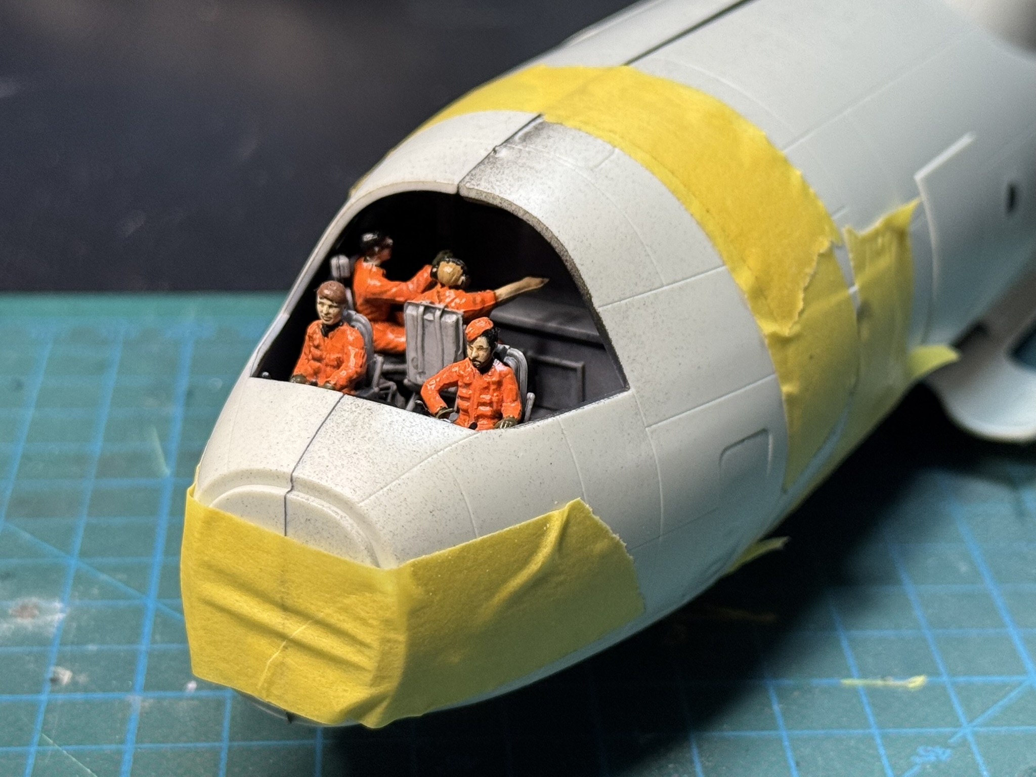 Der schwerste Teil war damit erledigt. Die Glaskanzel sowie die Flügel passten allerdings eher schlecht und mussten stark verschliffen werden. Hier konnte ich erneut meine nur mäßigen Fähigkeiten im Nachziehen der Panellines unter Beweis stellen. Die Idee von Revell, den großen Flügel einfach oben draufzulegen, war sicher gut gemeint, passte aber überhaupt nicht, sodass auch hier wieder einiges an Material abgetragen werden musste.