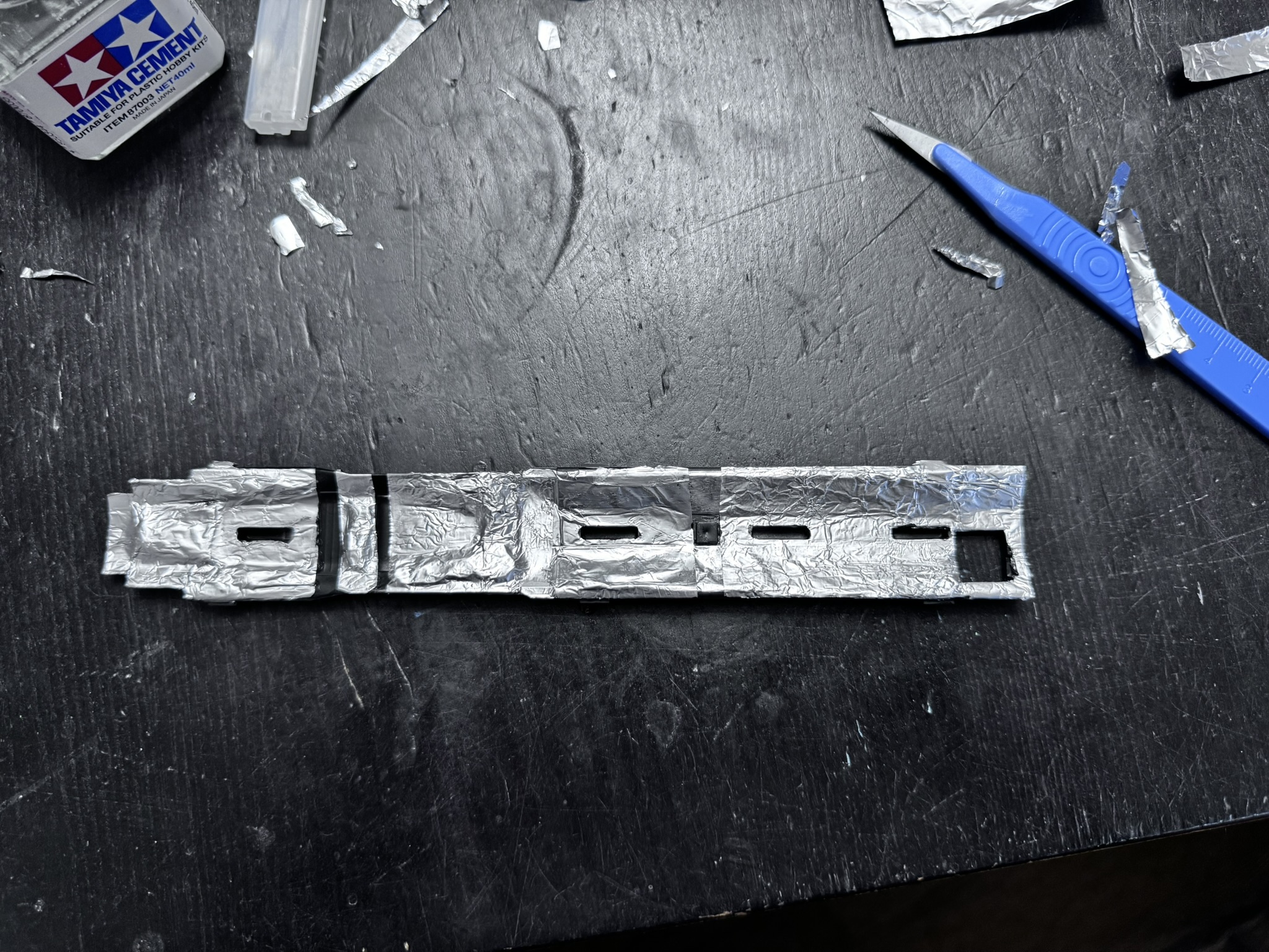 Um die Isolierung nachzubilden, experimentierte ich mit Alufolie, mit erstaunlich gutem Ergebnis. Für den Boden griff ich auf ein C-130-Bodenteil von Eduard zurück und versetzte die Rollen in eine neue, passende Position.