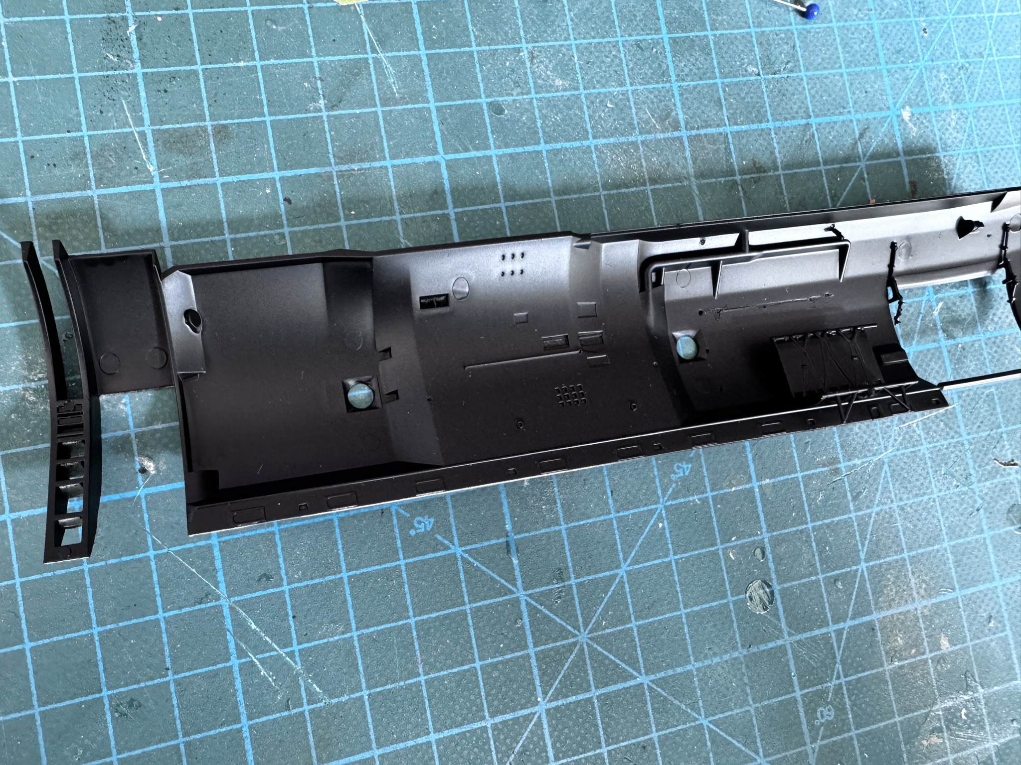Ach ja, die Batteriebox, da sie über der oberen Laderampe sitzt, musste ich irgendwie mit dem Finger herankommen. Dadurch konnten die Streben an der unteren Rampe nicht montiert werden, und die Rampe saß auch etwas zu tief. Eigentlich müsste sie horizontal ausgerichtet sein, aber dann hätte ich mit meinem dicken Finger nicht mehr an die Batterie gelangt.