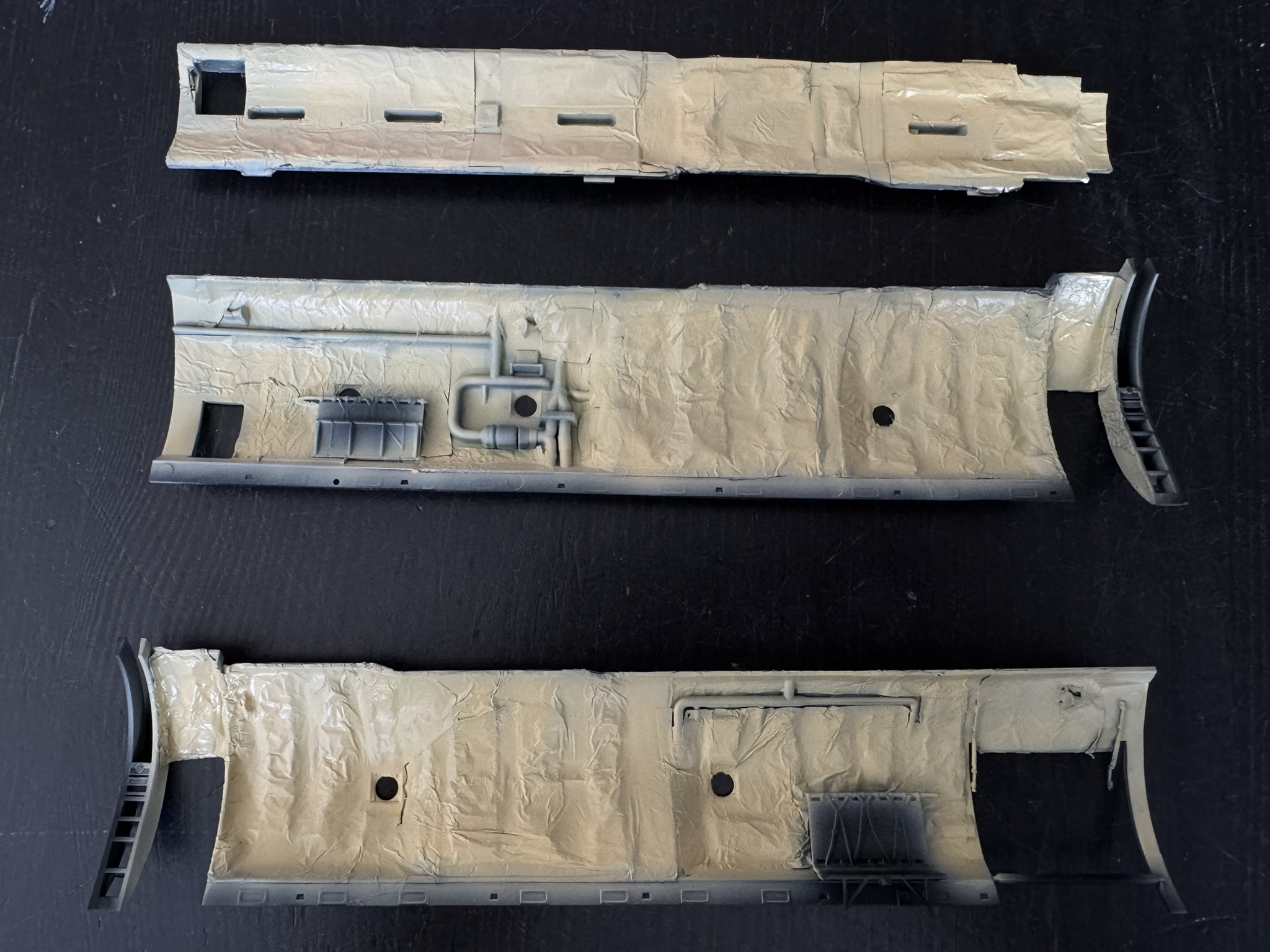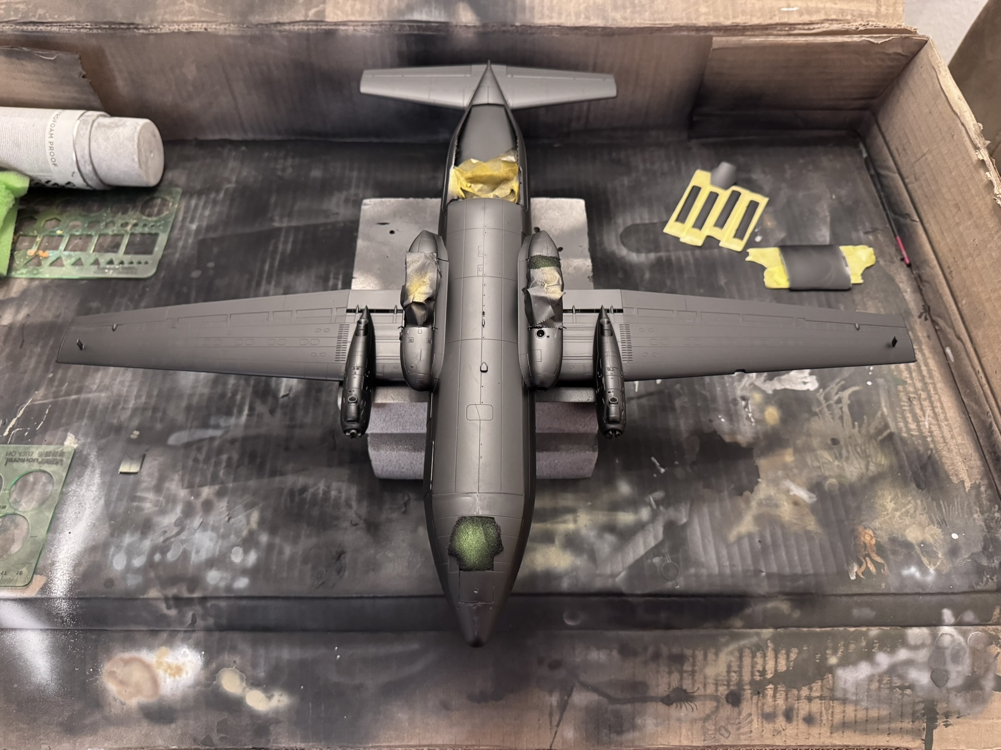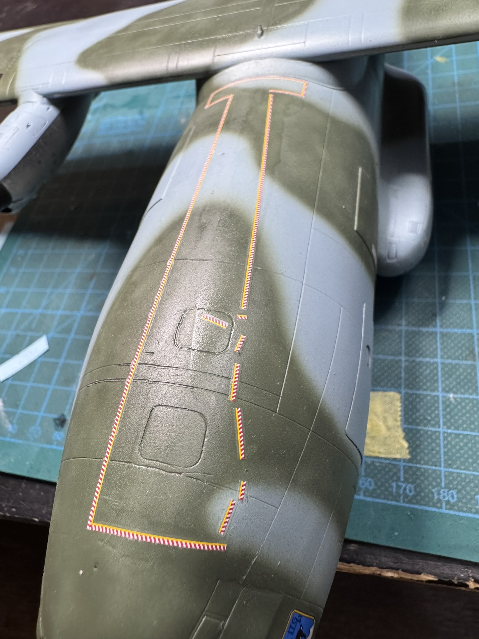 Nun konnte die Grundierung aufgetragen werden – wie immer nutze ich Mr. Surfacer 1500. Danach kam eine Schicht Aluminium auf die Unterseite. Für die Tarnung verwendete ich die von Revell angegebenen Farben. Dabei kam mir das Grün allerdings recht hell vor im Vergleich zu den Originaltönen jener Zeit, doch ich schob das auf die eingeschränkte Bildqualität der damaligen Kameras.