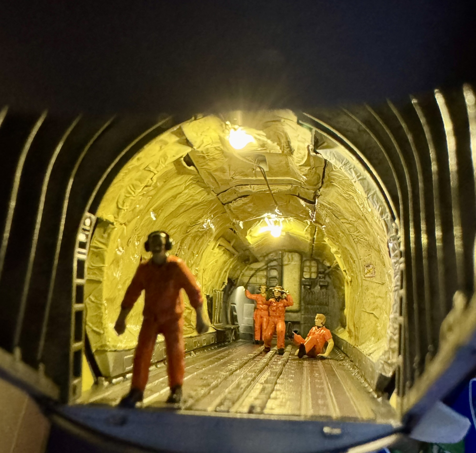 Problematisch waren auch die Figuren im Cockpit, sie waren schlicht zu hoch. Am Ende passte die kleine Kanzel zwar drauf, aber die Piloten mussten sich nun etwas ducken, um überhaupt noch etwas sehen zu können. Als kleines Highlight habe ich LEDs im Innenraum verbaut, wobei die Batteriebox unter der oberen Laderampe ihren Platz fand. Später stellte sich allerdings heraus, dass diese Position nicht ganz so clever gewählt war.