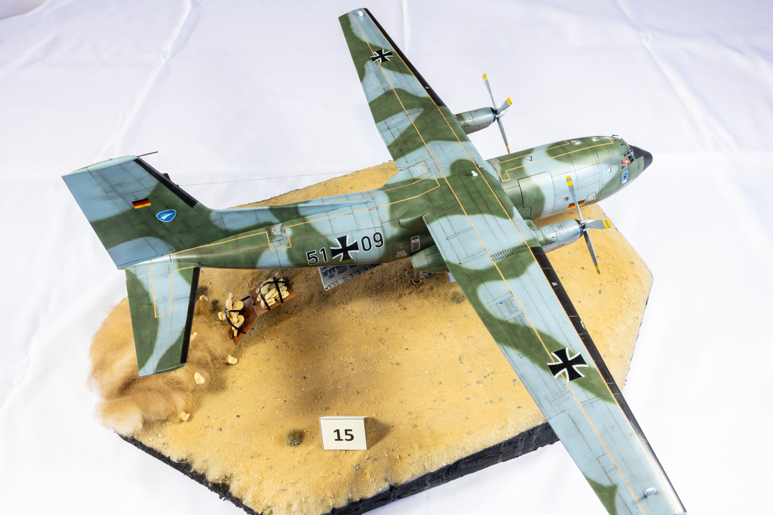 Beim Treffen 2024 in Gatow hatte ich die Gelegenheit, die dort ausgestellte Transall ausführlich zu besichtigen und mich mit einem Bundeswehr-Veteranen über die Einsätze in Afrika zu unterhalten. Dabei erfuhr ich von den ersten Palettenabwürfen im Tiefstflug mit der Transall, und wie dieses Verfahren damals entwickelt wurde. Als das Thema für 2025 bekanntgegeben wurde, stand für mich sofort fest, dass ich diesen Abwurf in einem Diorama darstellen wollte.