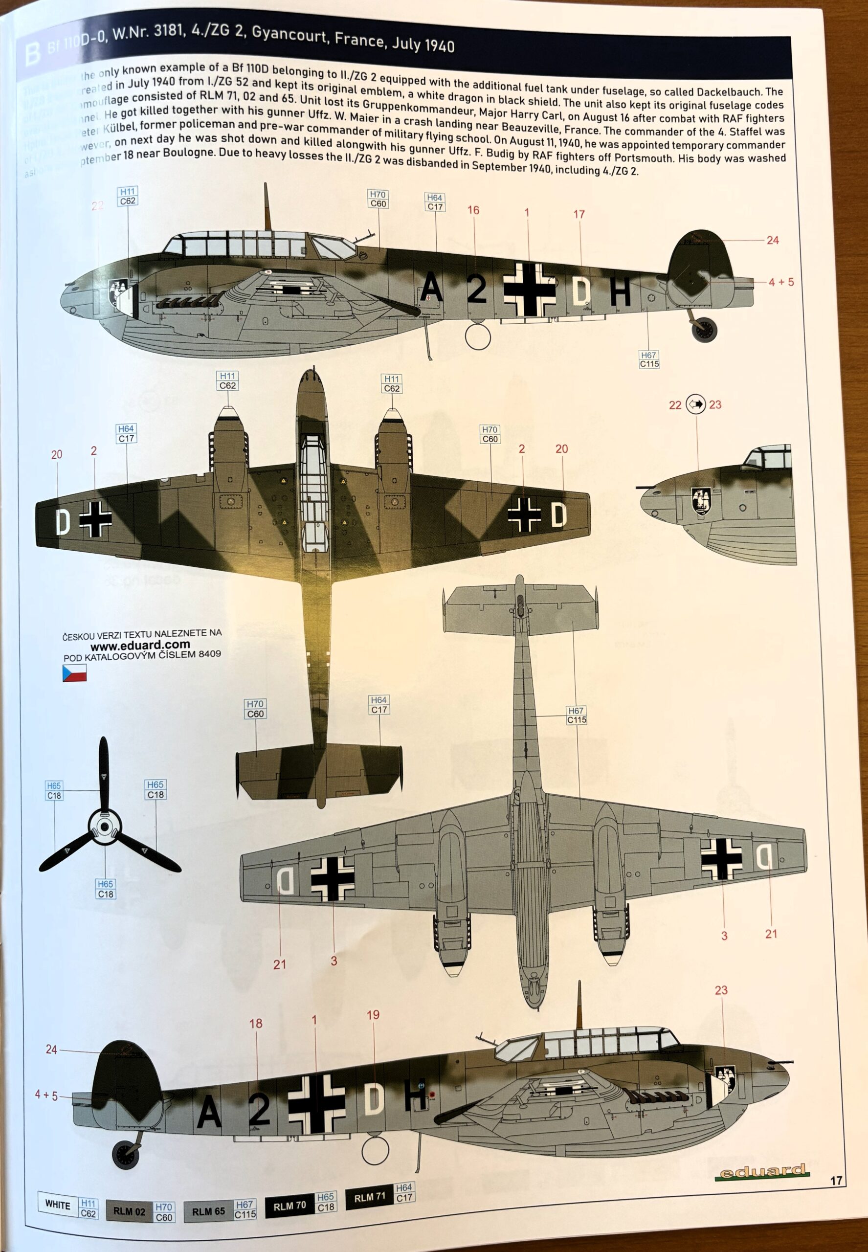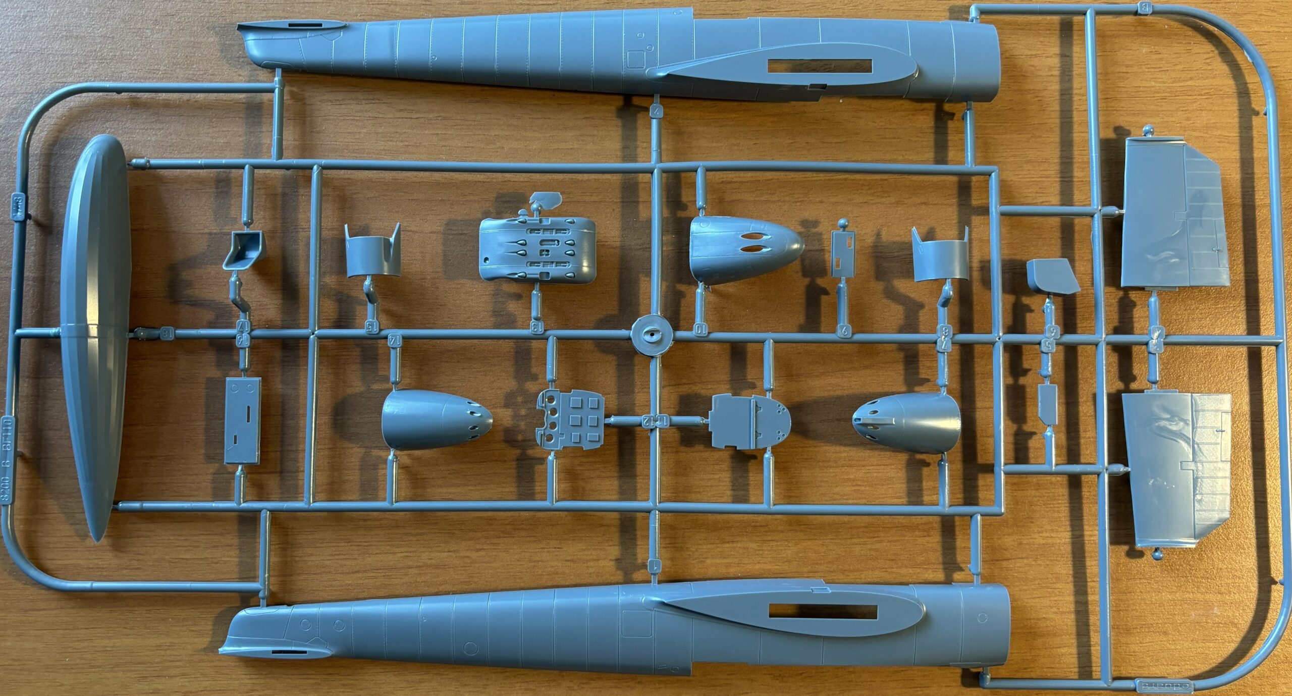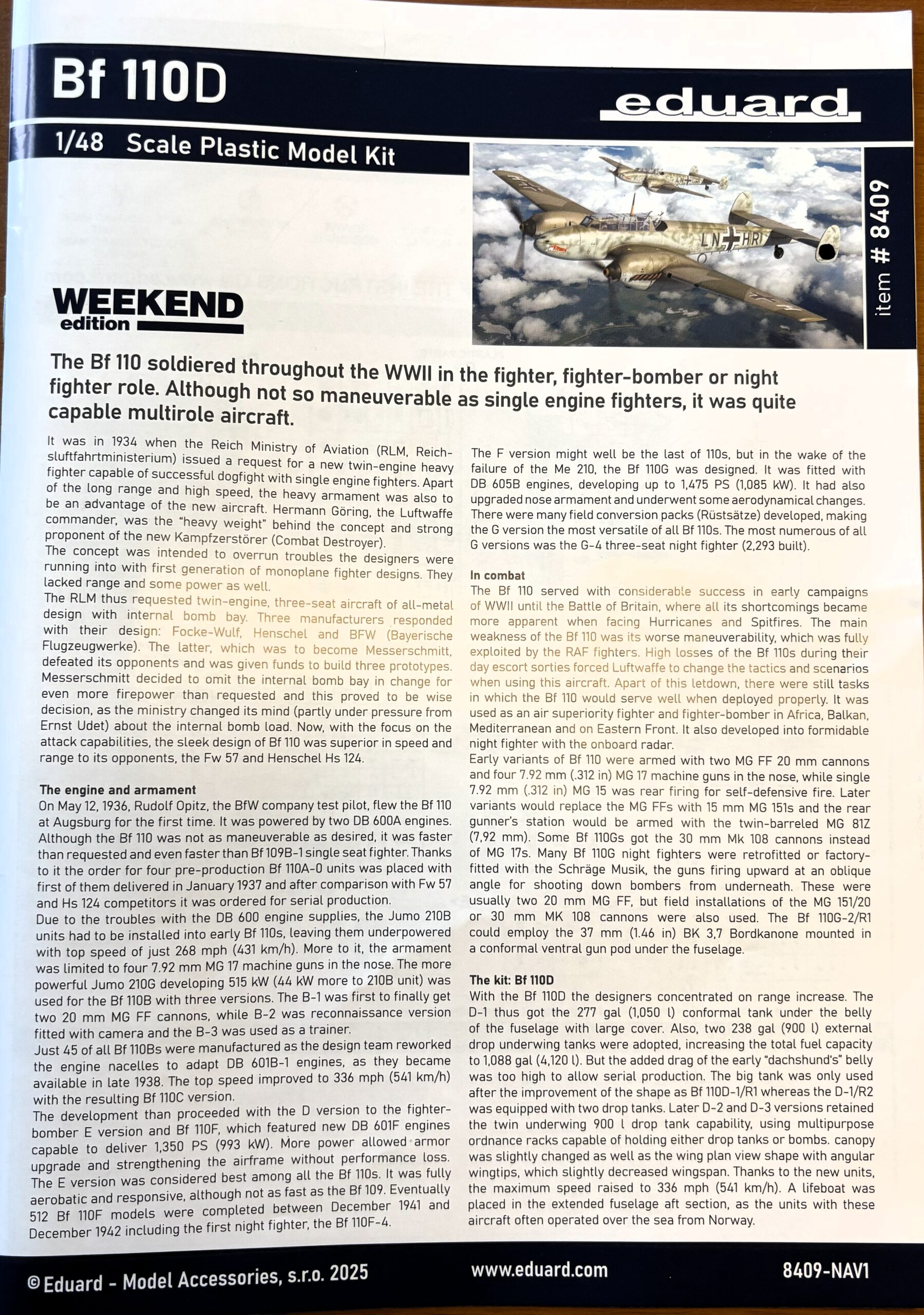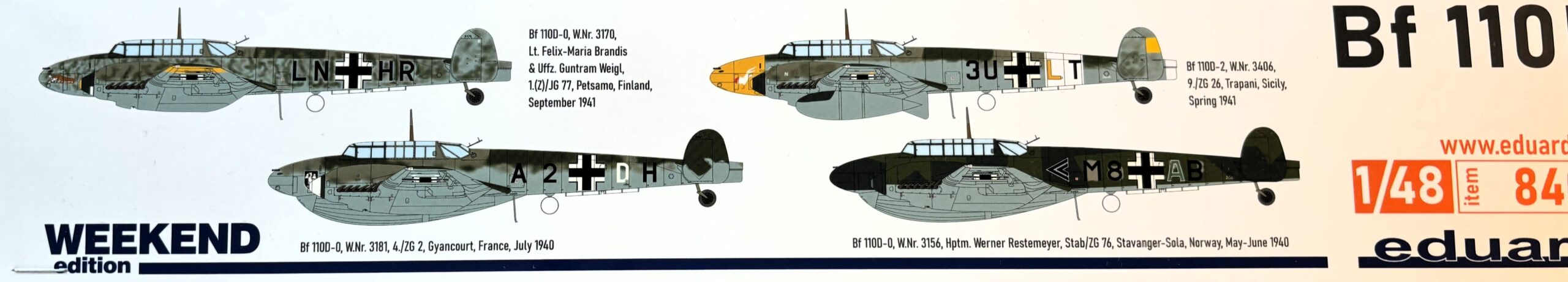 Der Bausatz: Firma Eduard unterscheidet zwischen der Profi- und der Weekendedition eines Bausatzes. Hier liegt die Weekend Edition der Messerschmitt Bf 110D vor. Dies bedeutet, dass keine fotogeätzten Zusatzteile für Armaturen und Sitze beigefügt sind. Der Bausatz wird seit 2007 für verschiedene Bf 110-Versionen aufgelegt. Die Verpackung hat ein sehr schönes Titelbild mit einer Rotte Bf 110D-0 über den Wolken. Der Karton wird von oben geöffnet. Die Plastikteile sind Eduard-typisch sehr gut gearbeitet. Es finden sich Nietenreihen, die so zart gearbeitet sind, dass sie wahrscheinlich unter der Lackierung verschwinden werden.
