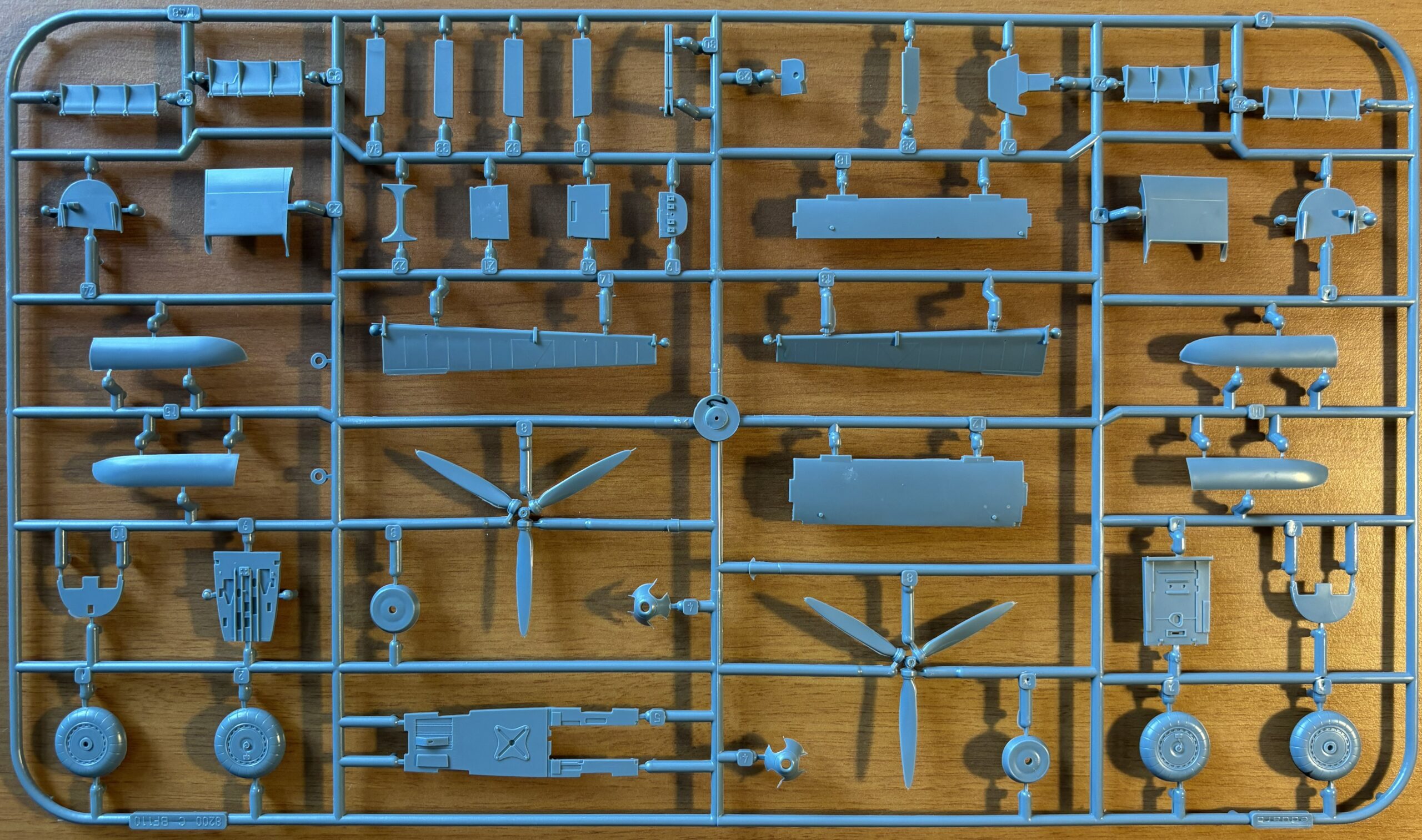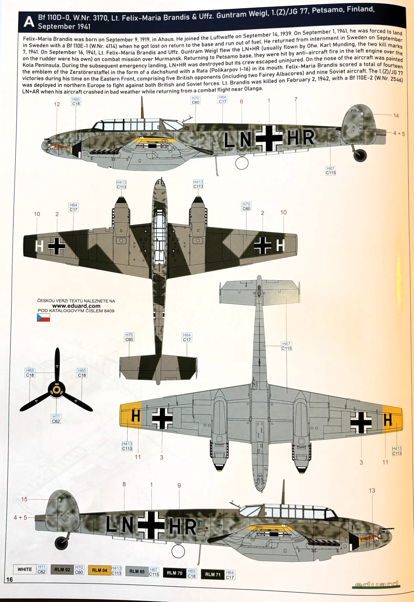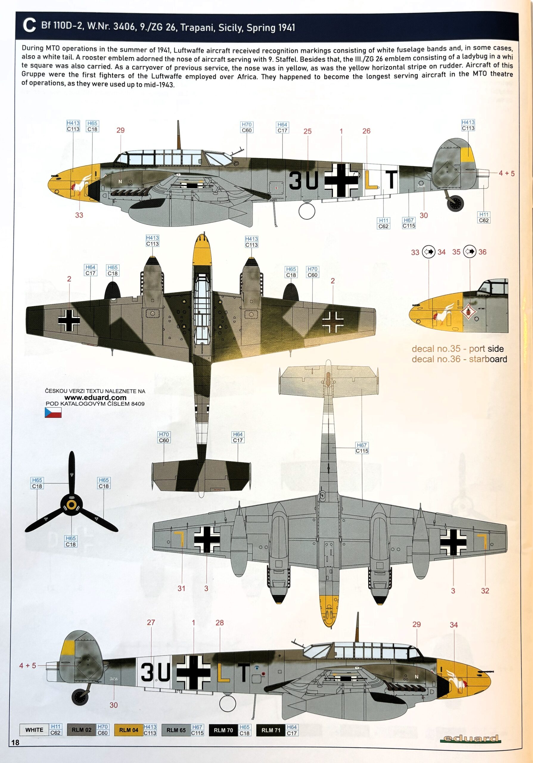 Der Bausatz: Firma Eduard unterscheidet zwischen der Profi- und der Weekendedition eines Bausatzes. Hier liegt die Weekend Edition der Messerschmitt Bf 110D vor. Dies bedeutet, dass keine fotogeätzten Zusatzteile für Armaturen und Sitze beigefügt sind. Der Bausatz wird seit 2007 für verschiedene Bf 110-Versionen aufgelegt. Die Verpackung hat ein sehr schönes Titelbild mit einer Rotte Bf 110D-0 über den Wolken. Der Karton wird von oben geöffnet. Die Plastikteile sind Eduard-typisch sehr gut gearbeitet. Es finden sich Nietenreihen, die so zart gearbeitet sind, dass sie wahrscheinlich unter der Lackierung verschwinden werden.