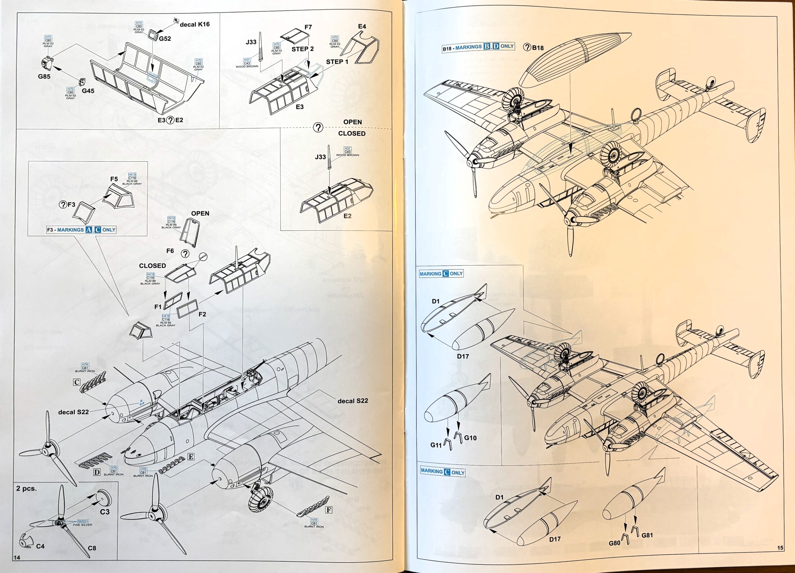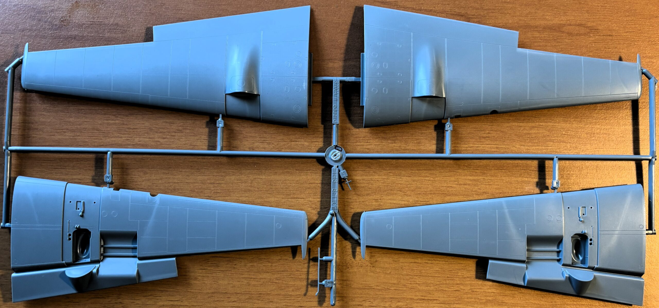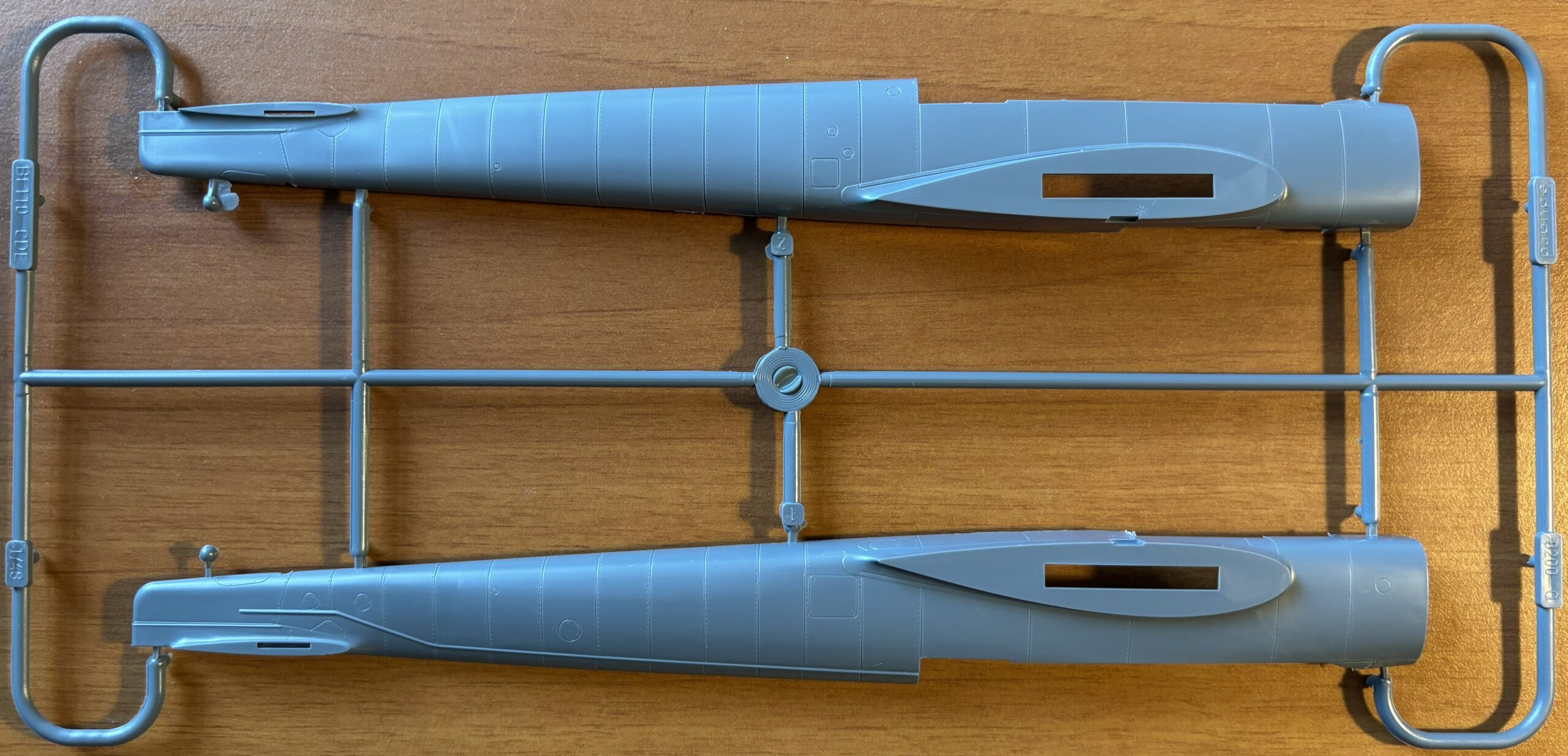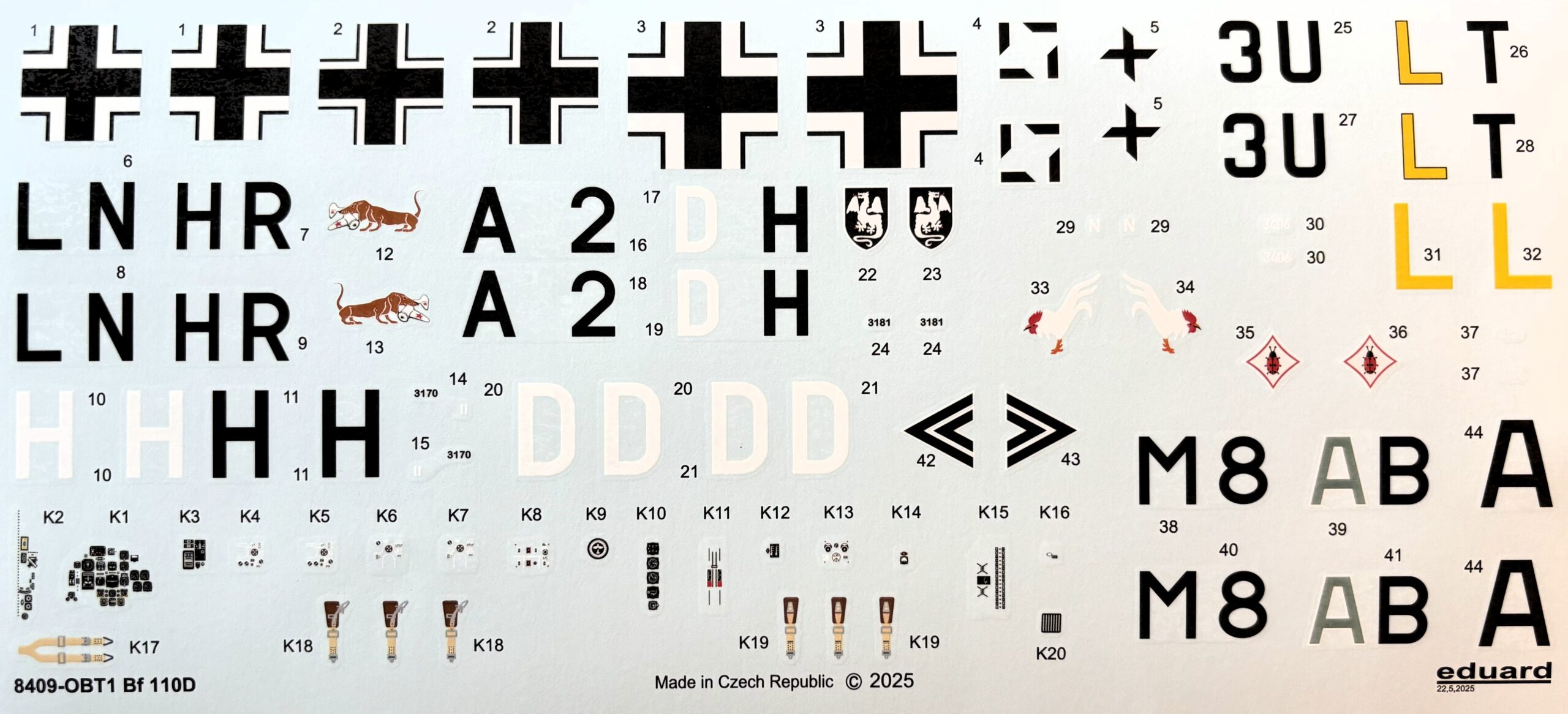 Der Bausatz: Firma Eduard unterscheidet zwischen der Profi- und der Weekendedition eines Bausatzes. Hier liegt die Weekend Edition der Messerschmitt Bf 110D vor. Dies bedeutet, dass keine fotogeätzten Zusatzteile für Armaturen und Sitze beigefügt sind. Der Bausatz wird seit 2007 für verschiedene Bf 110-Versionen aufgelegt. Die Verpackung hat ein sehr schönes Titelbild mit einer Rotte Bf 110D-0 über den Wolken. Der Karton wird von oben geöffnet. Die Plastikteile sind Eduard-typisch sehr gut gearbeitet. Es finden sich Nietenreihen, die so zart gearbeitet sind, dass sie wahrscheinlich unter der Lackierung verschwinden werden.