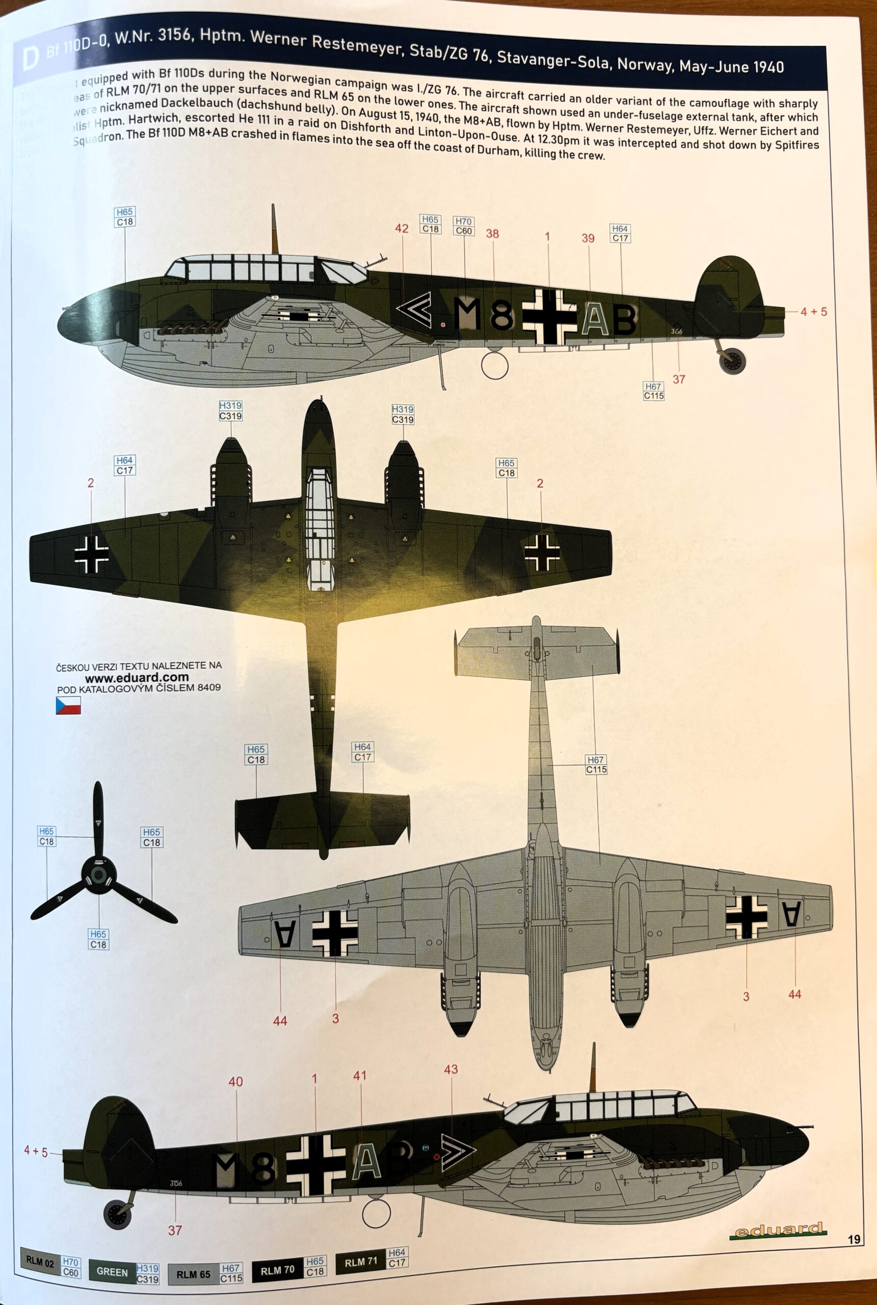 Das Vorbild: Die Messerschmitt Bf 110 war ein schweres, zweimotoriges Jagdflugzeug. Sie sollte gegnerische Bomber abfangen, eigenständig operieren und hohe Reichweiten abdecken. Die ersten Serienmodelle – Bf 110 B und C – kamen ab 1938/39 in die Luftwaffe und wurden rasch weiterentwickelt. Die Entwicklung der D-Serie war auf größere Reichweiten und Zusatzlasten ausgelegt. Die Langstreckenvarianten Bf 110 D-0 und Bf 110 D-2 waren für Fernaufklärungs- und Begleiteinsätzen besonders ausgerüstet. Ein Merkmal dieser Maschinen war der sogenannte „Dackelbauch“ – ein charakteristischer Zusatztank, der das Flugzeug optisch wie technisch prägte. Alternativ war das Flugzeug mit Zusatztanks ausgerüstet.