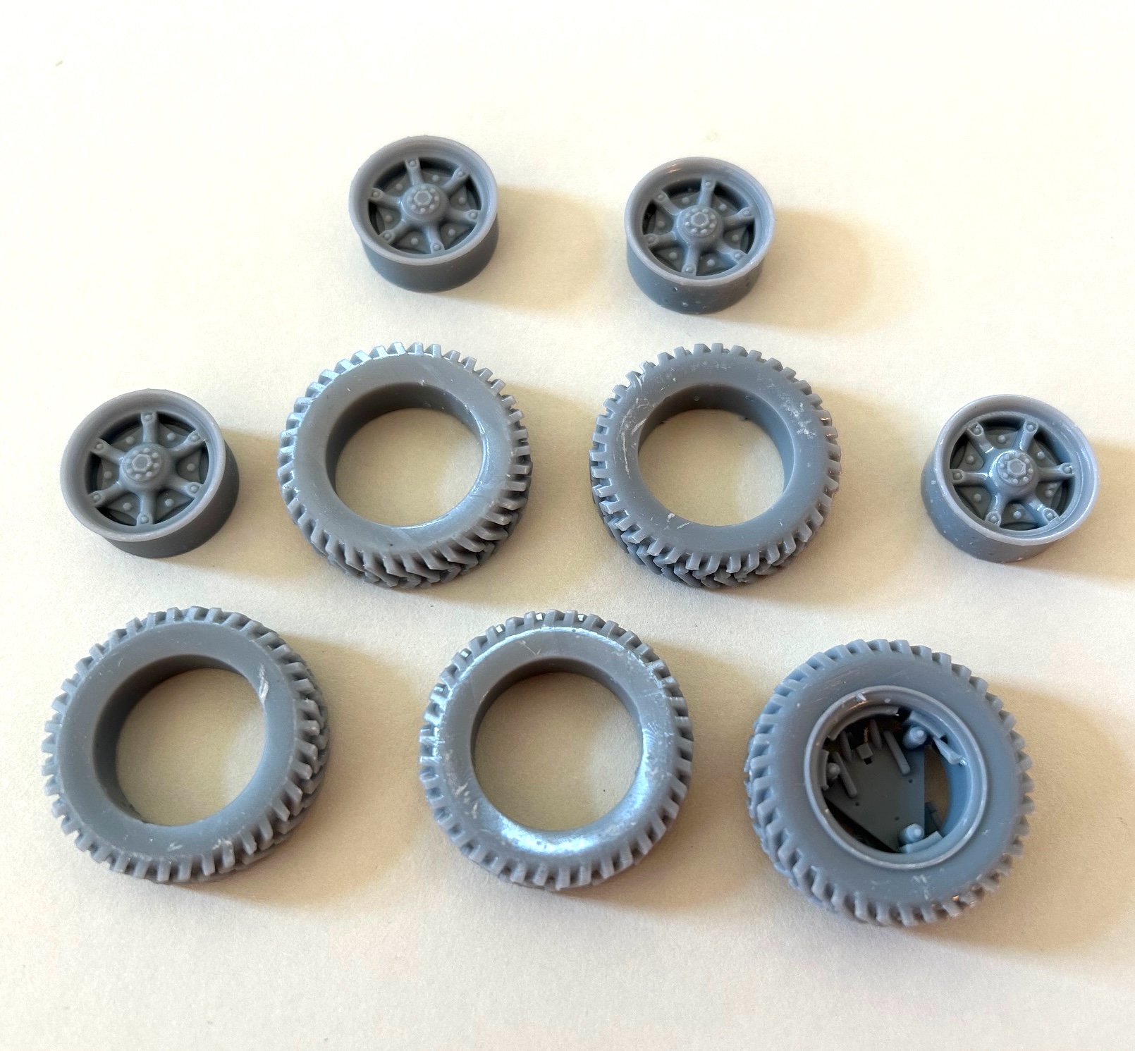 Das 8mm Breda MG inklusive Halterung ist hervorragend gestaltet und zeigt in beeindruckender Qualität alle Details vom Original. Bei den Rädern sind die Felgen und Reifen separat ausgeführt, was die Bemalung sicherlich erleichtert, wobei die Felgen problemlos in die Reifen eingeführt werden können. Beim Reifenprofil ist mir allerdings aufgefallen, dass dieses sehr prominent ausgeführt ist und mit keinem der in der Literatur genanten Versionen übereinstimmt. Ich habe dies bereits an den Hersteller zurück gemeldet und gemäß der Antwort darauf soll es dazu noch eine Korrektur geben. Eventuell werden sogar die Reifensätze Artiglio und Sigillo Verde als Alternativen enthalten sein.