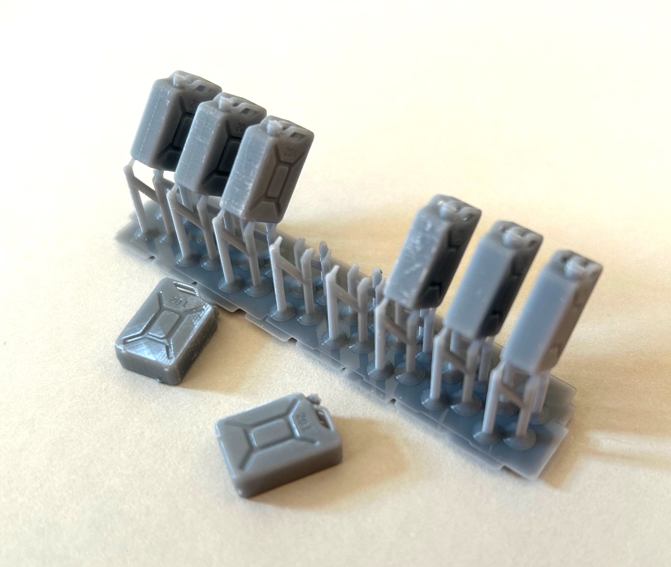 Auf den anderen Teileträgern sind die Sitze, sowie Details für den Fahrerbereich wie Lenkrad und Schaltungen sowie die komplette Vorderachse zu finden. Zusätzlich gibt es noch diverse italienische Benzinkanister, die in entsprechenden wunderschön gestalteten Halterungen vorne auf den Kotflügeln am Fahrzeug und an anderen Stellen zu verstauen sind.